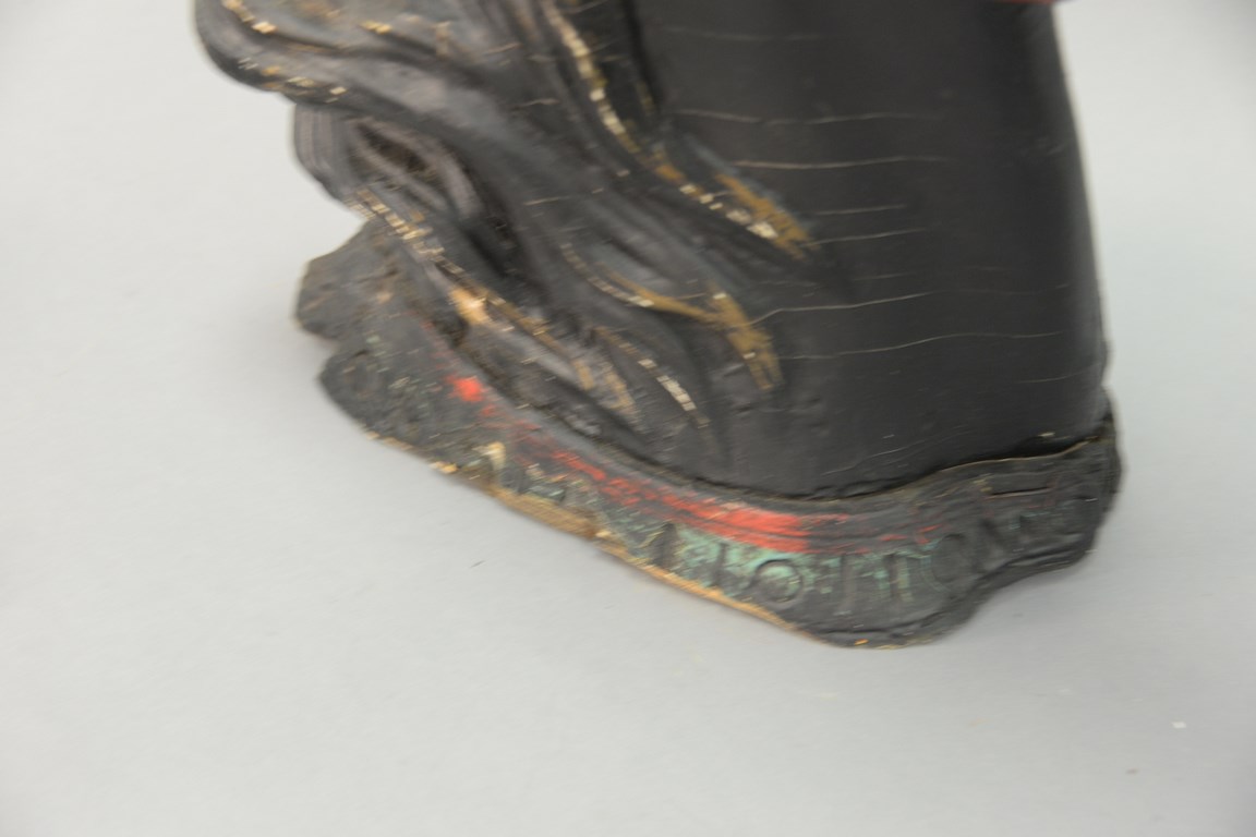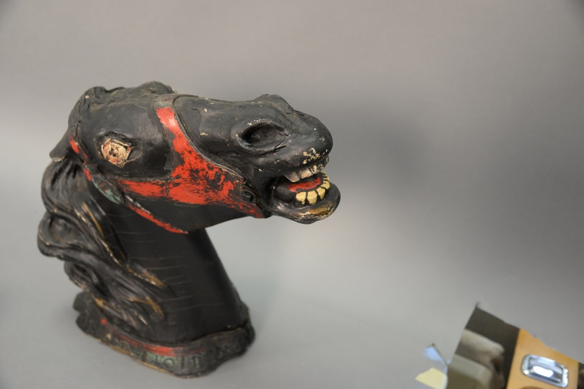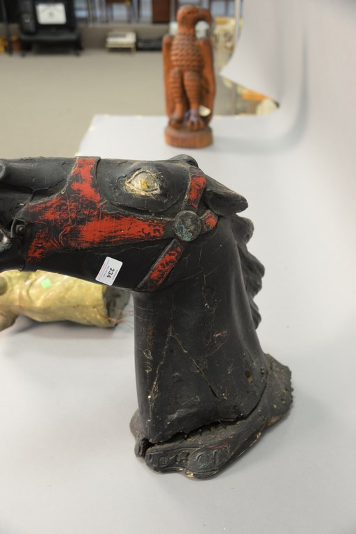 Lot 234: Carved wood painted horse head, black and red, possibly used as a carousel decoration or trade sign. lg. 21 in.