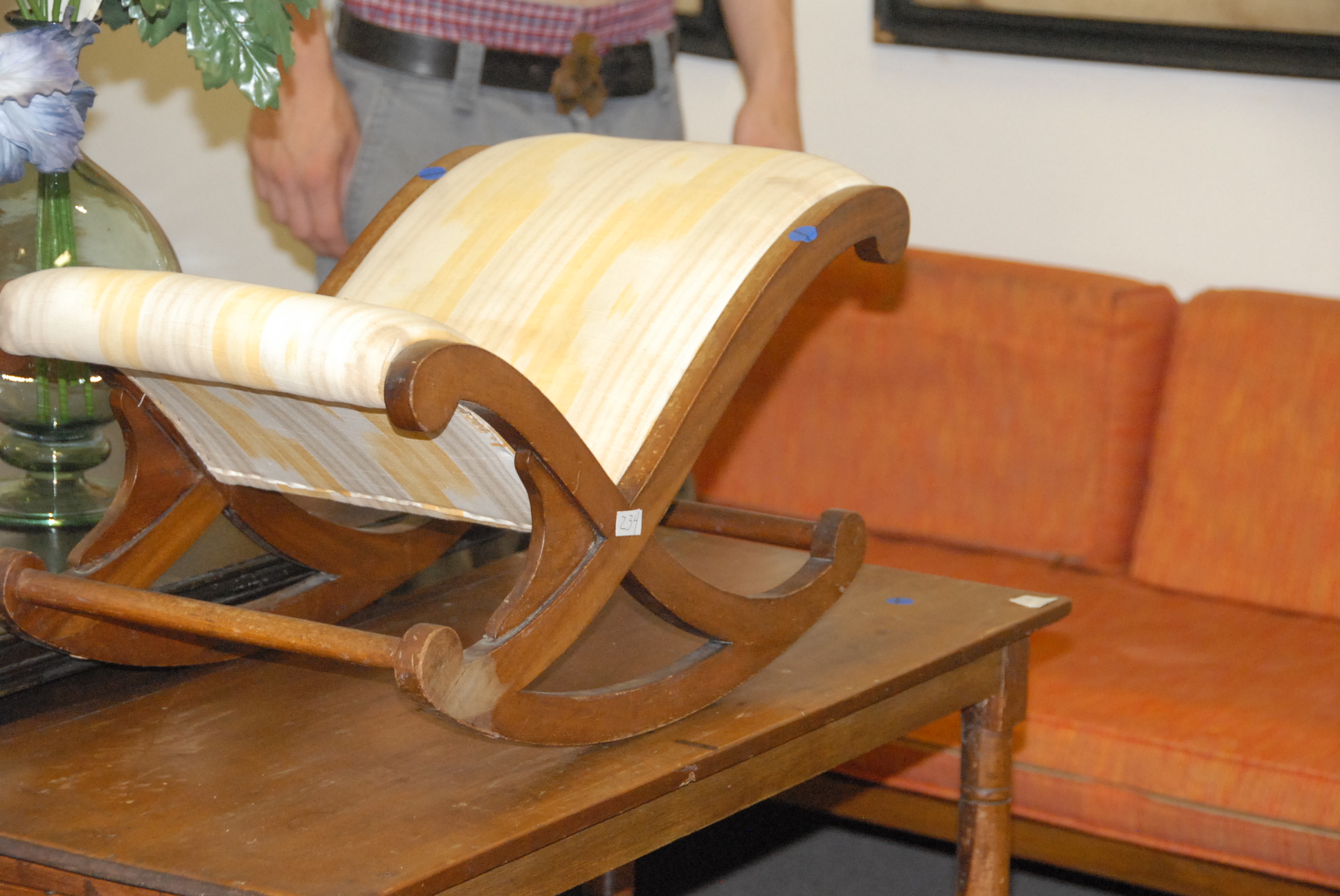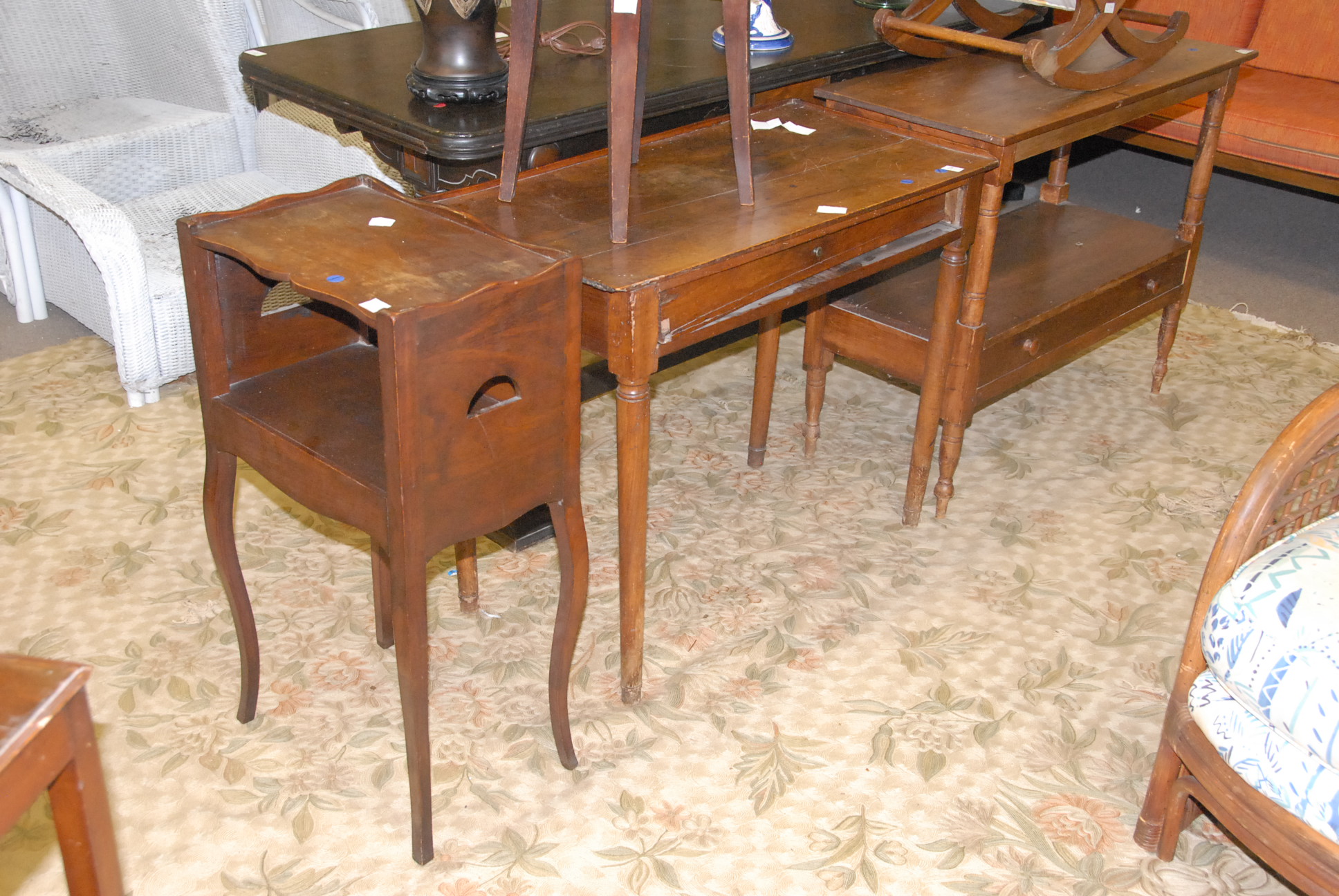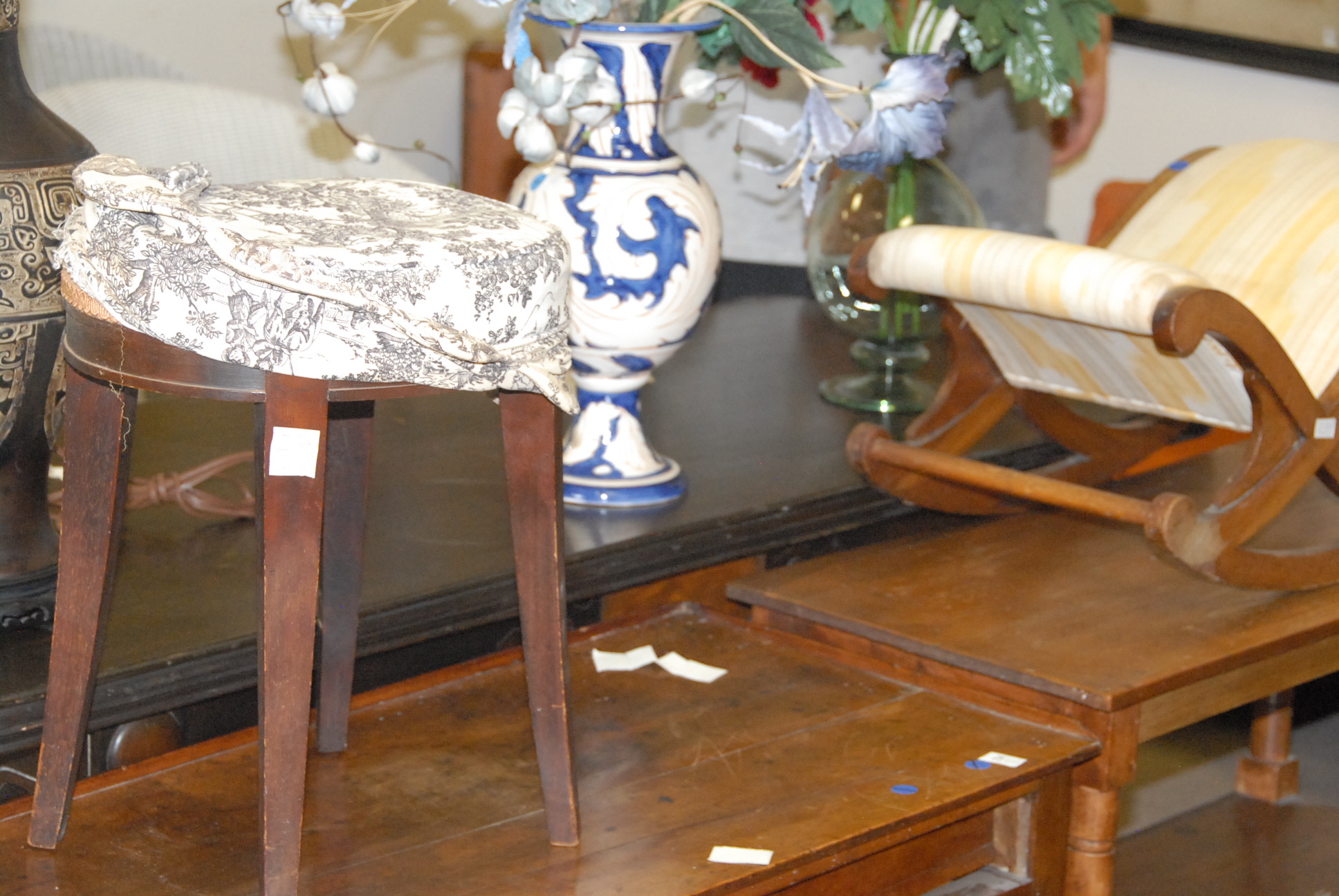 Five piece lot to include a bench , foot rest, French style table, and two tables.
