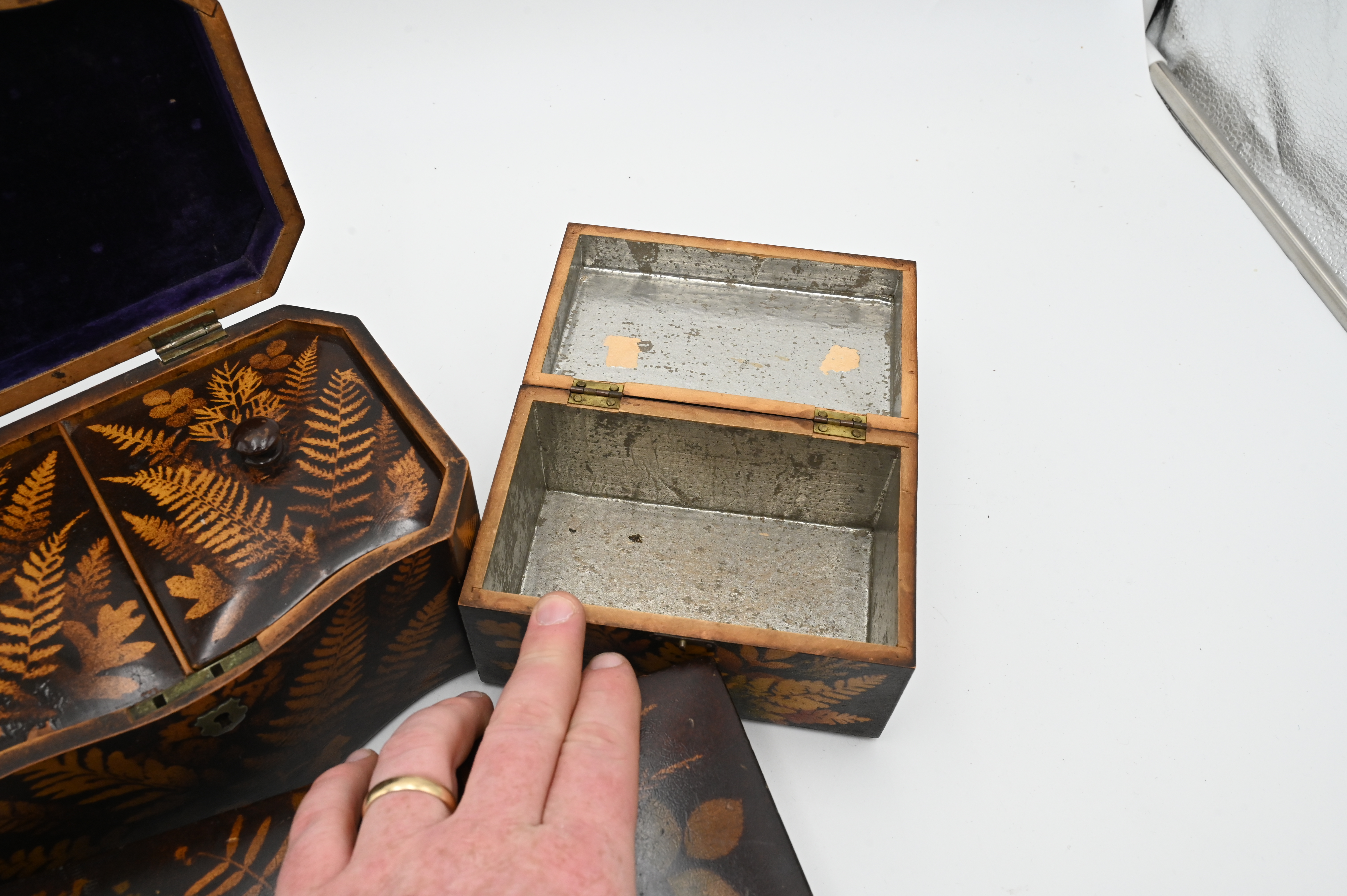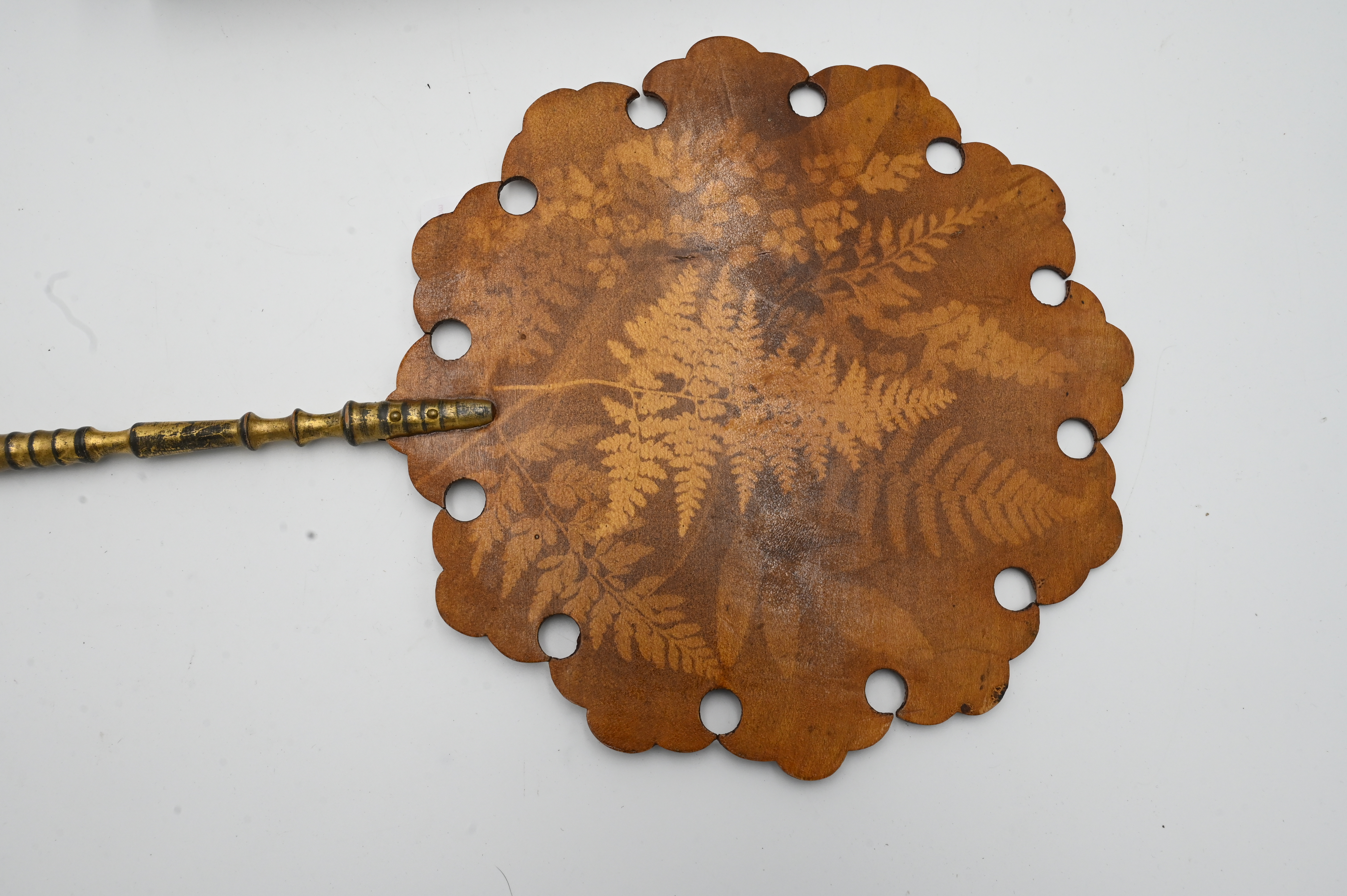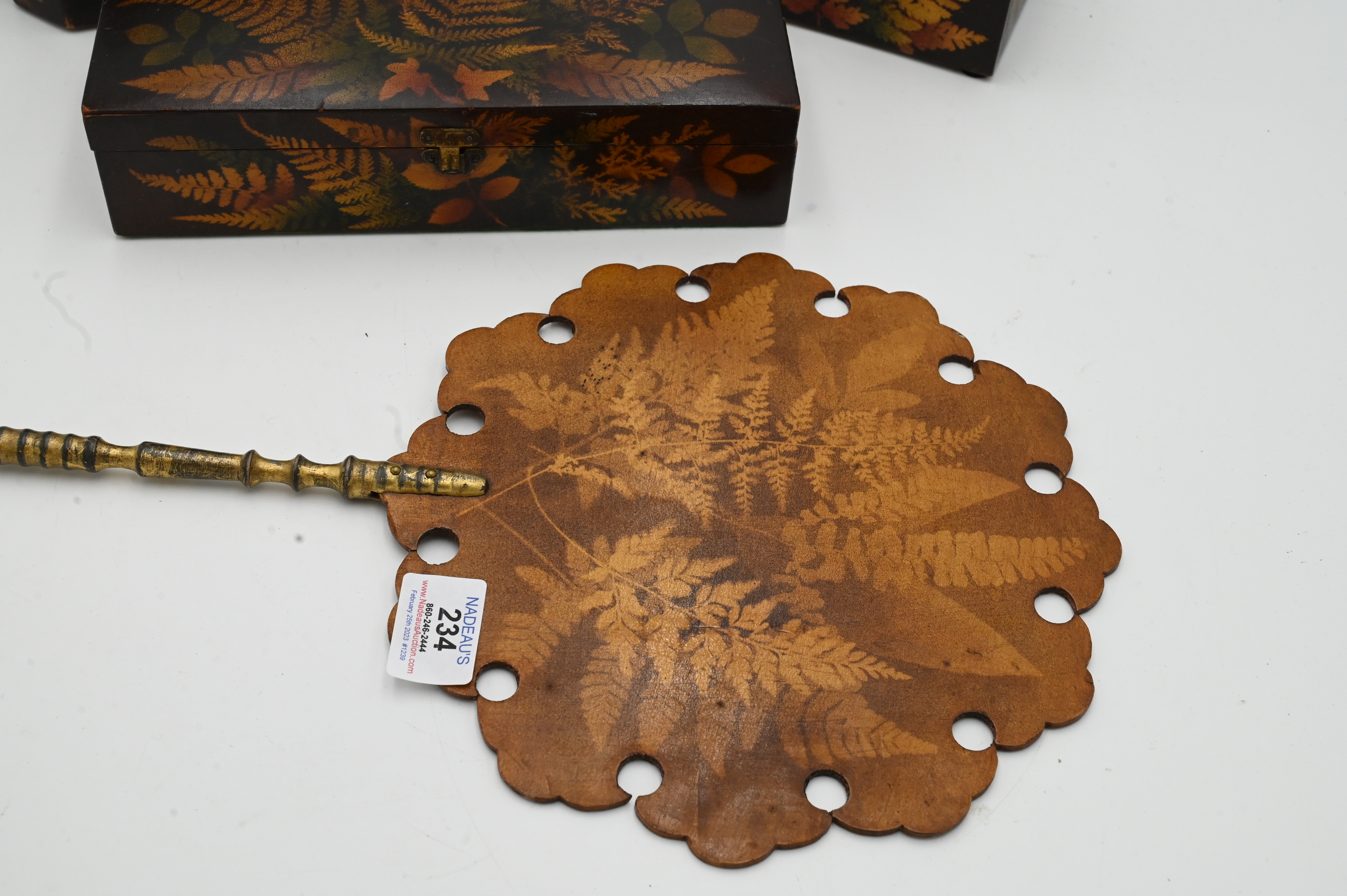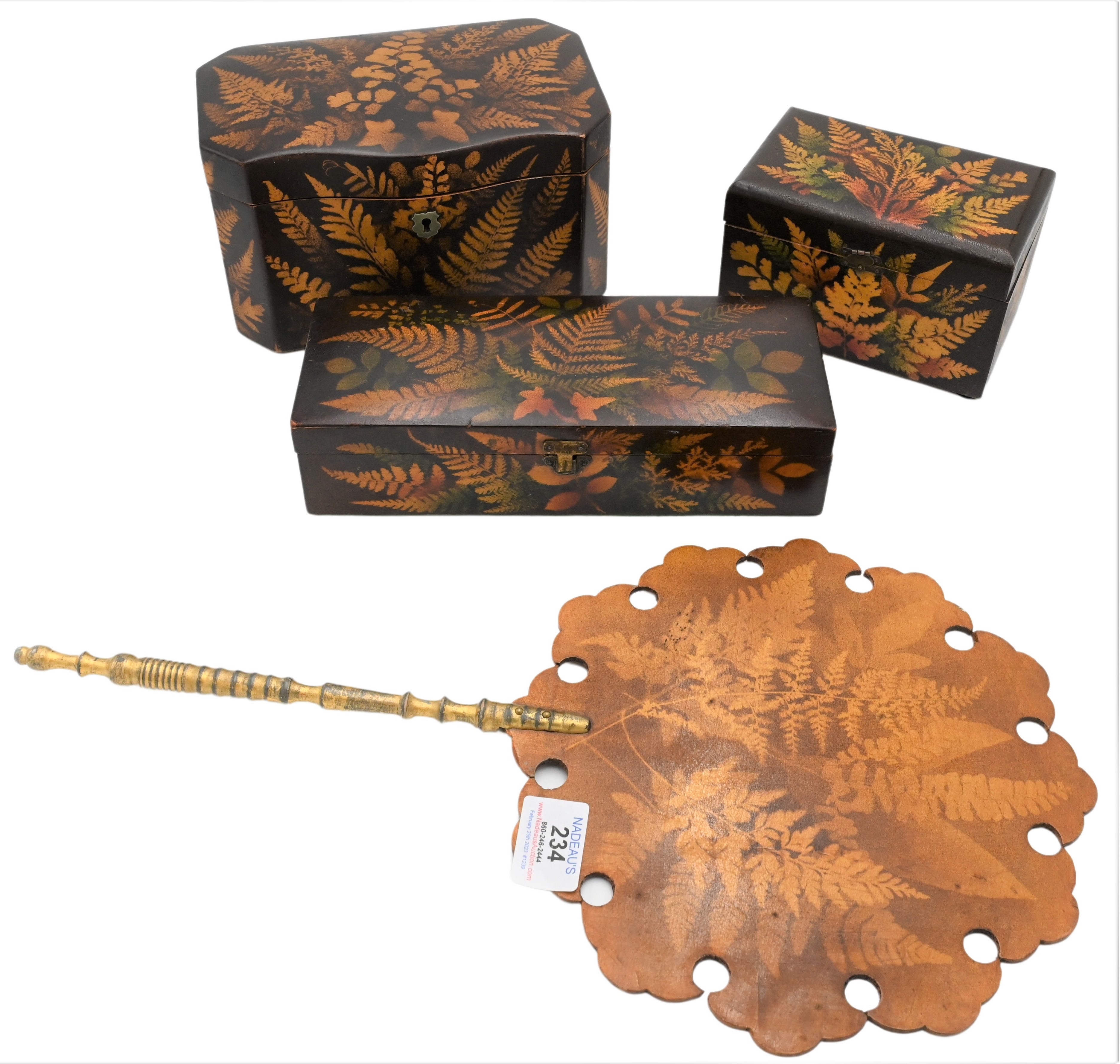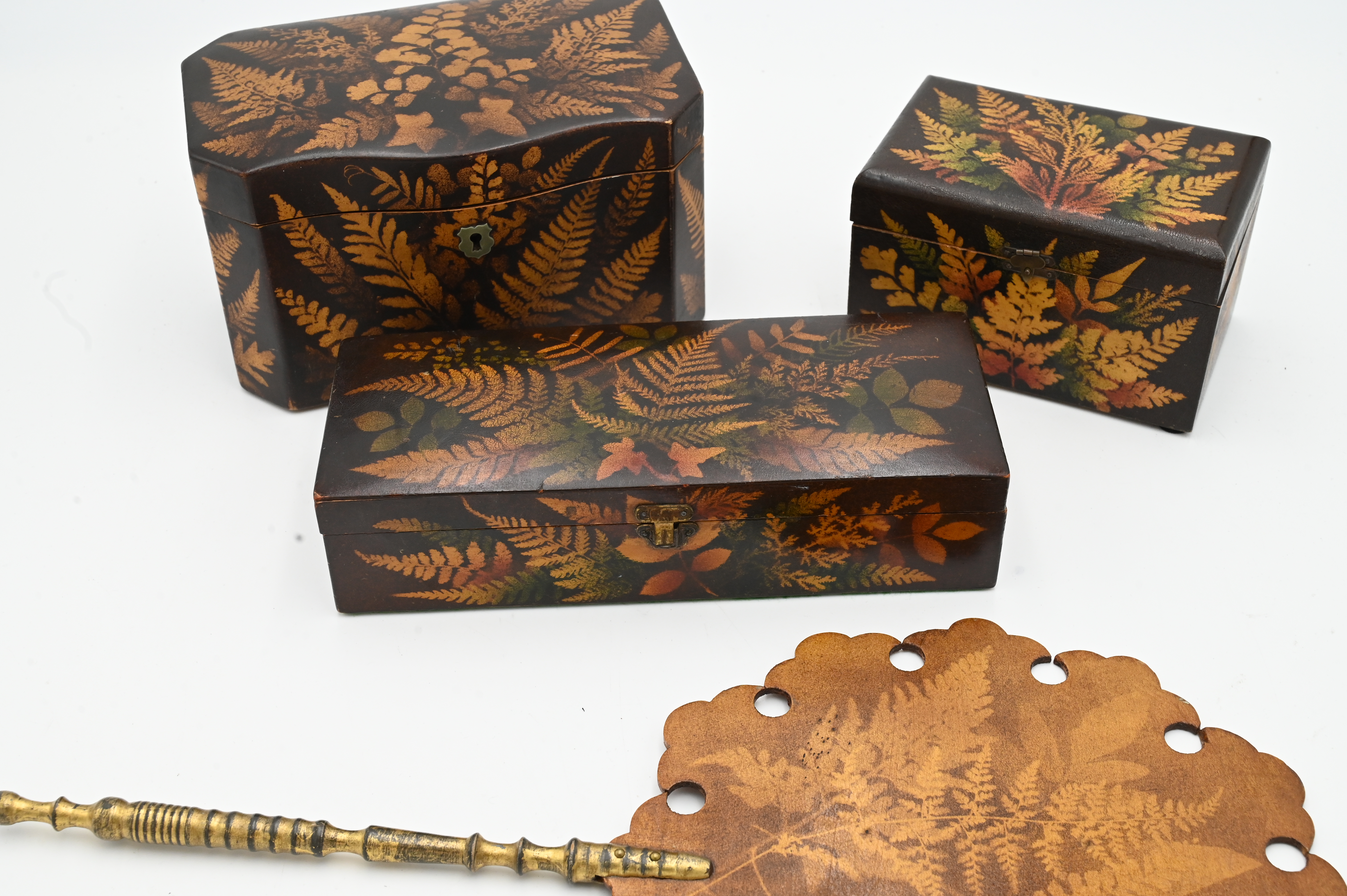 Four Fernware Pieces, to include two tea boxes, a glove box along with a circular fan on gilt handle, longest 17 inches.