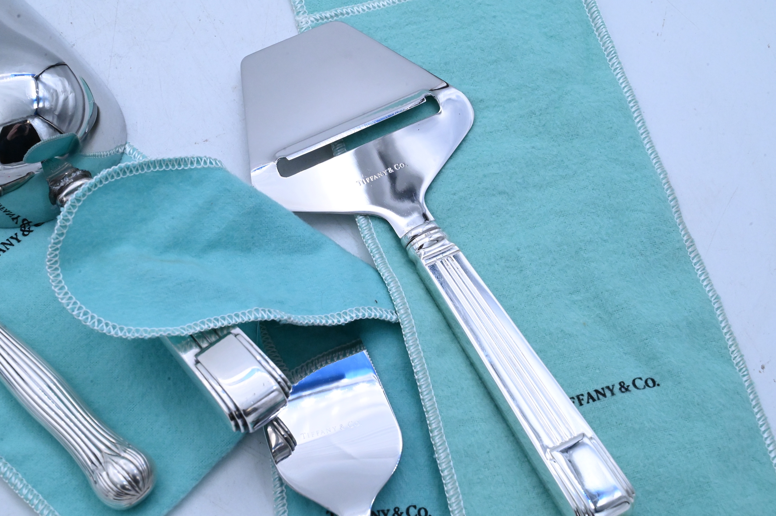 Including a pair of sterling silver Botanical pattern cheese knife and spreader,together with a Century scoop and cheese slicer, along with three Tiffany & Co. felt storage sleeves.