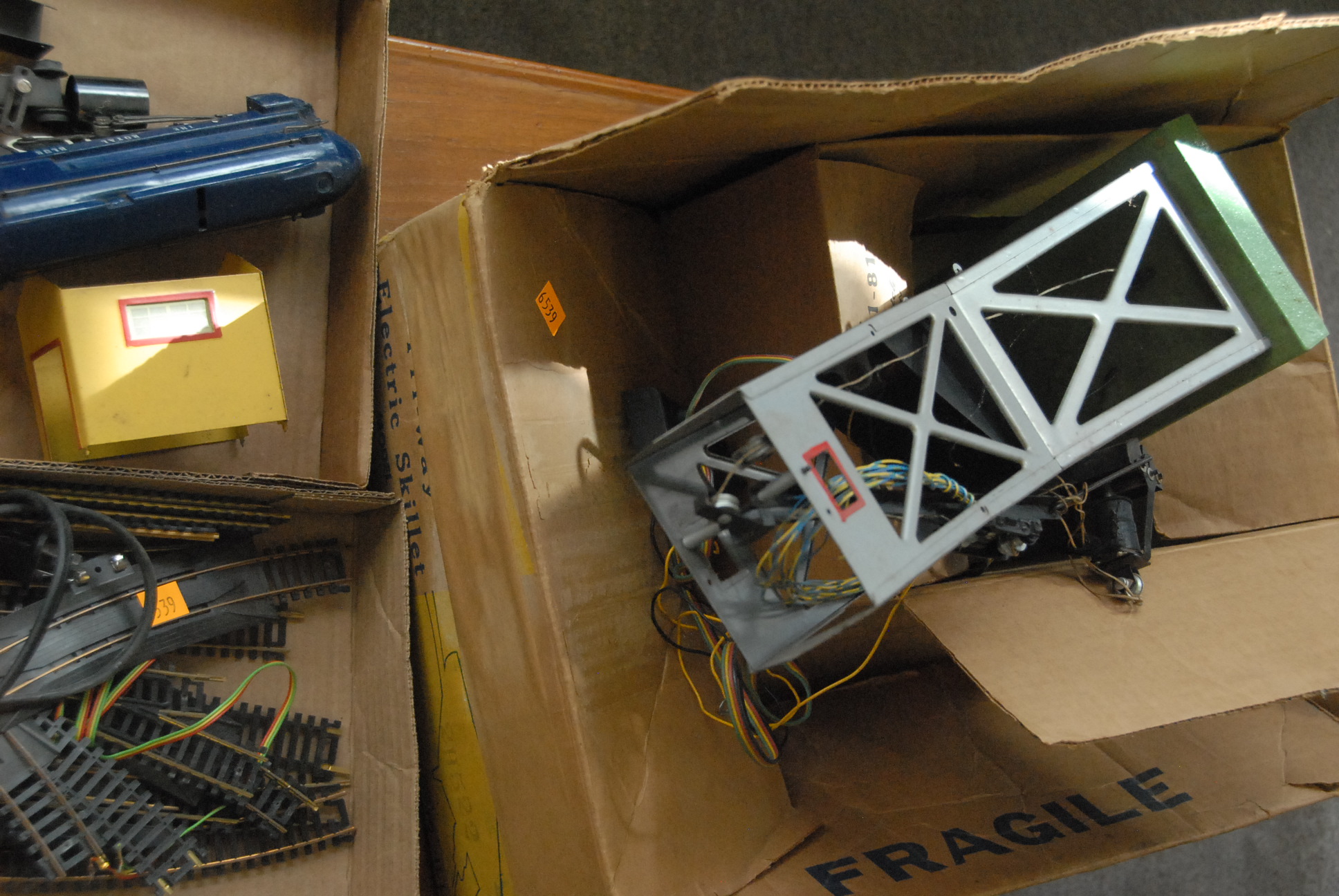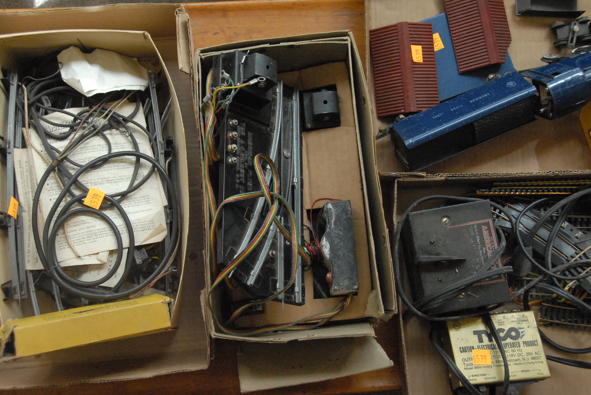 Gilbert American Flyer cars, engine, track, transformer, and accessories.
