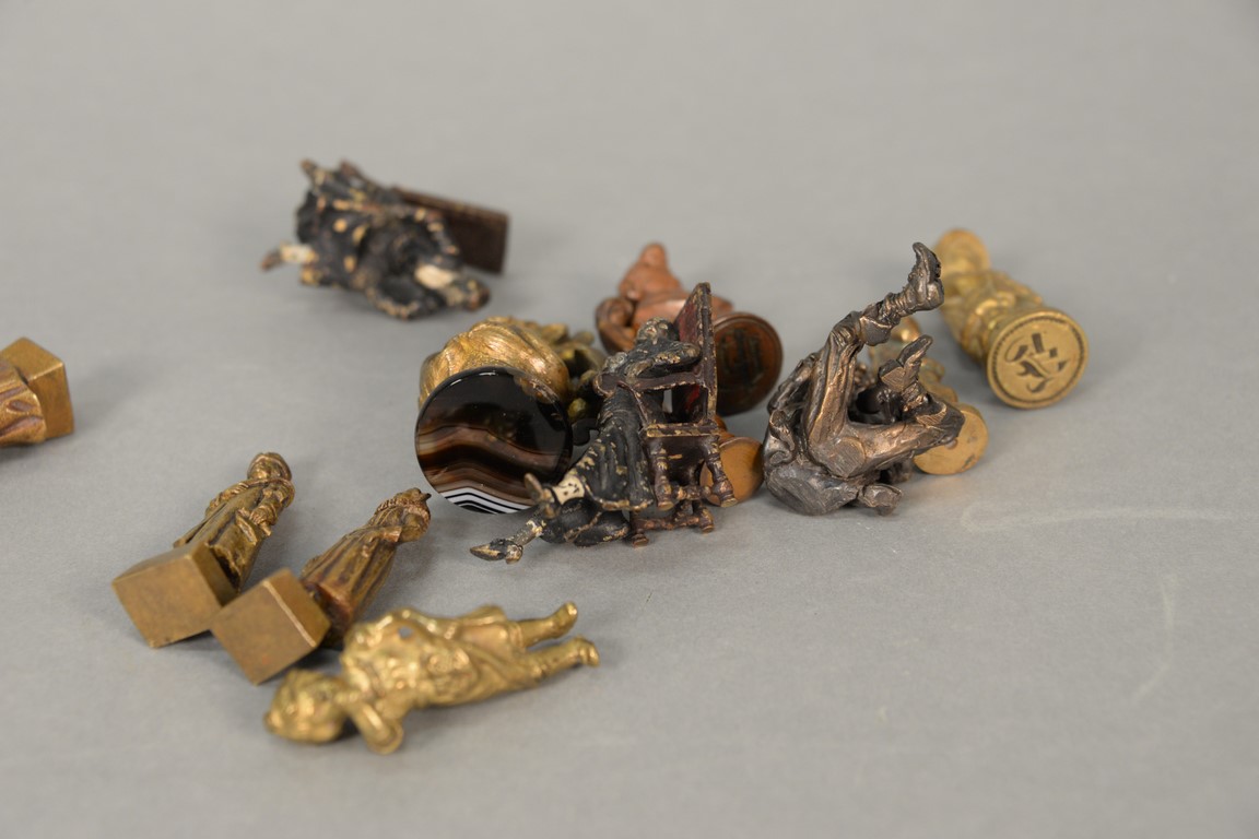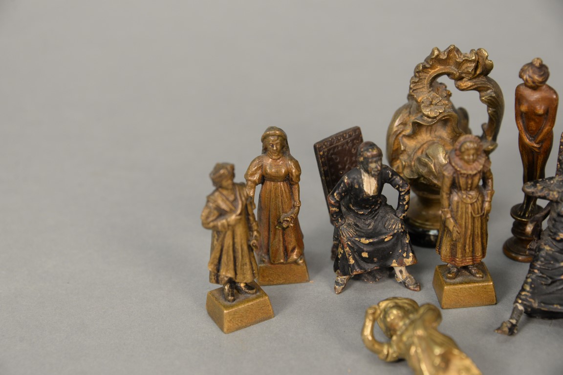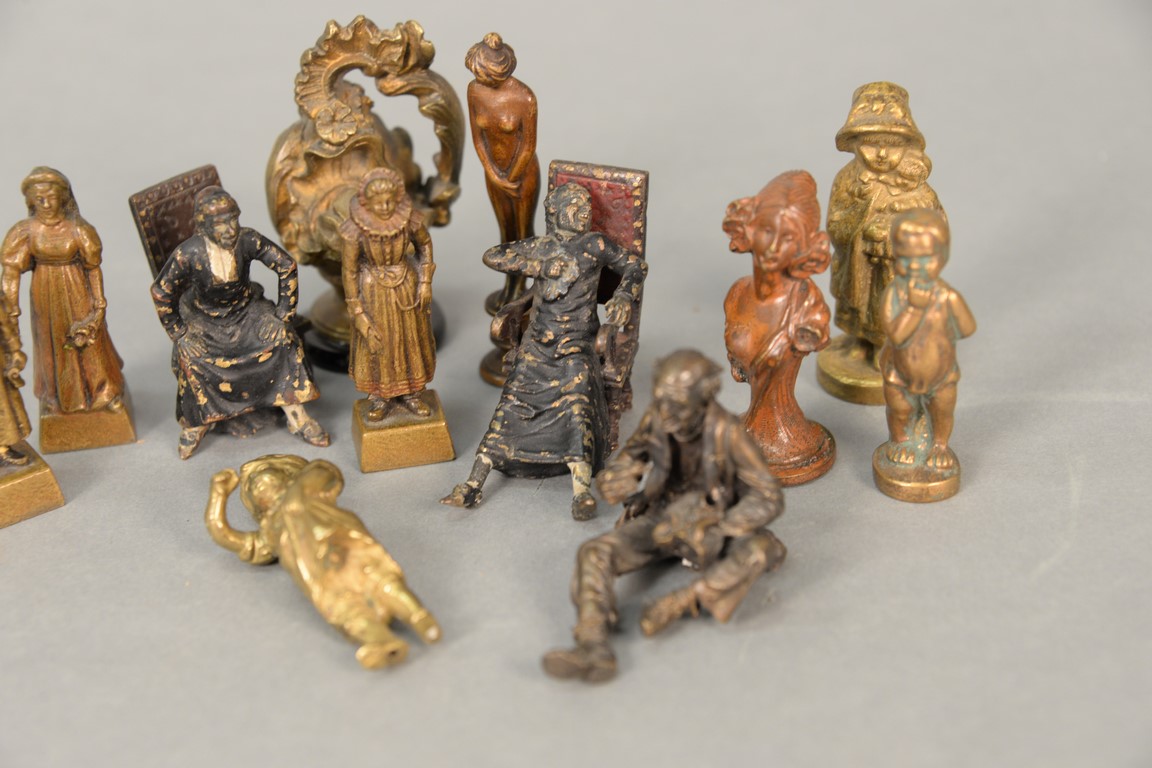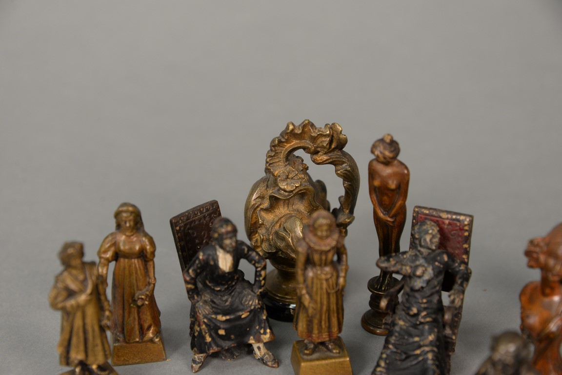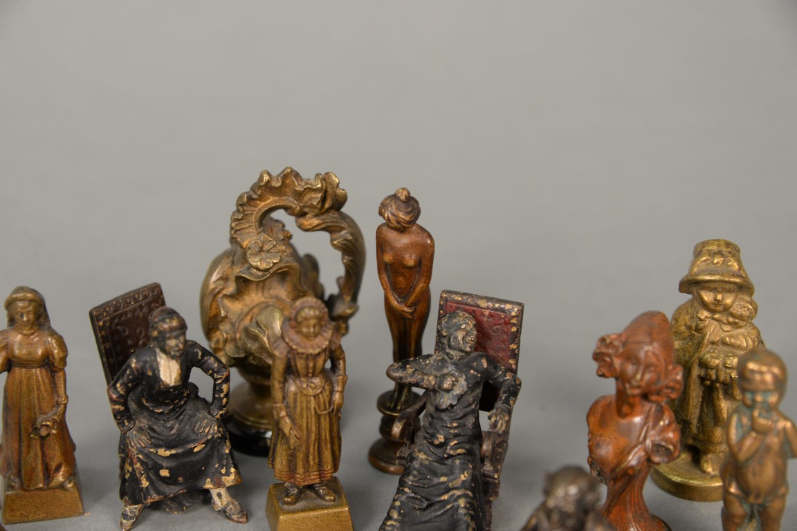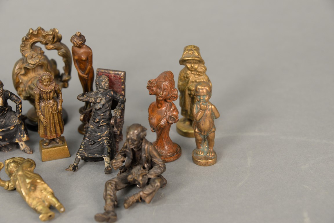 Lot 234: Group of twelve miniature bronzes to include five wax seals, cold painted man sitting in chair and woman sitting in a chair, three V…