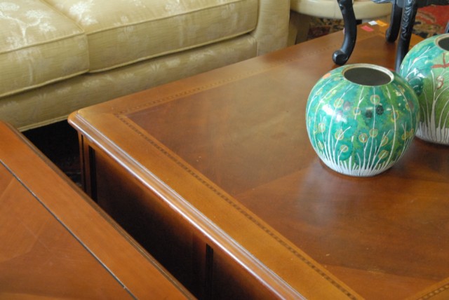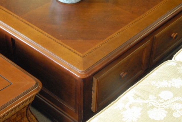 Inlaid mahogany coffee table with a drawer inside, marked Hammary.