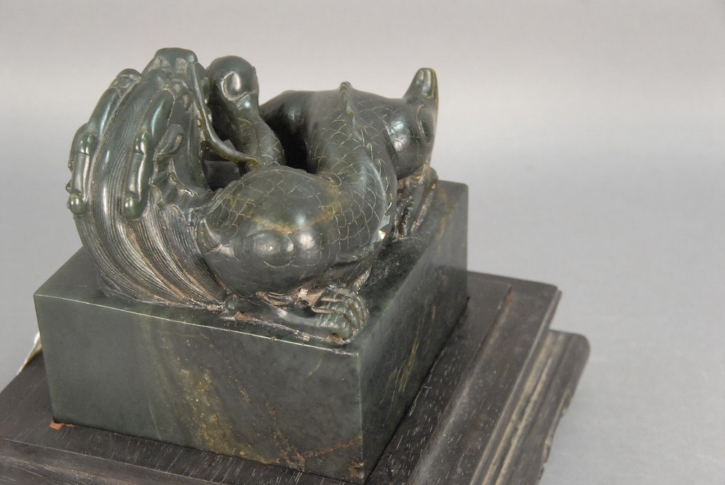 Lot 234: Large spinach green jade foo dog seal, yong zheng yu jia zhi bao , having carved foo dog on top, with large carved wood base, seal…