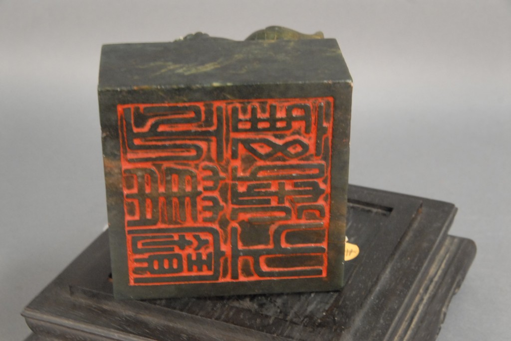 Large spinach green jade foo dog seal, yong zheng yu jia zhi bao , having carved foo dog on top, with large carved wood base, seal ht. 4 1/2, wd. 4 3/8.