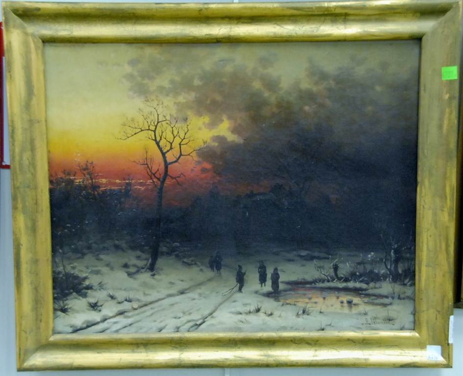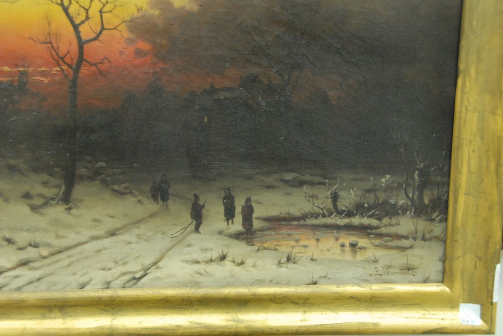 Lot 234: Ludvig Munthe 1841-1896 SNOWY SUNSET LANDSCAPE oil on canvas signed lower right L. Munthe 16 x 20