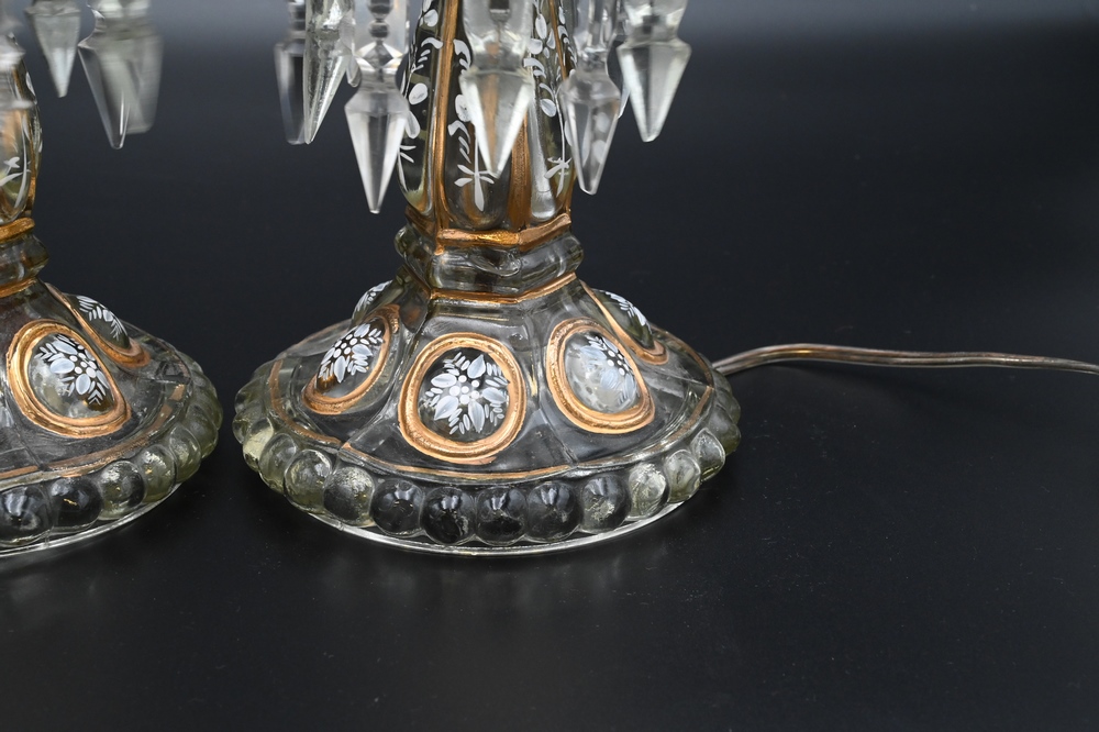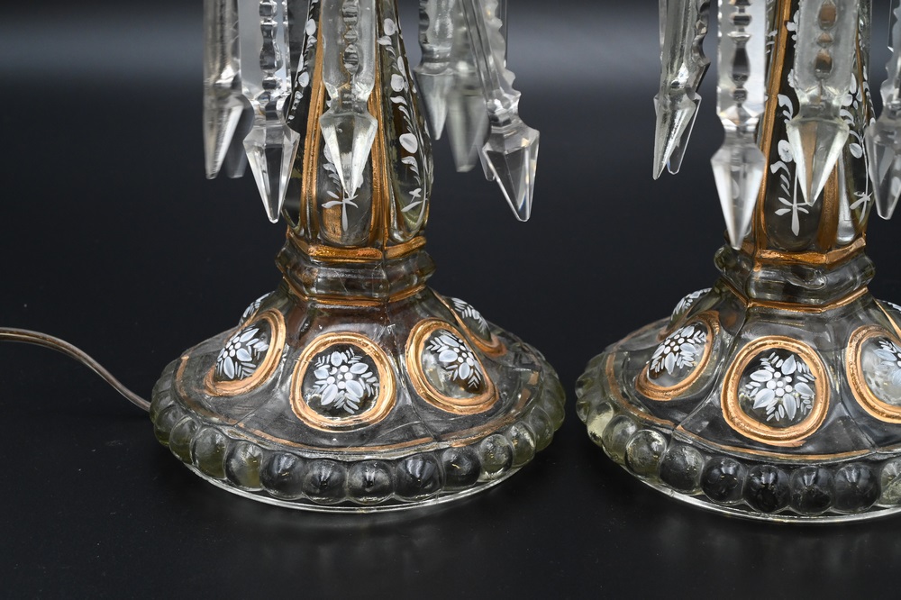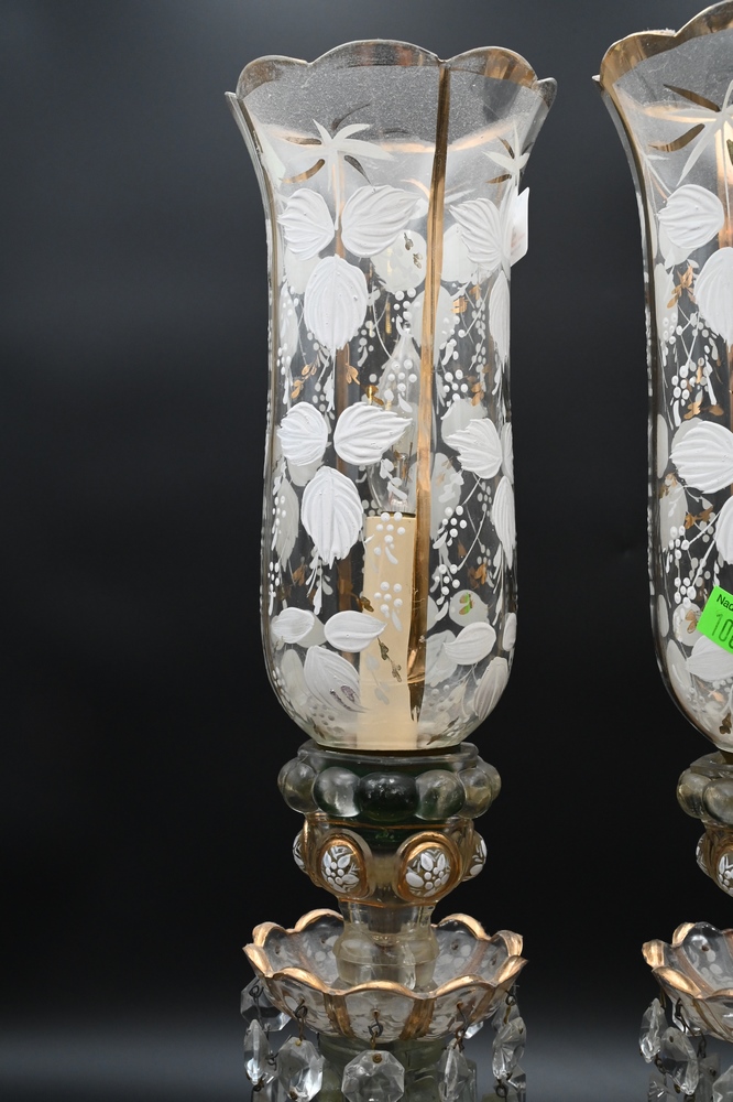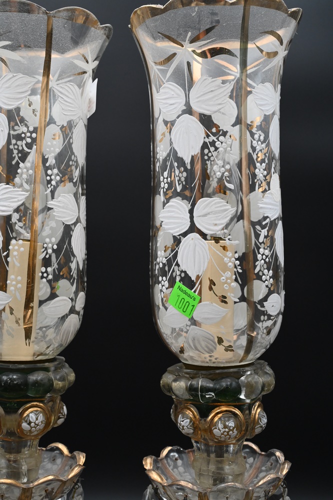Pair of Hurricane Lamps, having enamel decoration, attributed to Baccarat, height 21 1/2 inches, Provenance: Estate of James Dana English of New Haven to benefit the New Haven Museum.