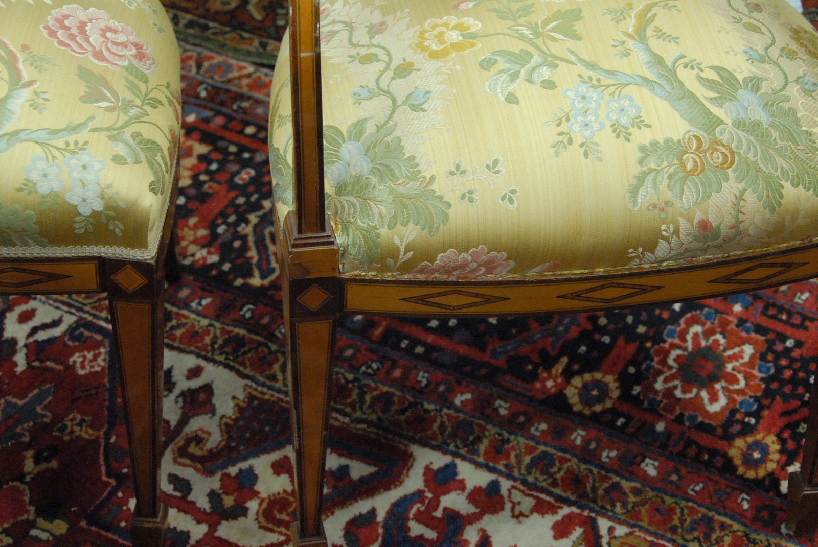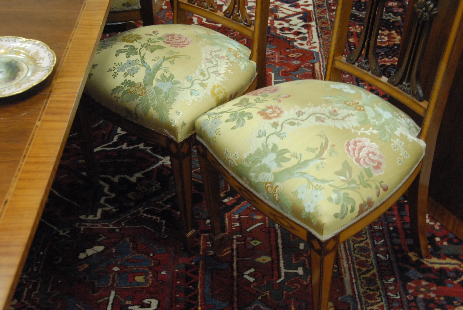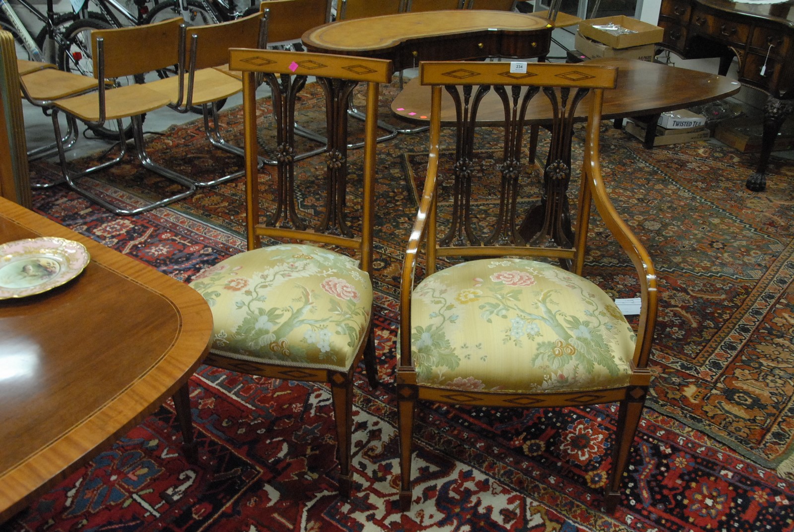 Lot 234: Set of ten satinwood and mahogany dining chairs, each with carved backs and silk upholstered seats on inlaid frames with square tapered legs ending in spade feet, two armchairs and eight side chairs, six chair backs having darker stain.