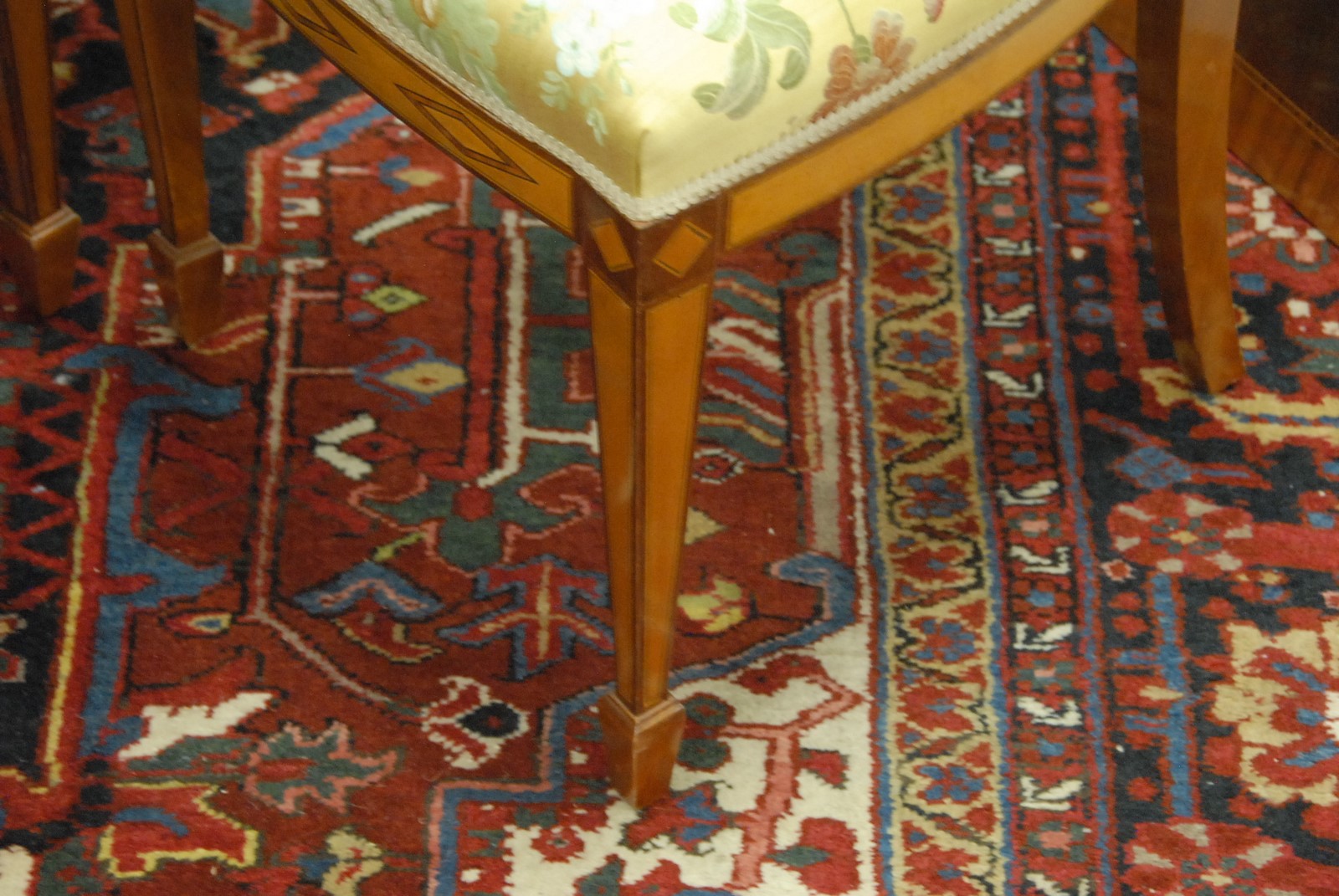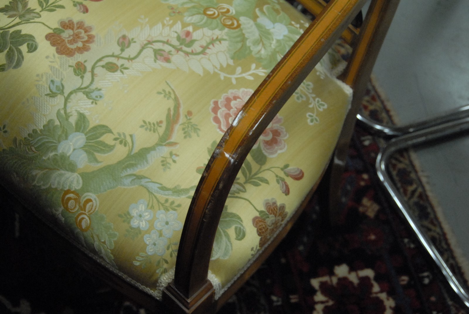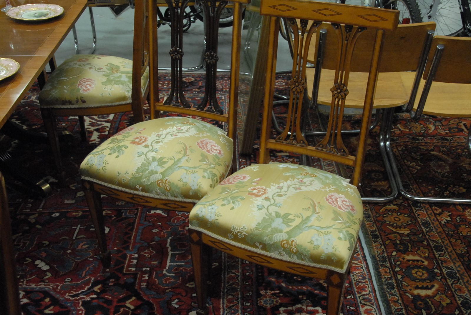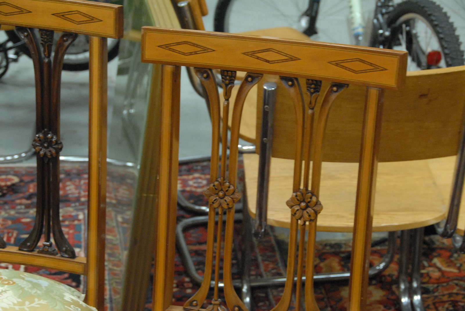 Lot 234: Set of ten satinwood and mahogany dining chairs, each with carved backs and silk upholstered seats on inlaid frames with square tapered legs ending in spade feet, two armchairs and eight side chairs, six chair backs having darker stain.