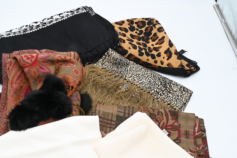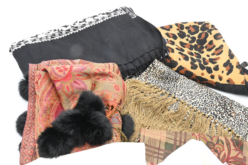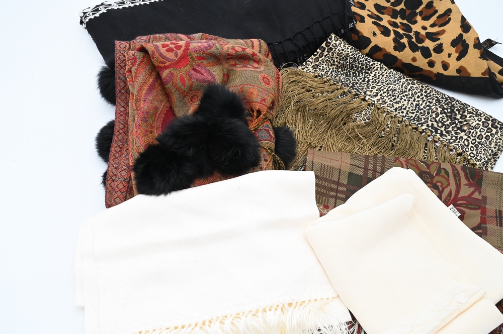 Lot 234: Seven Piece Group of Shawls, to include a paisley with fur ends, black and white, Adana silk, along with Yves Saint Laurent.