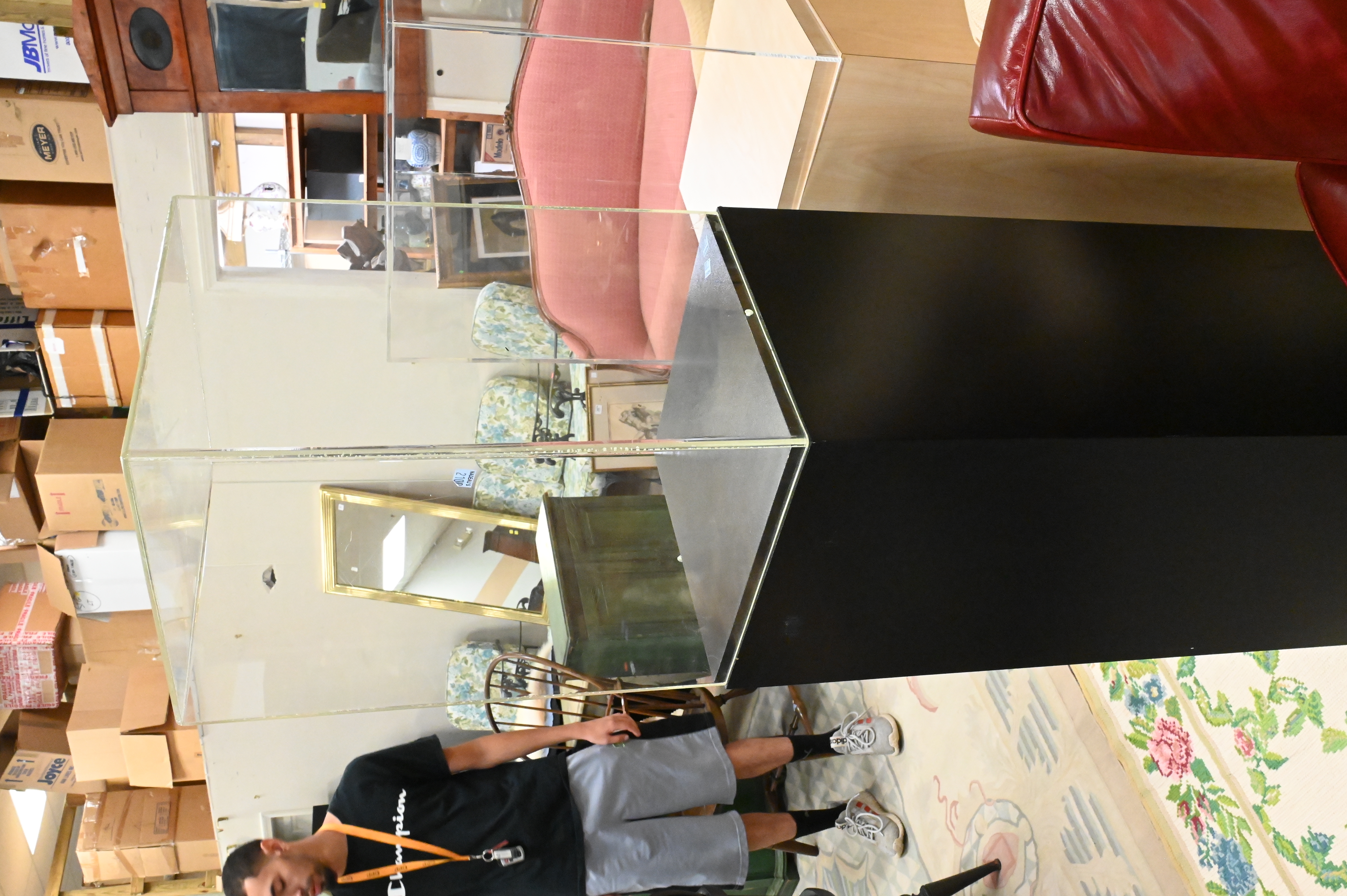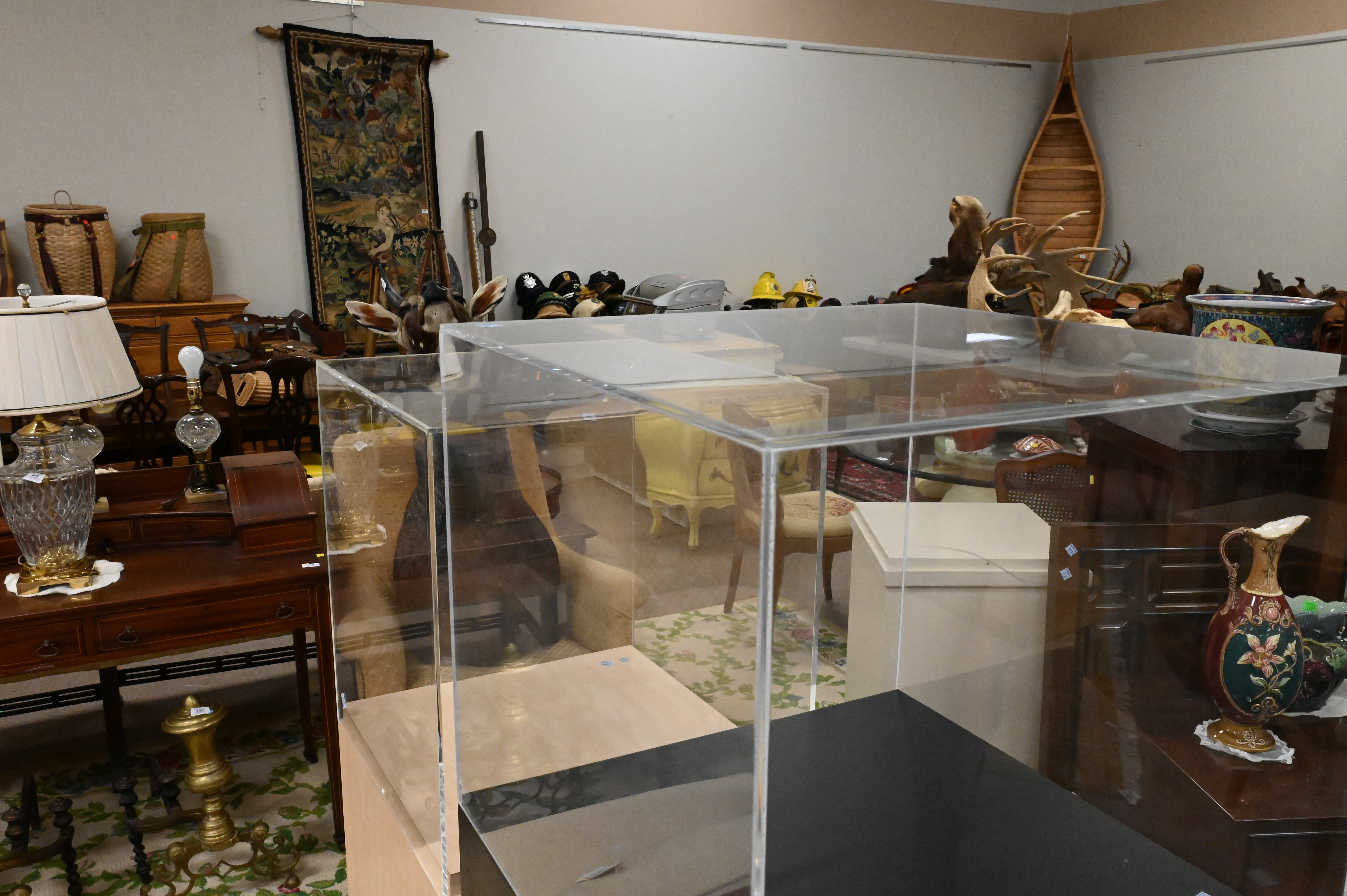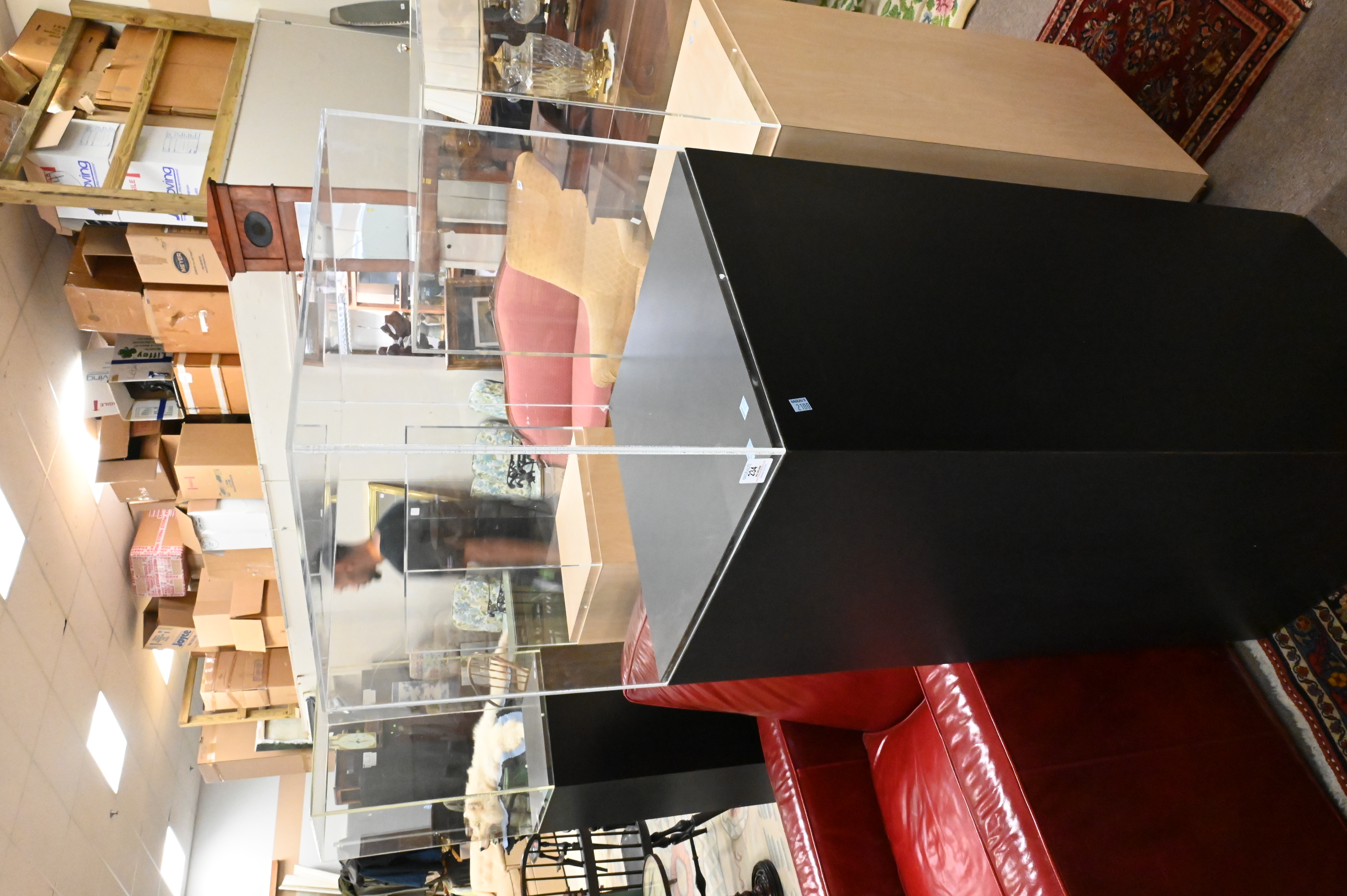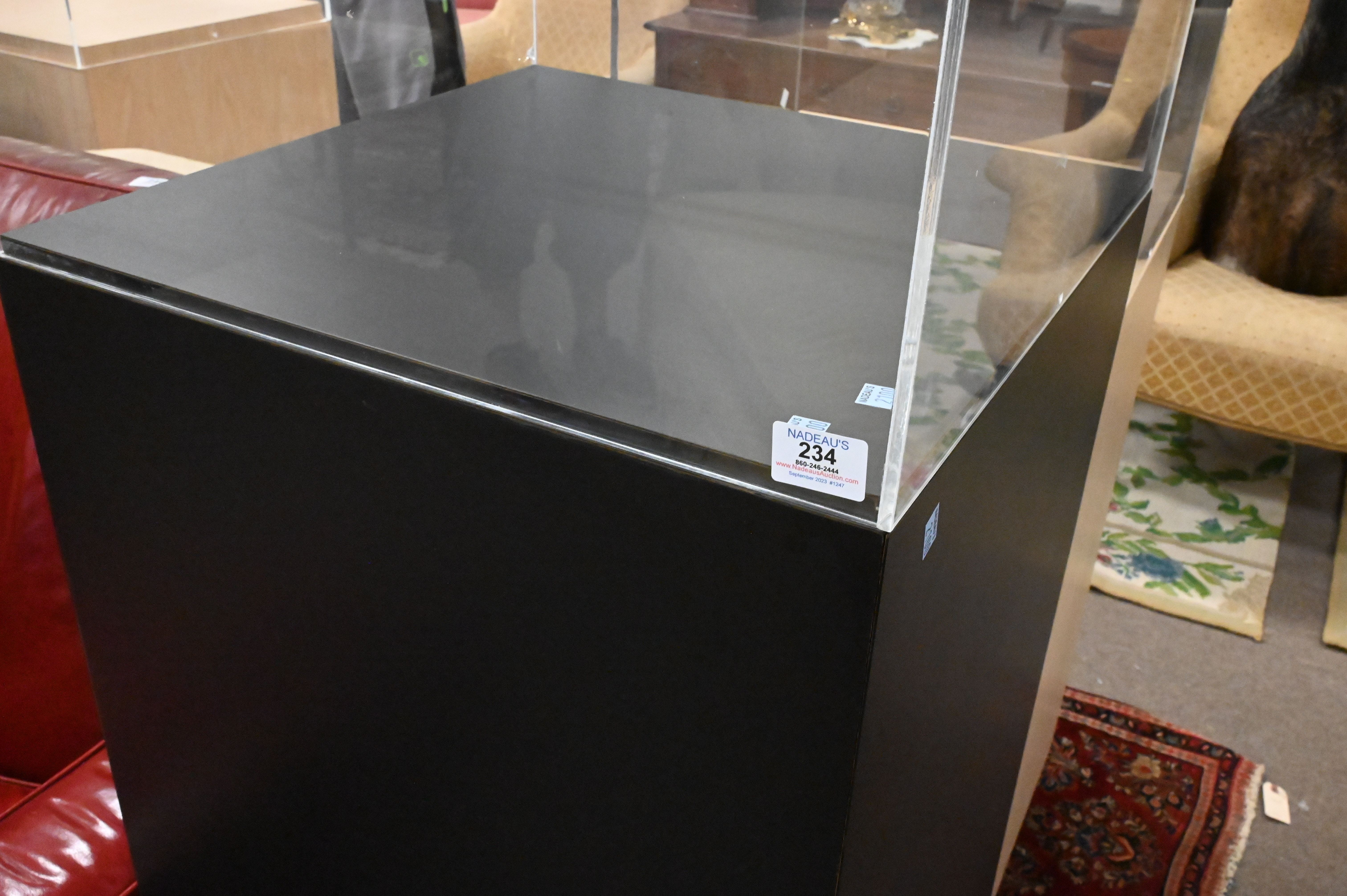 Two Display Cases, each having a pedestal base with lucite/plastic clear tops, height of one 59 1/2 inches top 20 x 20 inches, the other height 63 inches, top 14 x 14 inches.
