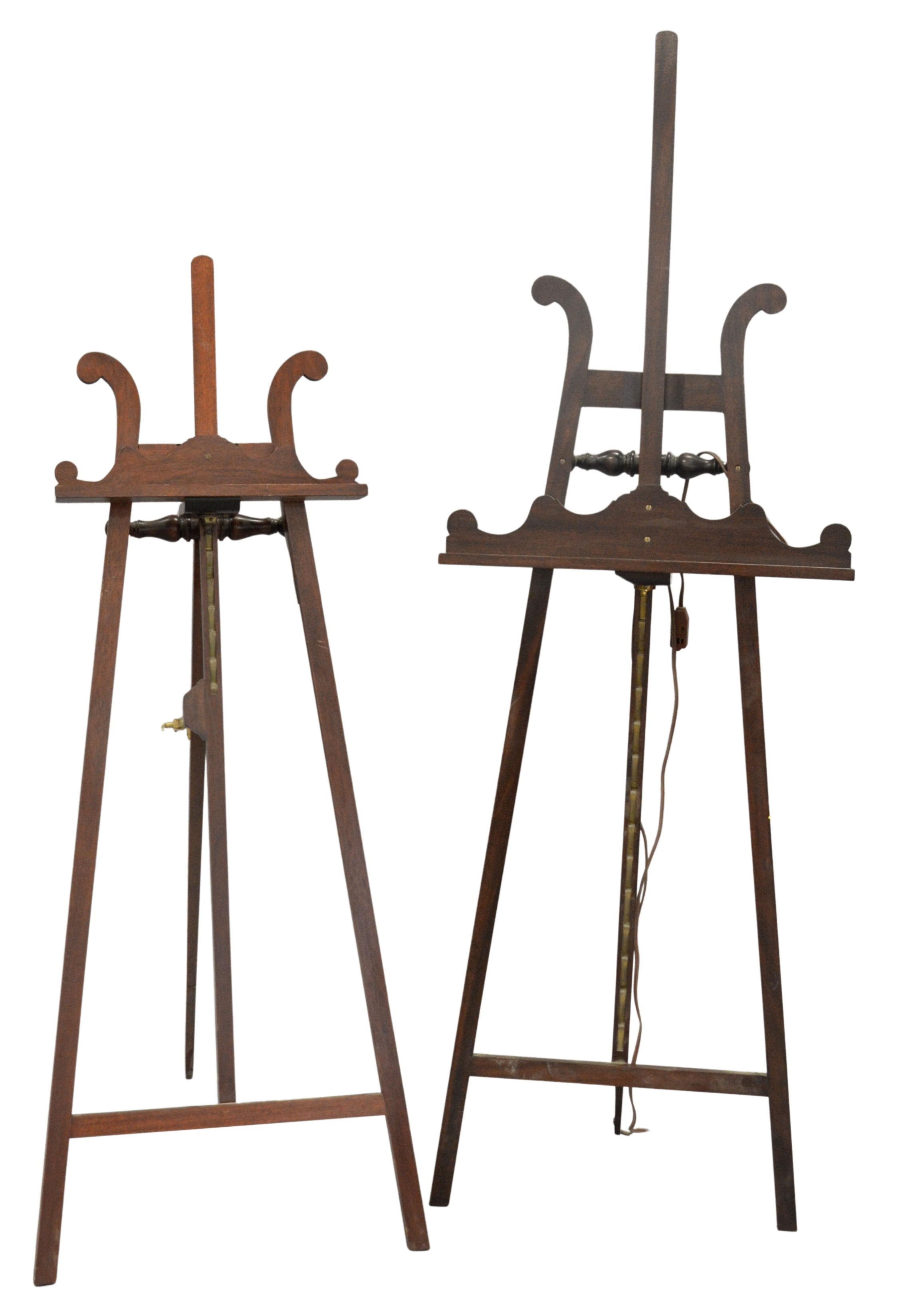 Two Wooden Display Easels, one wired to take light, both height 56 inches