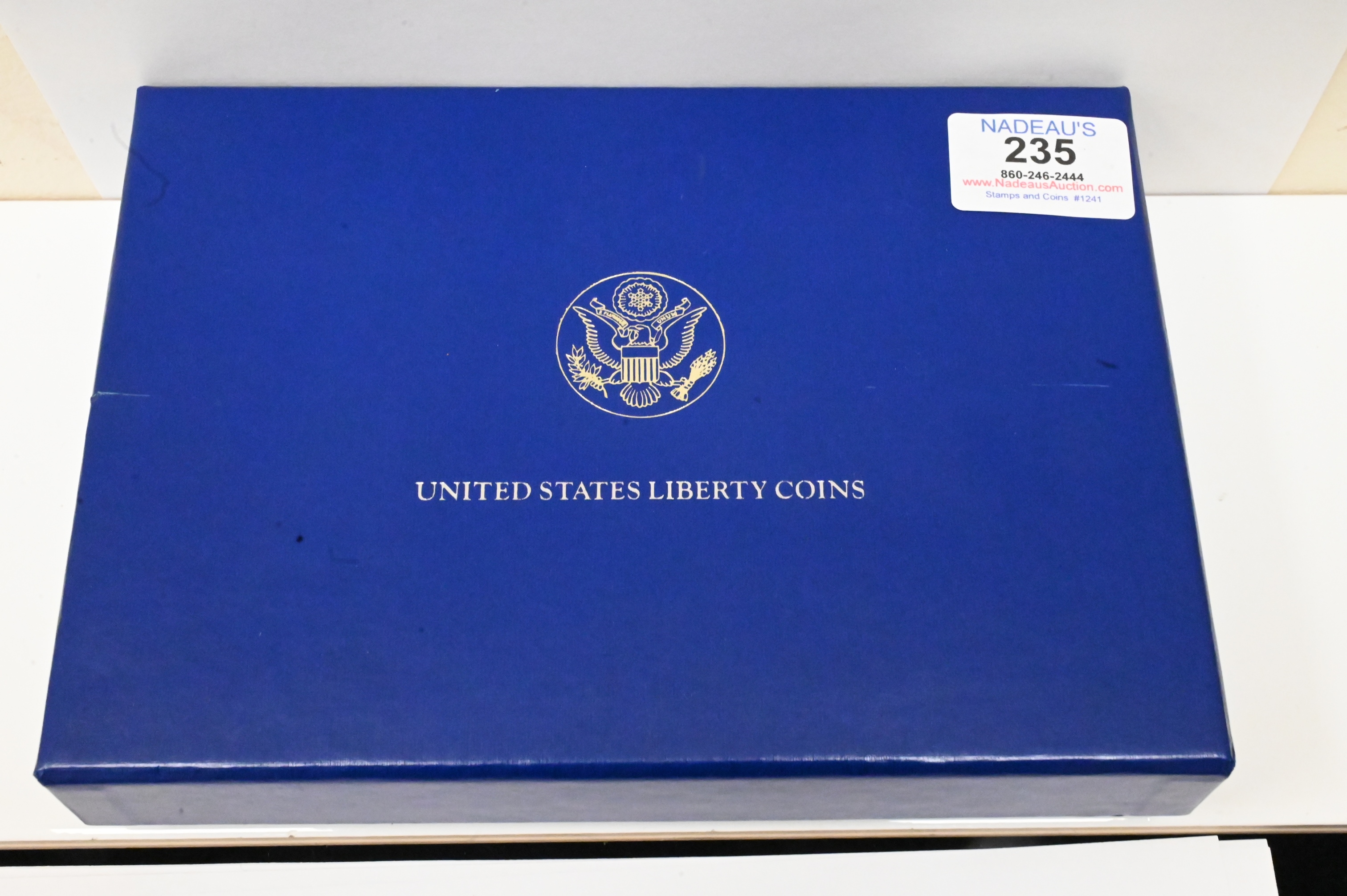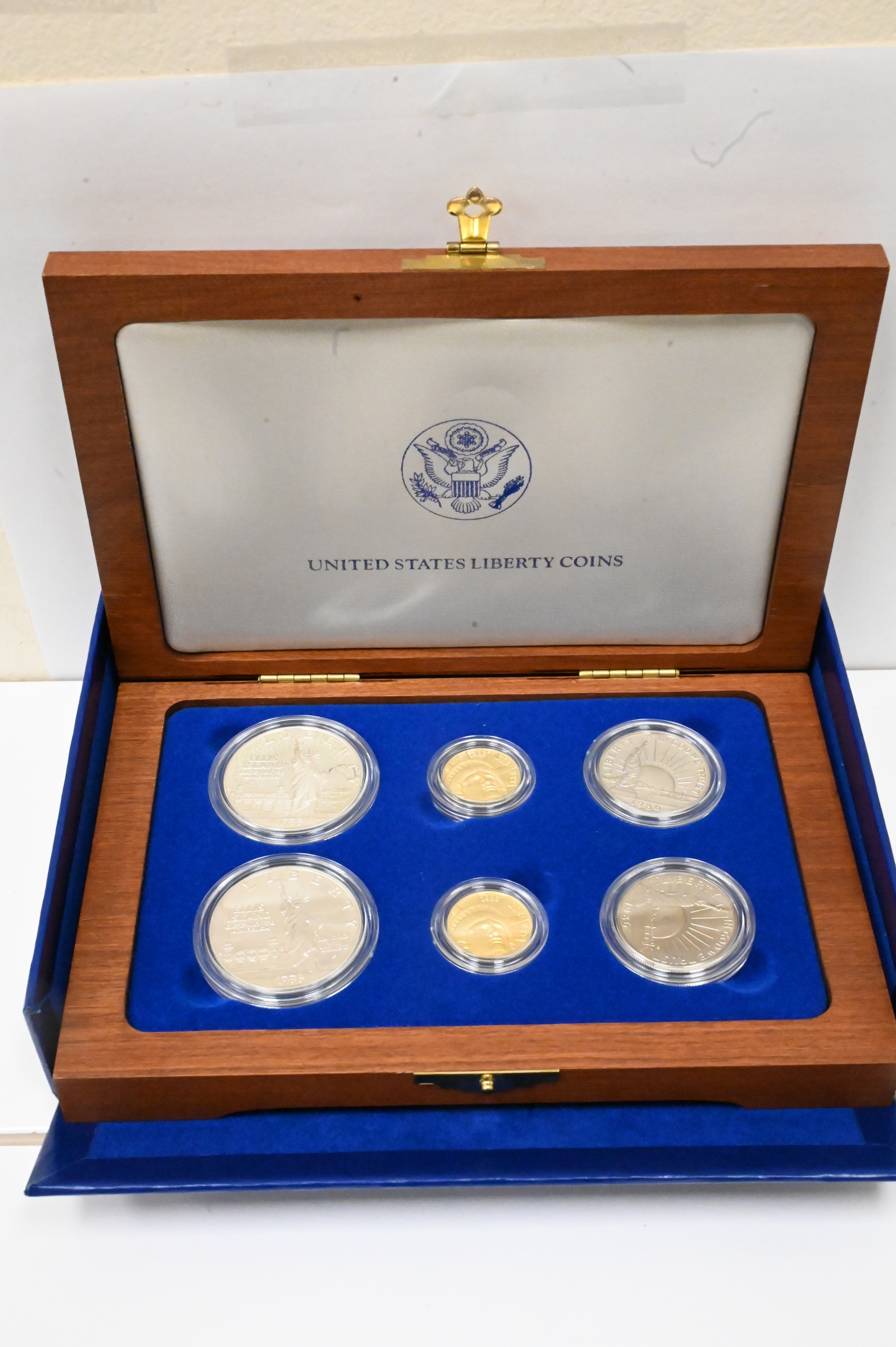 1986 Six Coin Commemorative Set, having two gold $5 uncirculated and proof plus two $1 dollar and two ½ dollar, in a presentation box