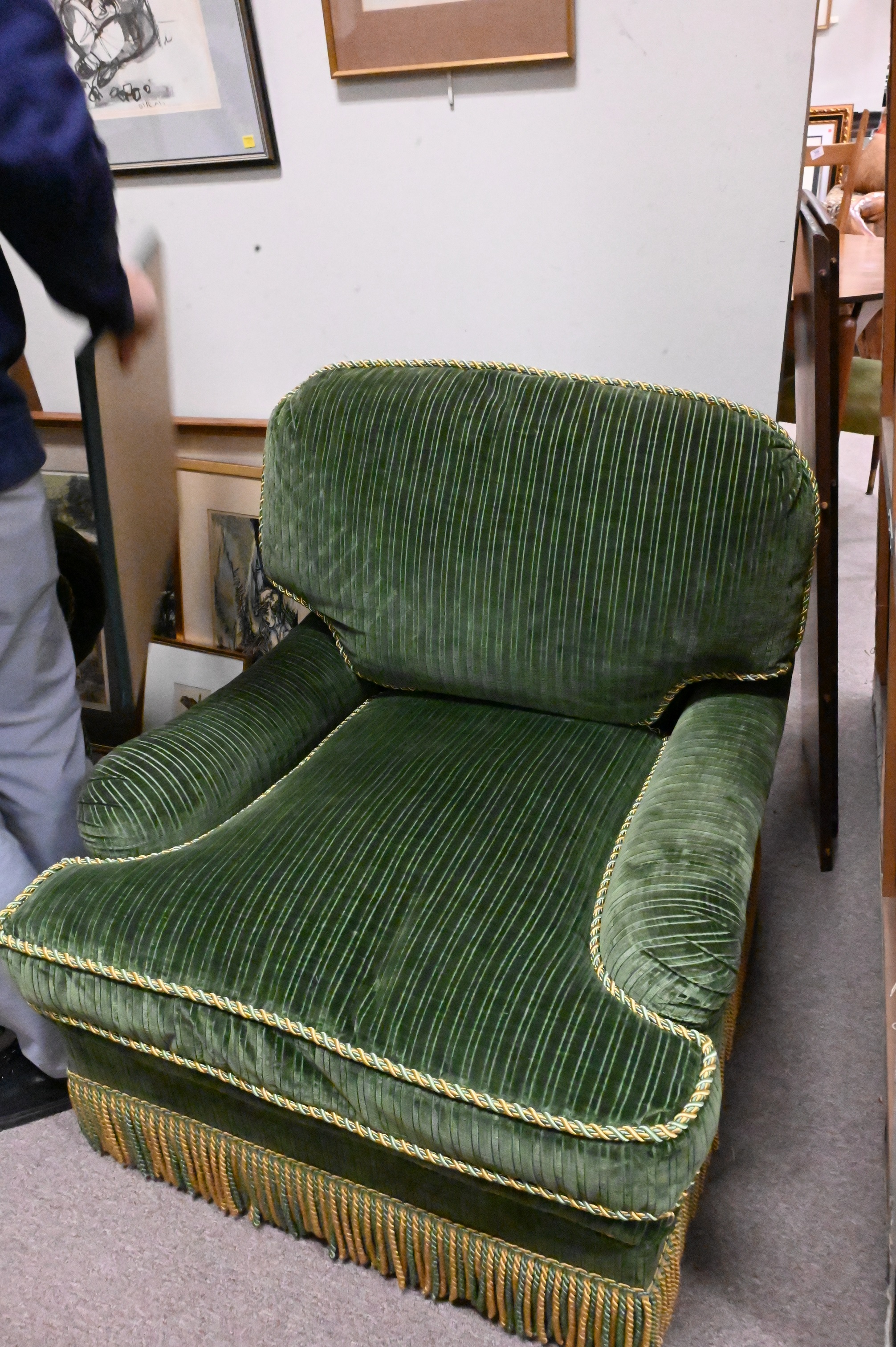 Lot 235: A Pair of Contemporary Green Velour Upholstered Swivel Club Chairs