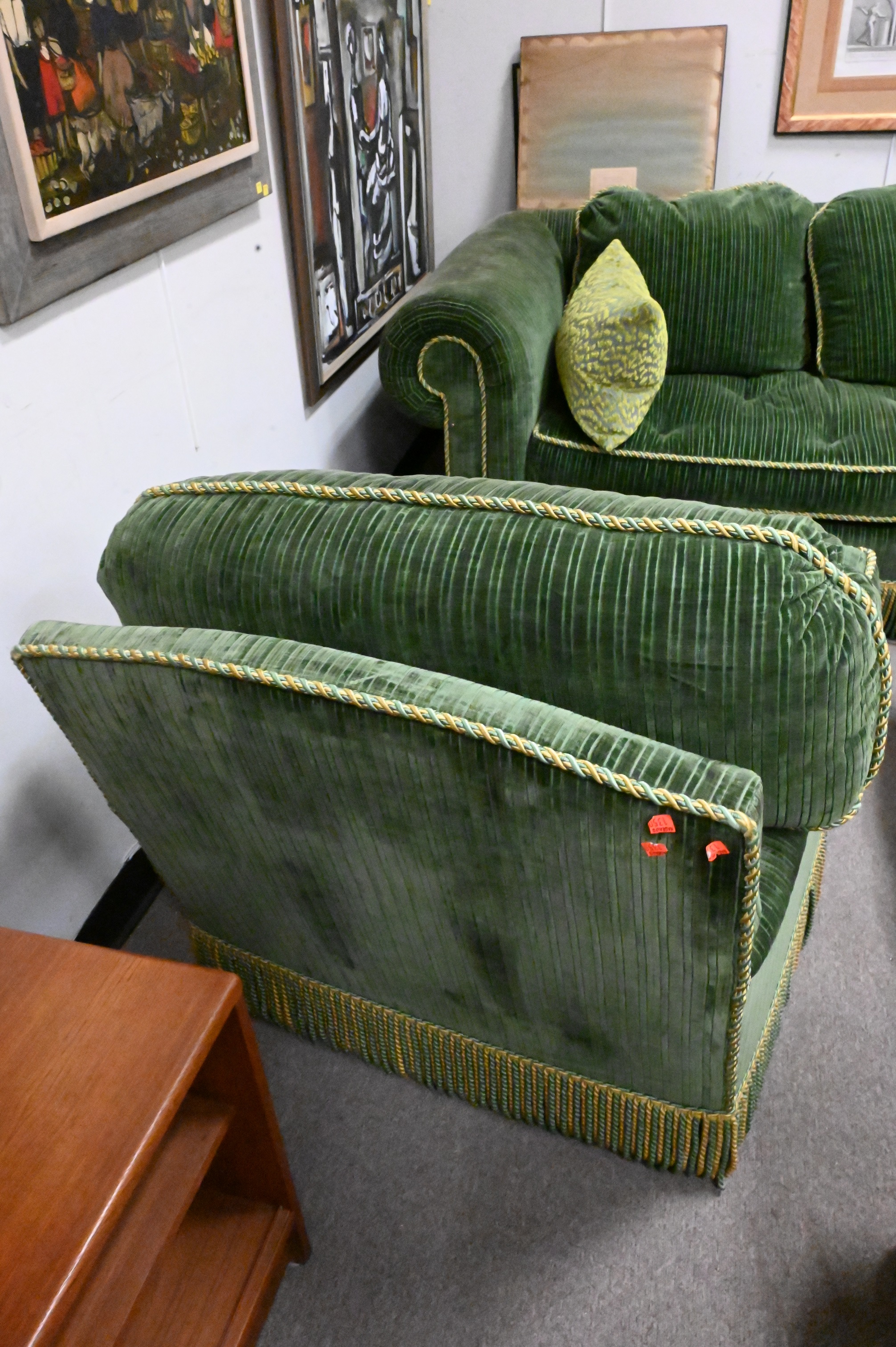 A Pair of Contemporary Green Velour Upholstered Swivel Club Chairs, supplied by Thomas Britt, late 20th century, covered in a ribbed green velvet with green and gold silk rope seams and tassels, height 32 inches, width 39 inches, depth of each 39 inches. Provenance: Property from a private New York collection sold to benefit charitable foundations.
