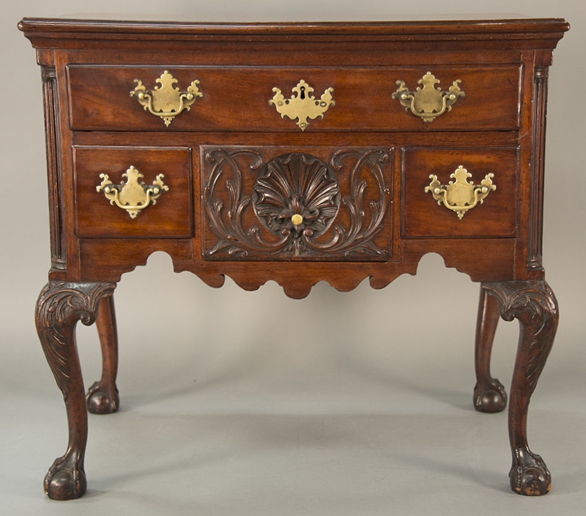 Lot 235: Chippendale carved mahogany lowboy having rectangular top over one long drawer over central drawer shell carving acanthus leaves flanked by two short drawers with fluted quarter columns flanking carved skirt set on highly carved cabriole legs ending