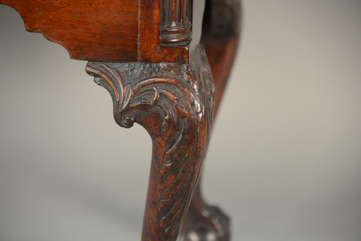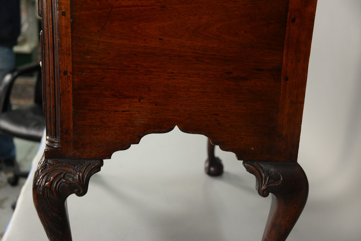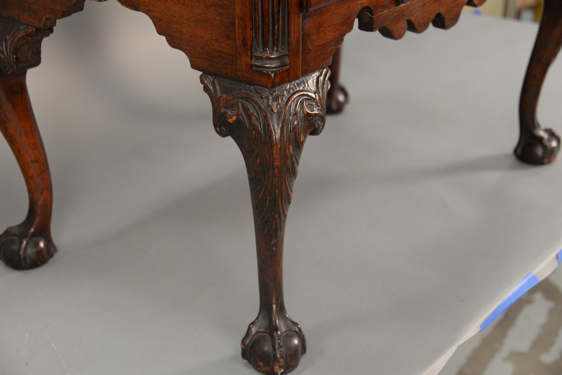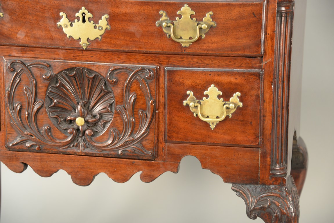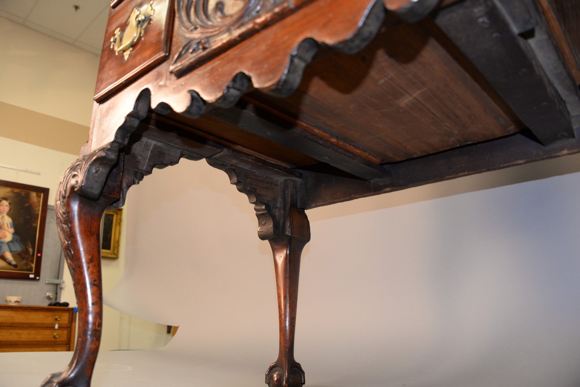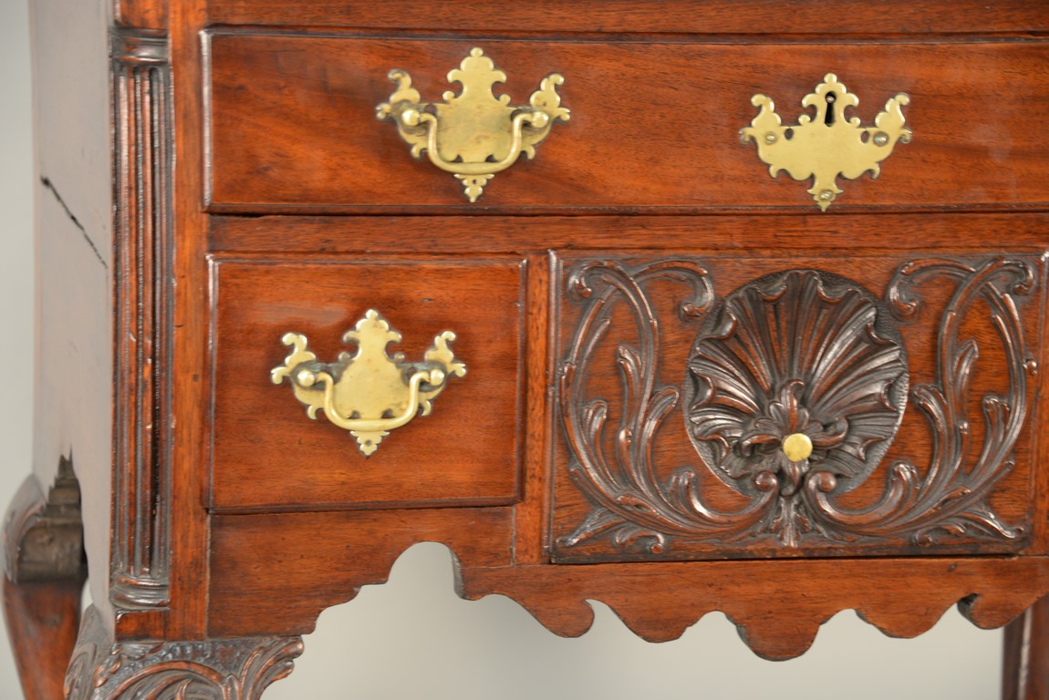 Lot 235: Chippendale carved mahogany lowboy having rectangular top over one long drawer over central drawer shell carving acanthus leaves flanked by two short drawers with fluted quarter columns flanking carved skirt set on highly carved cabriole legs ending