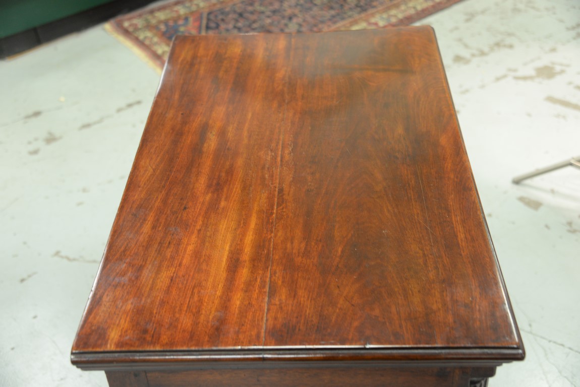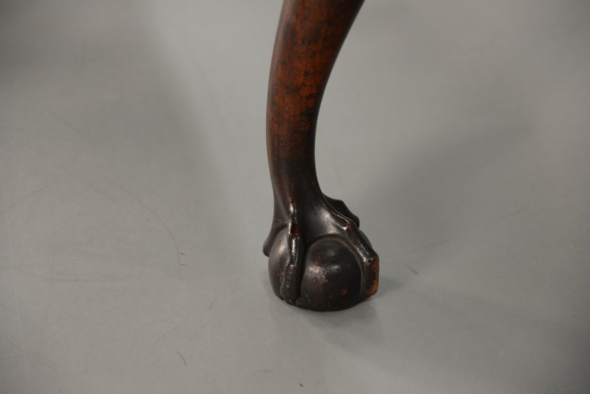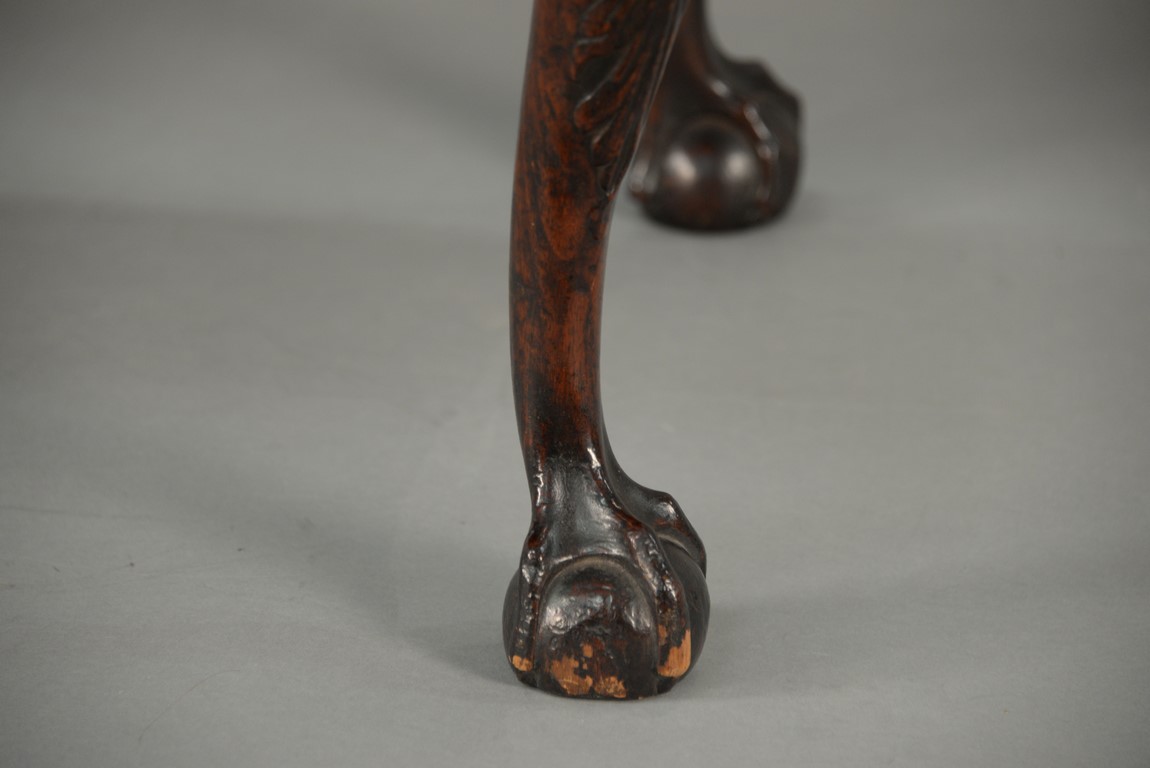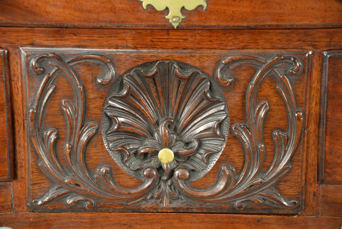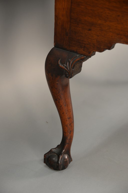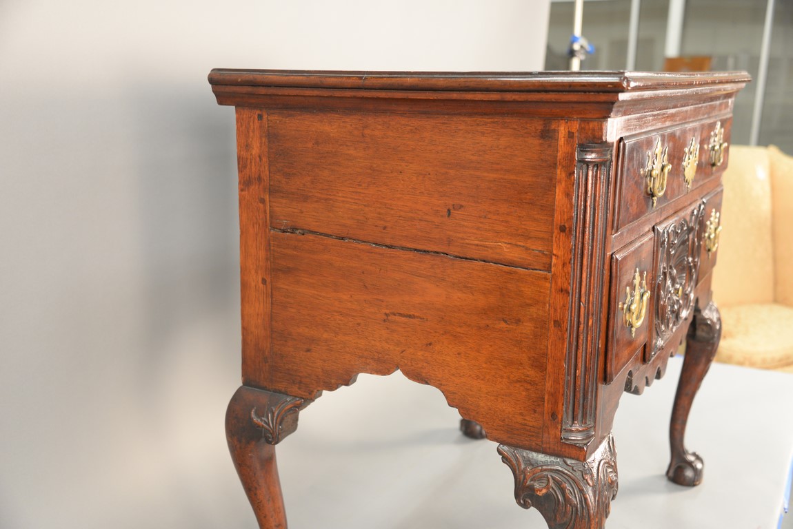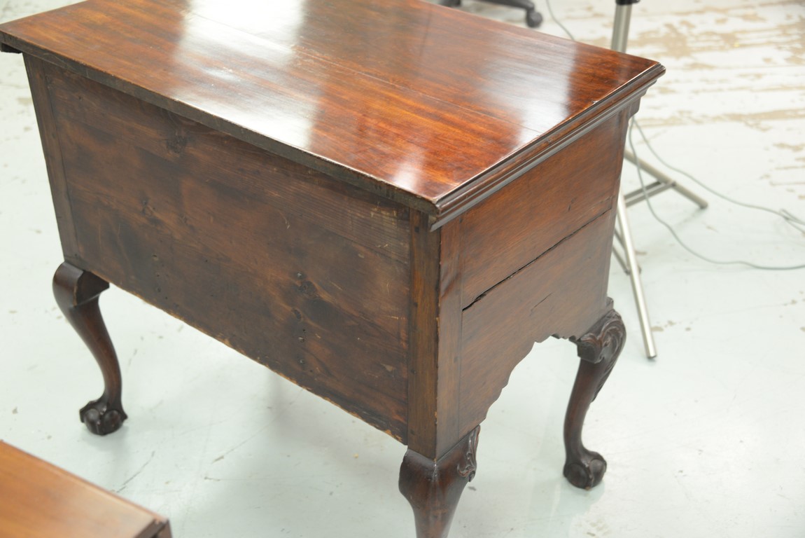 Lot 235: Chippendale carved mahogany lowboy having rectangular top over one long drawer over central drawer shell carving acanthus leaves flanked by two short drawers with fluted quarter columns flanking carved skirt set on highly carved cabriole legs ending