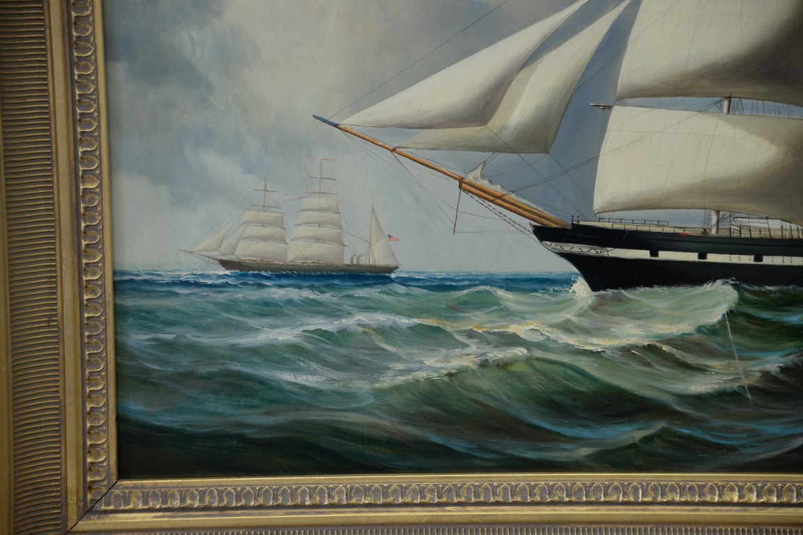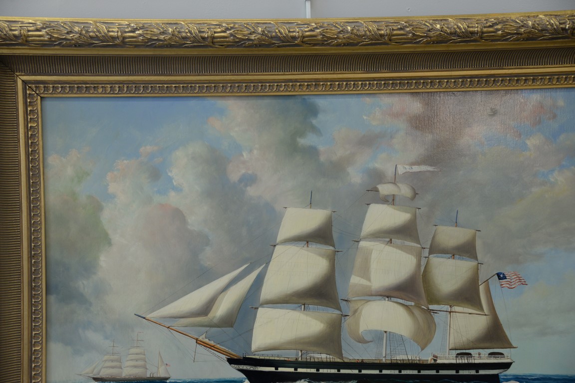 Lot 235: D. Tayler 1968, oil on canvas, American Sailing Ship, signed lower right: D. Tayler, 24 x 36. Property from Credit Suisse’s A…