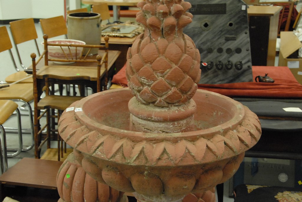 Four piece outdoor lot to include a large two part bird bath, two pineapples, and a pedestal. ht. 25in. dia. of house 28in.