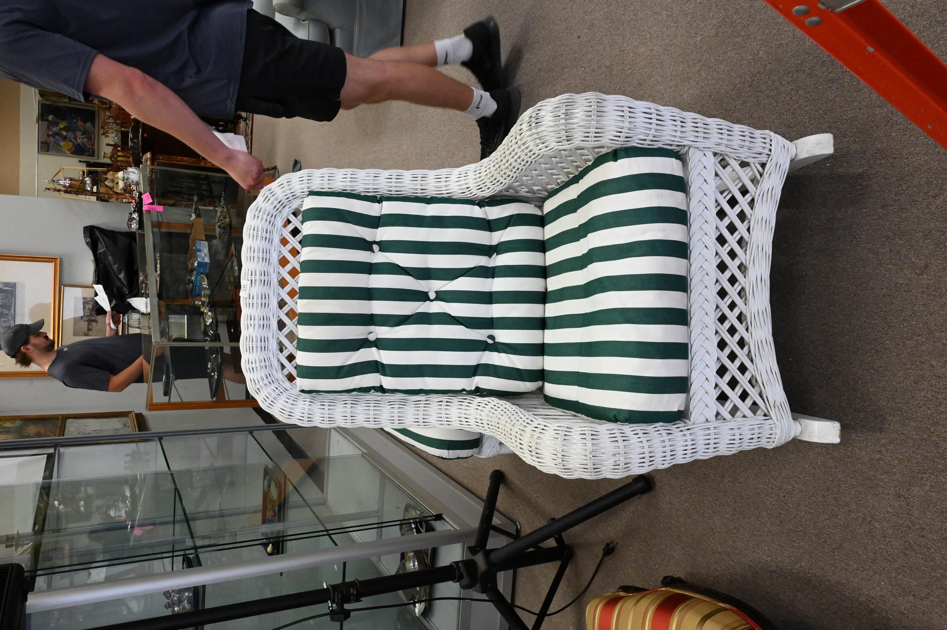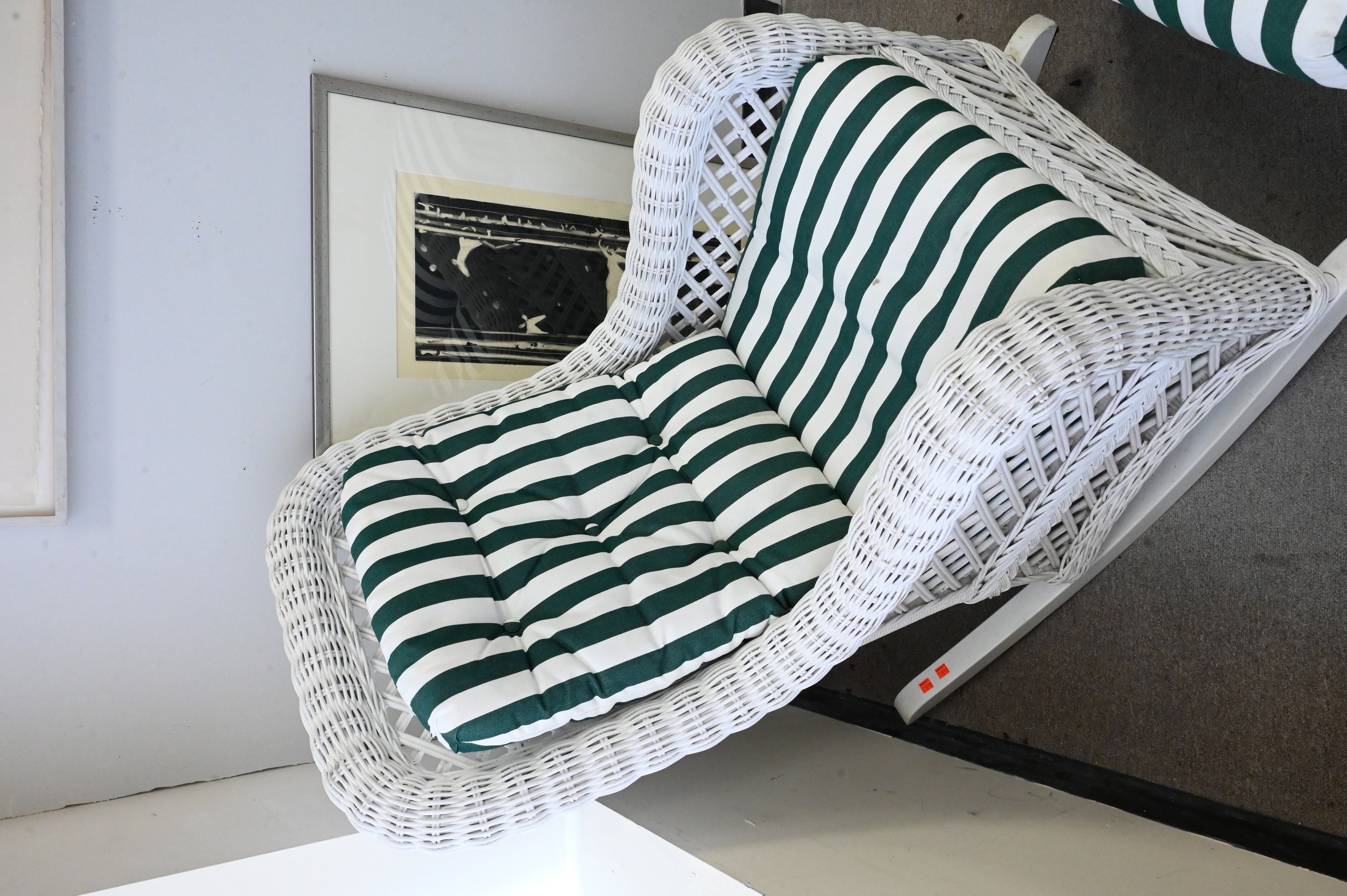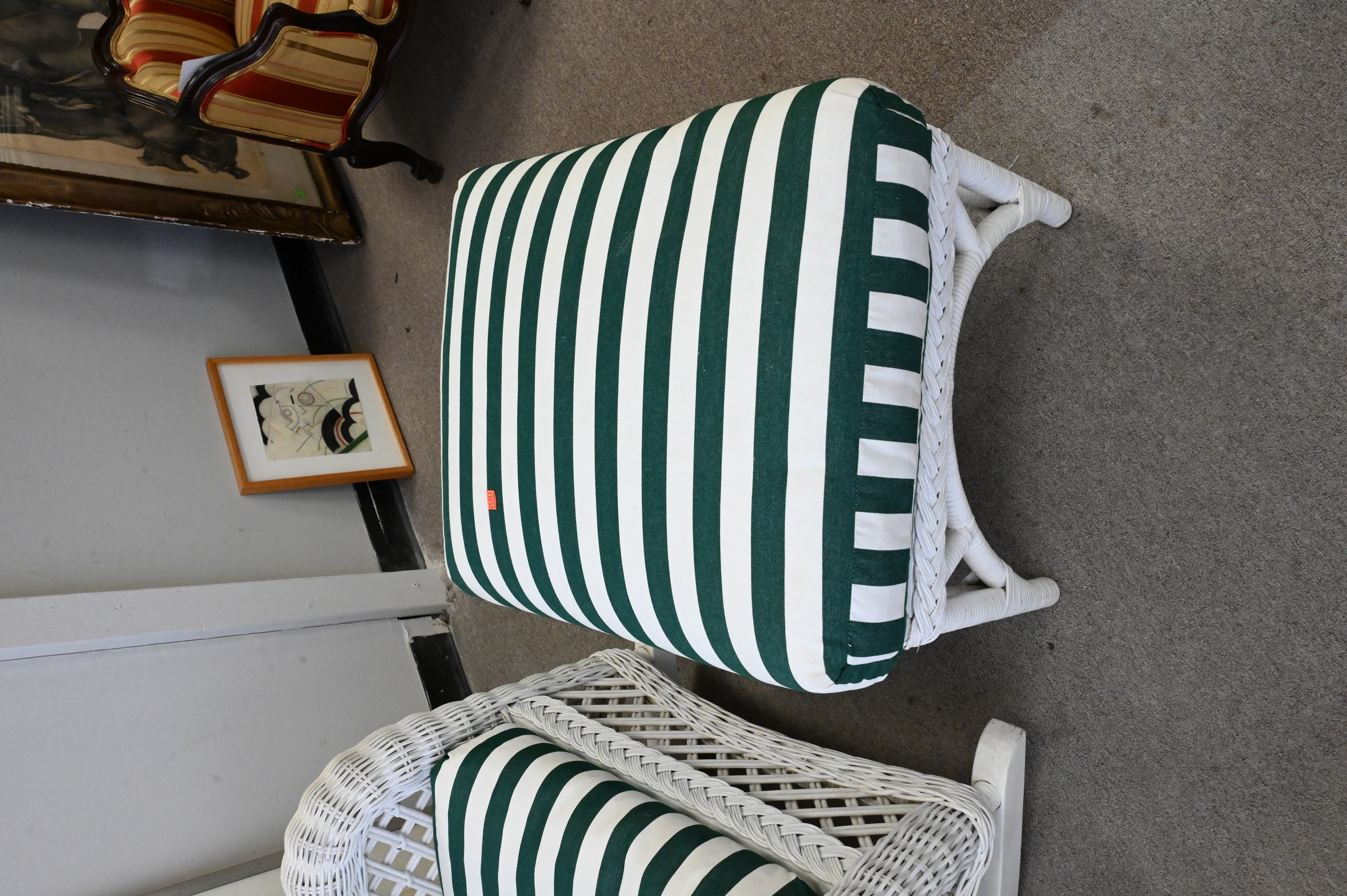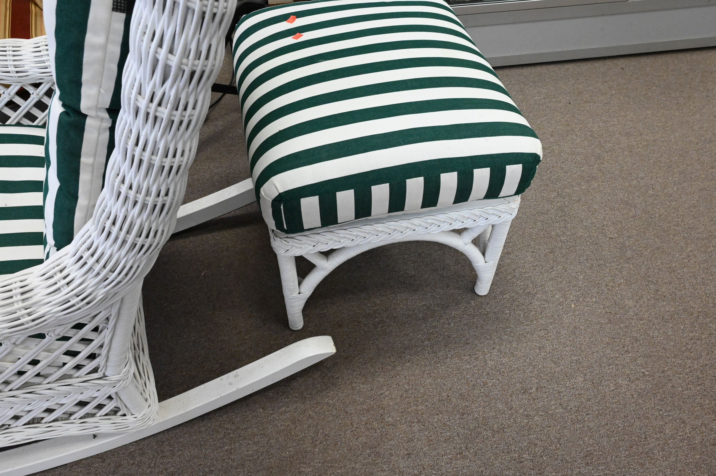 pair of wicker rockers, pair of wicker ottomans with outdoor upholstered cushions