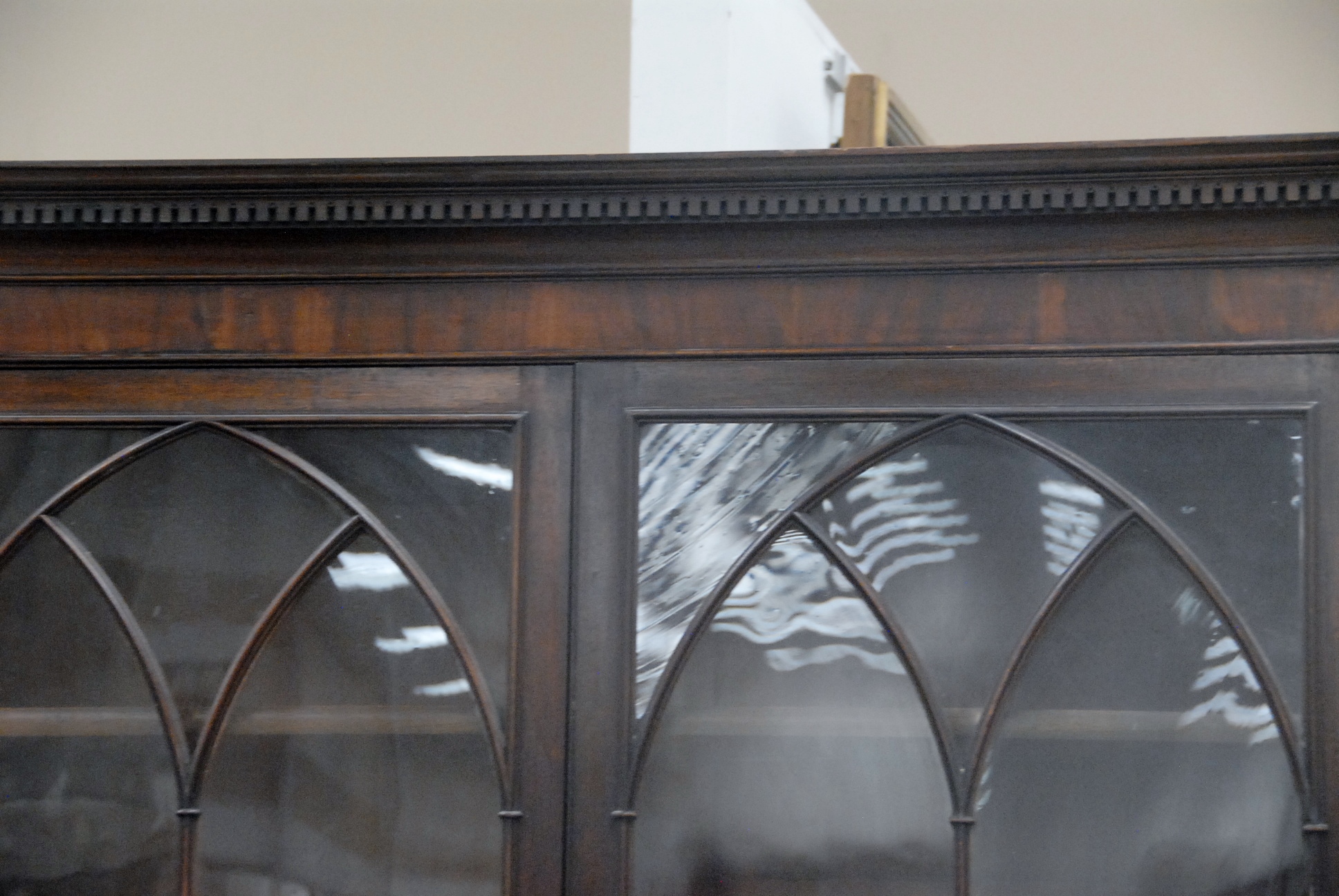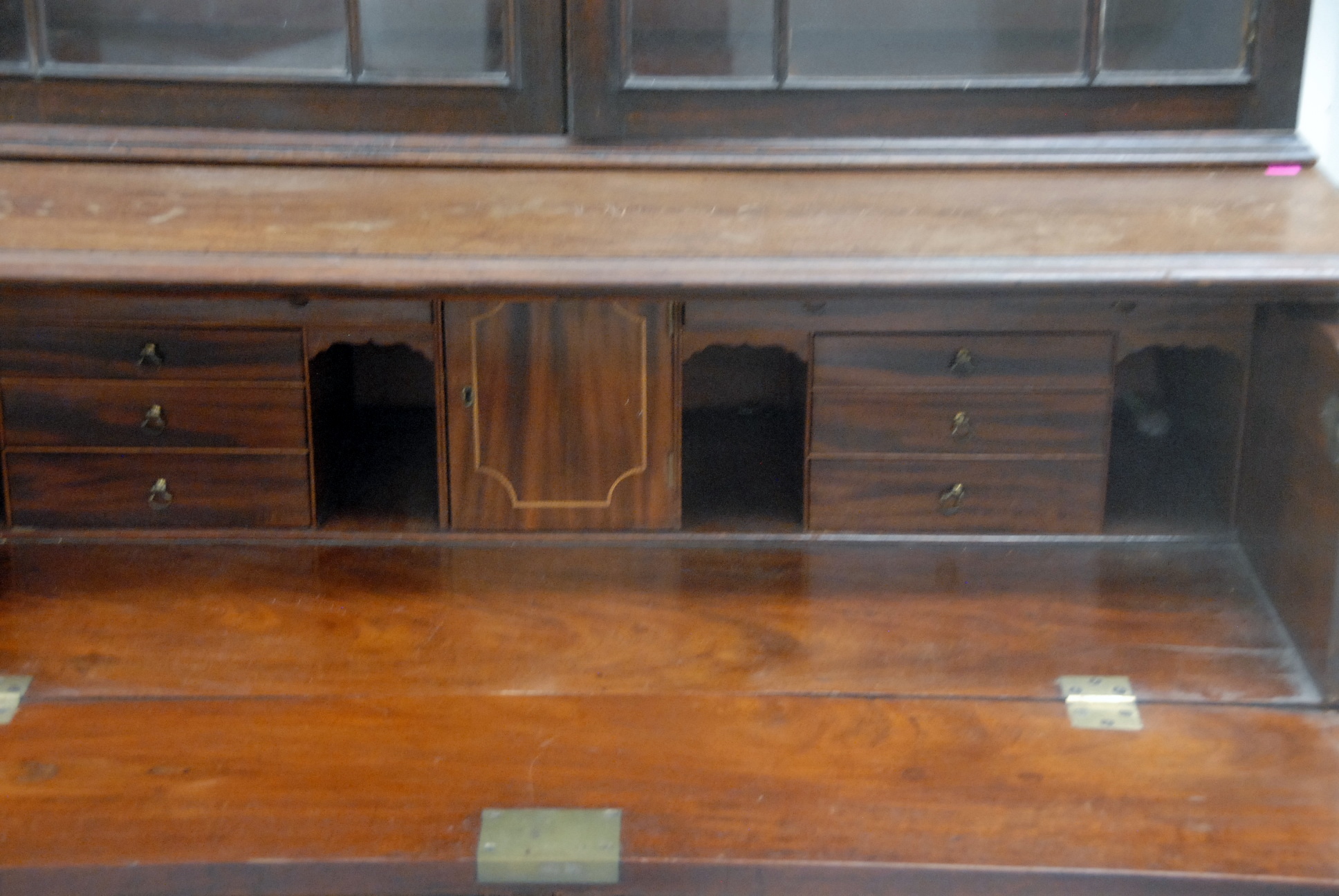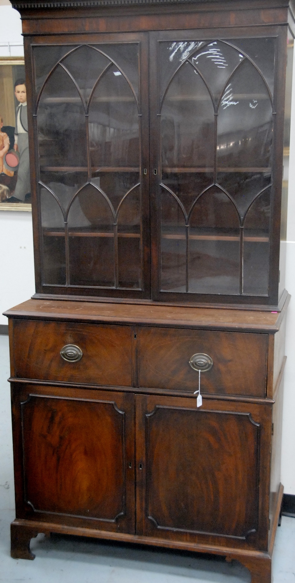 Lot 235: George IV mahogany secretary desk in two parts, upper section with two glazed doors on lower section with pull out writing surface over two doors opening to reveal three fitted drawers all set on bracket base, circa 1780 ht. 85.5in., wd. 41.5in.