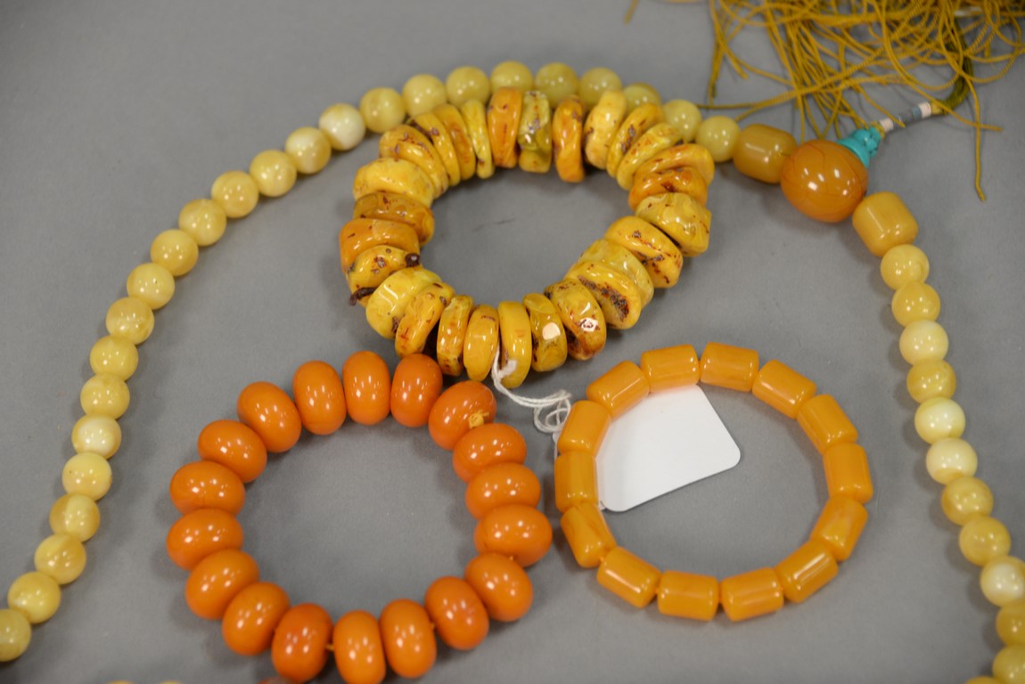 Lot 235: Group of amber to include three bracelets and a necklace. necklace: lg. 25 in., bracelet: dia. 3 in.