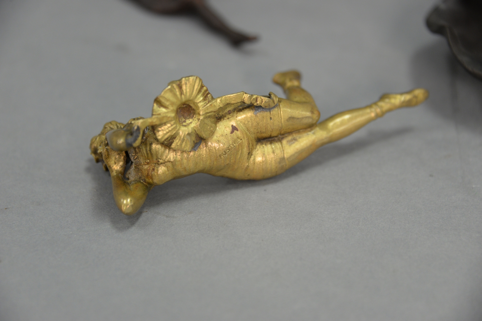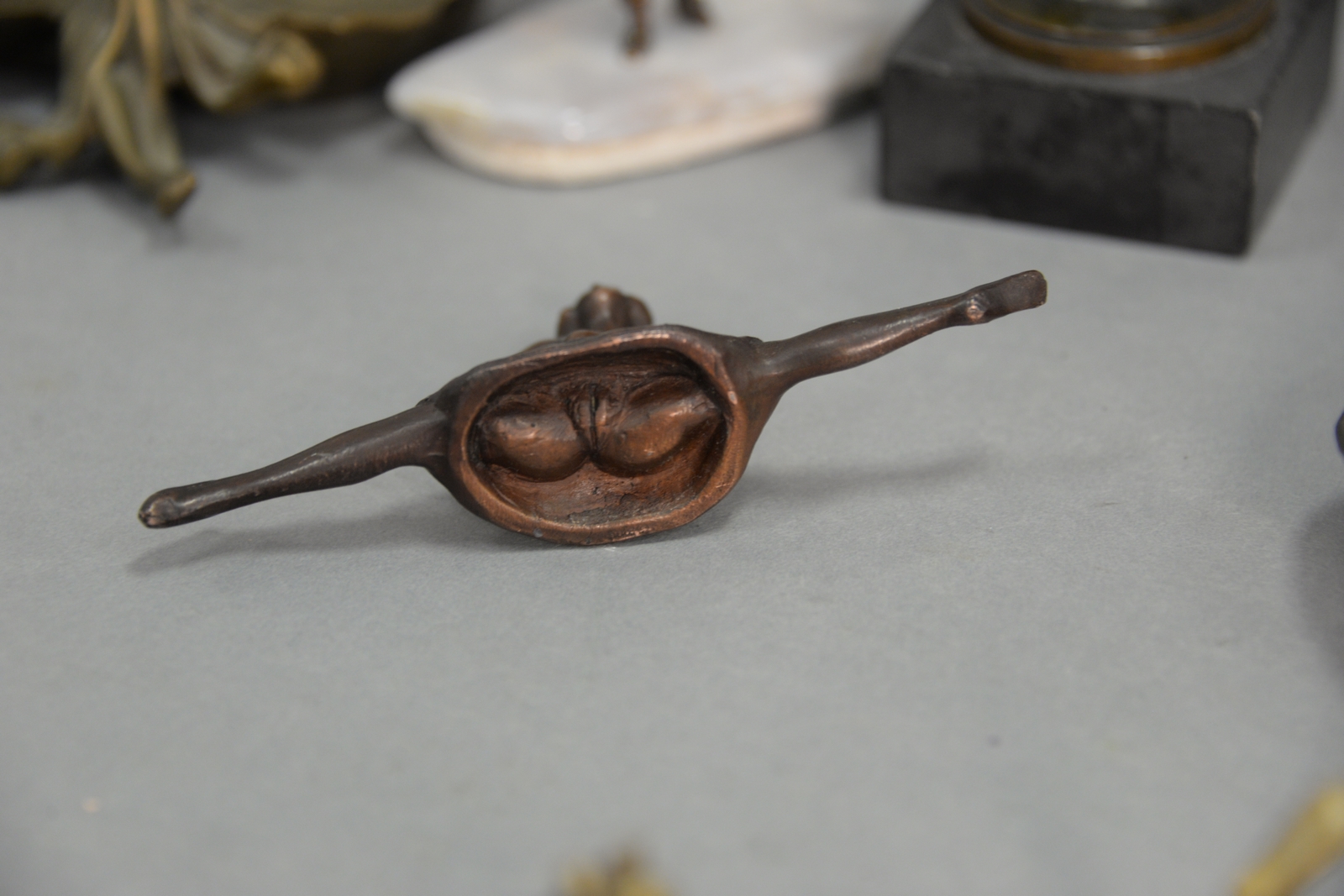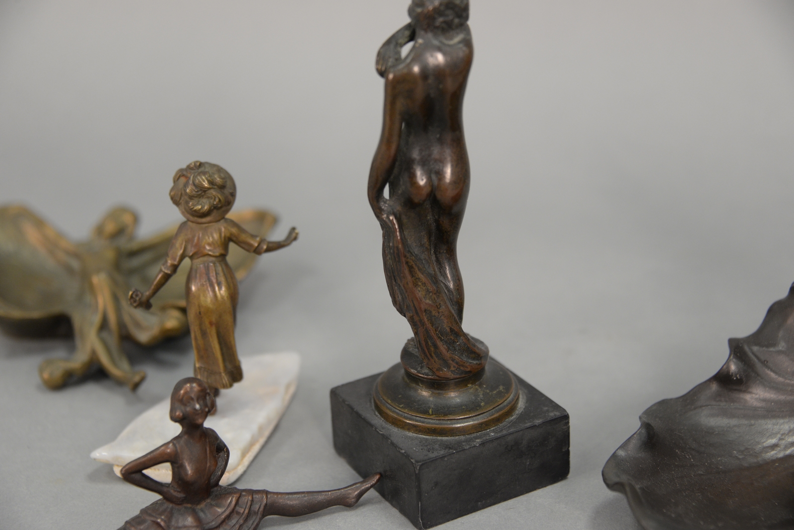 Group of six bronze women including erotic ballerina, art nouveau butterfly dish, nude standing figure, Victorian girl marked Austria, small dish, and a small woman on a stone. ht. 1 3/4in. to 6in.