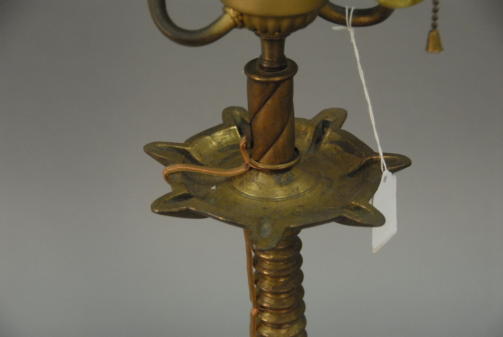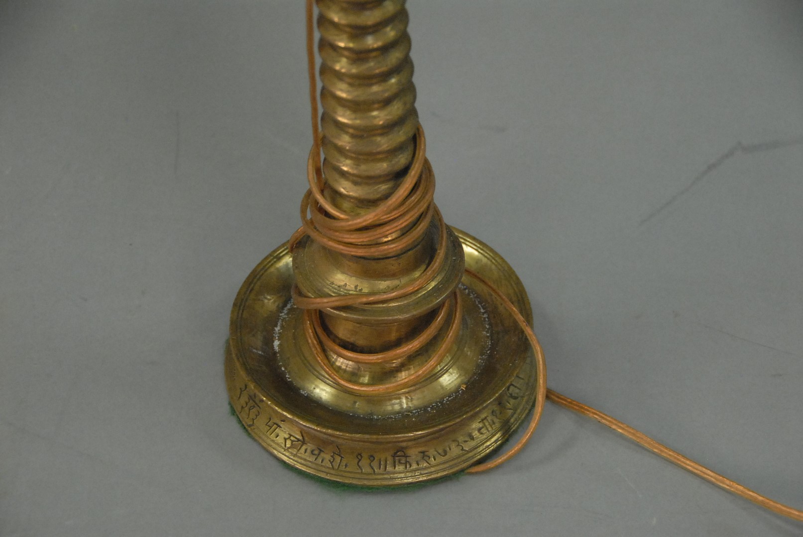 Lot 235: Heavy brass Islamic 7 wick oil lamp, not drilled, 17th/18th century. lamp ht. 25 1/2 in. total ht. 30 in.