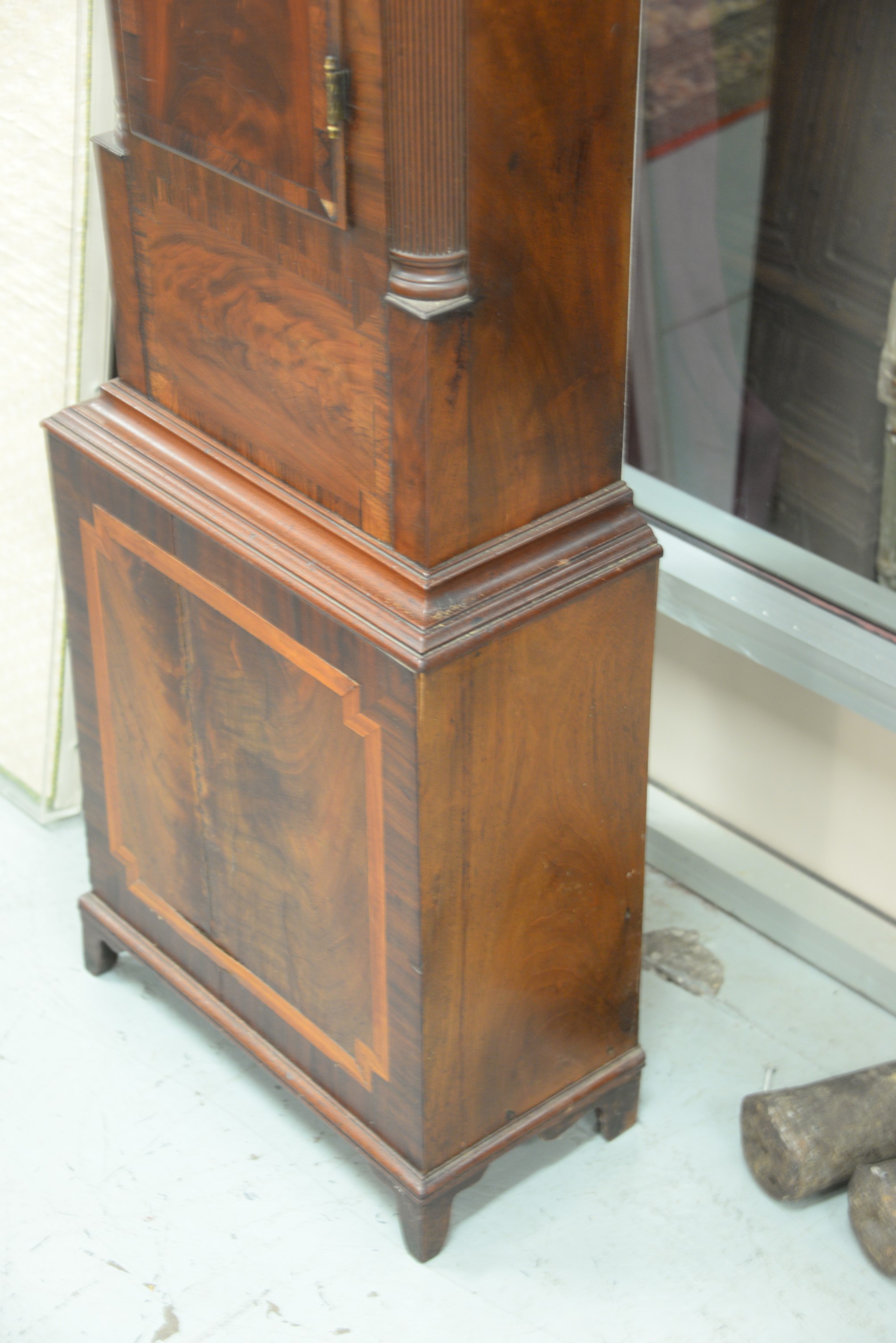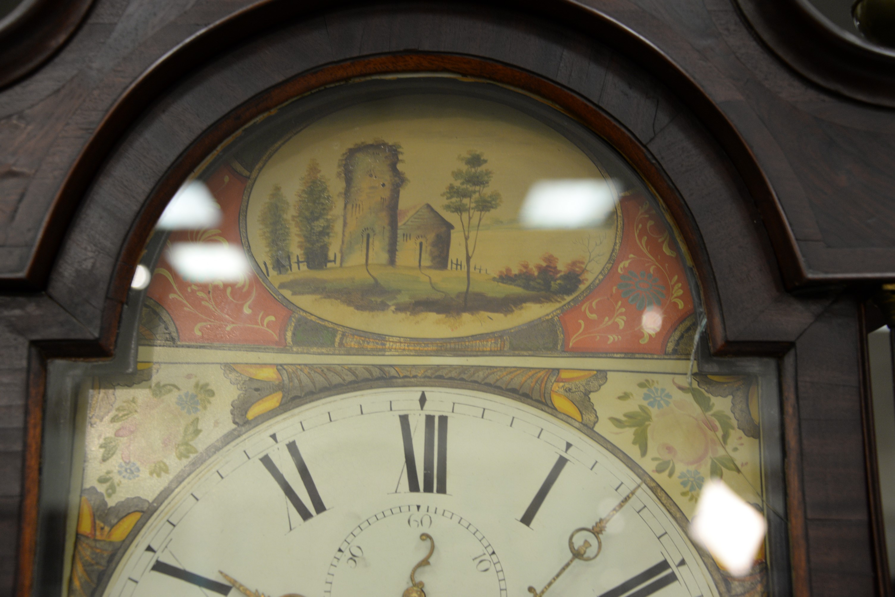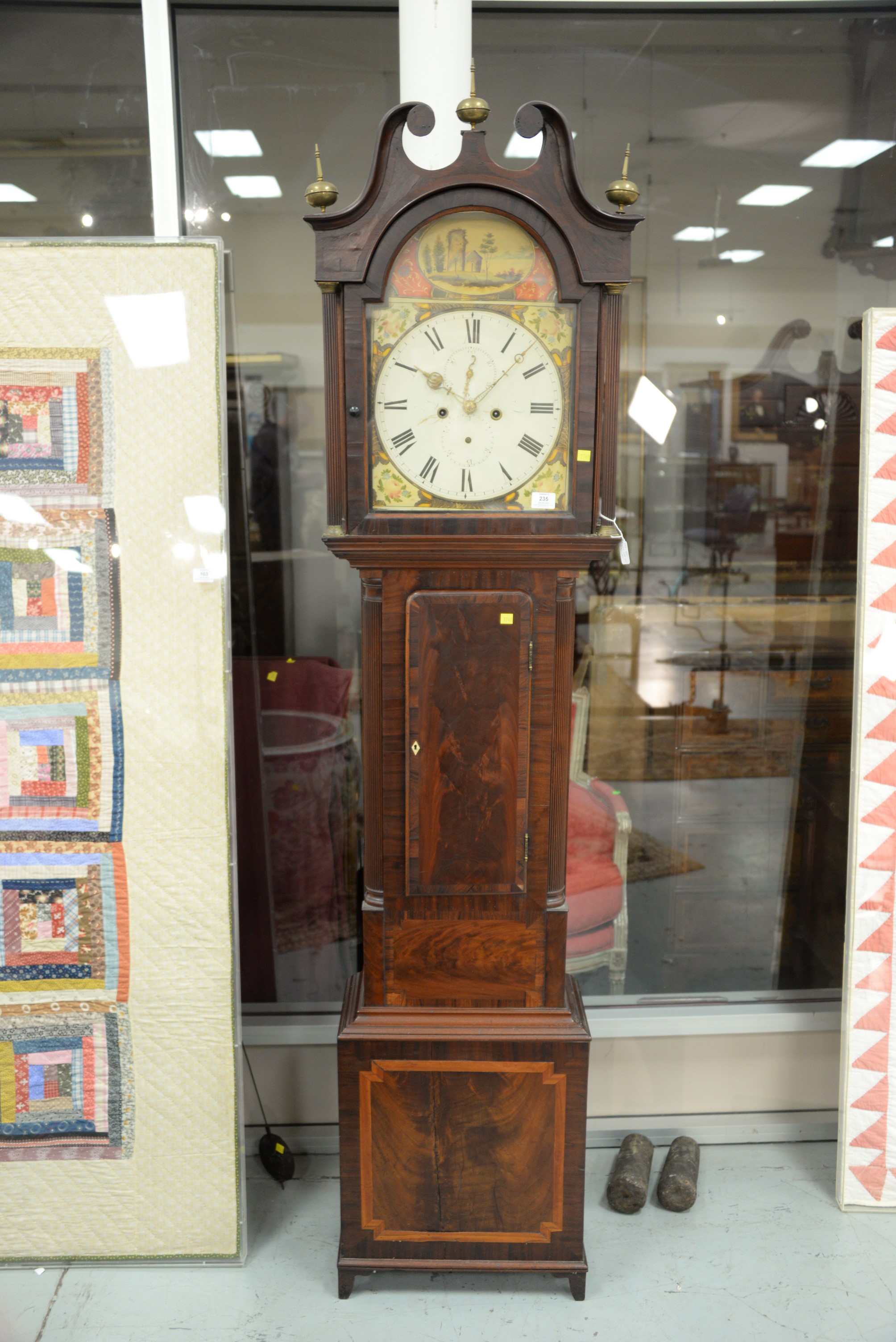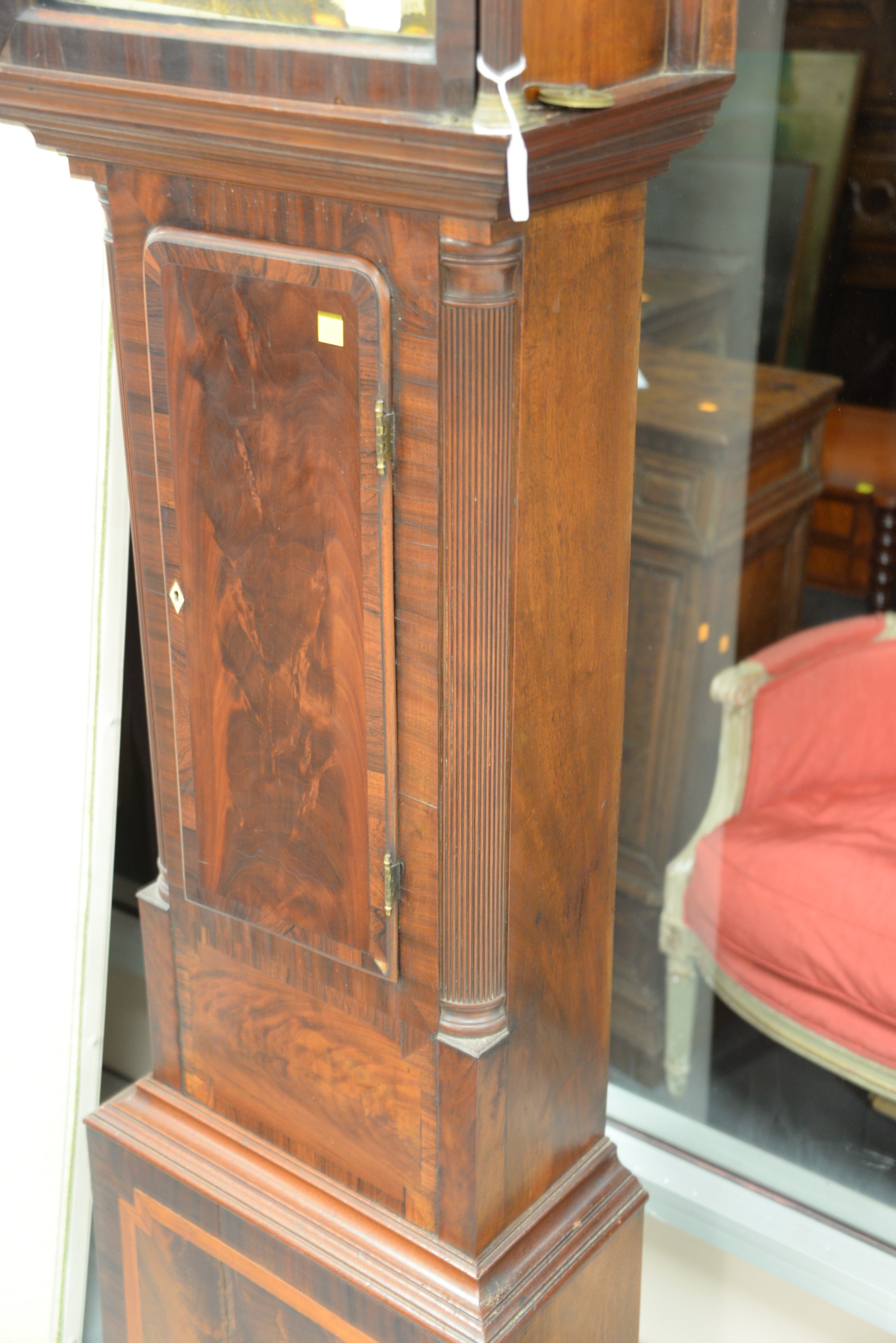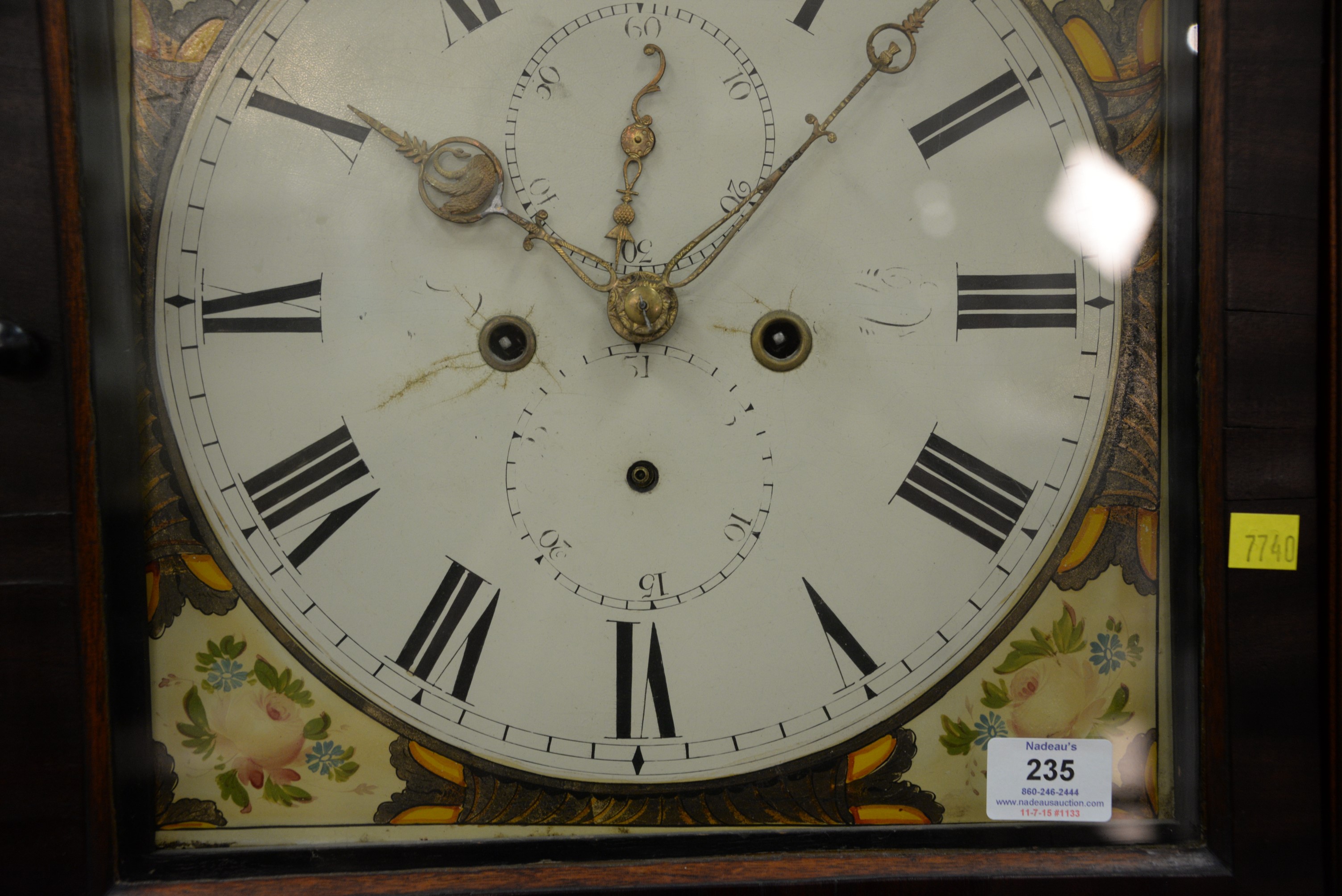 Mahogany tall clock with painted metal dial and brass works. ht. 85 in.