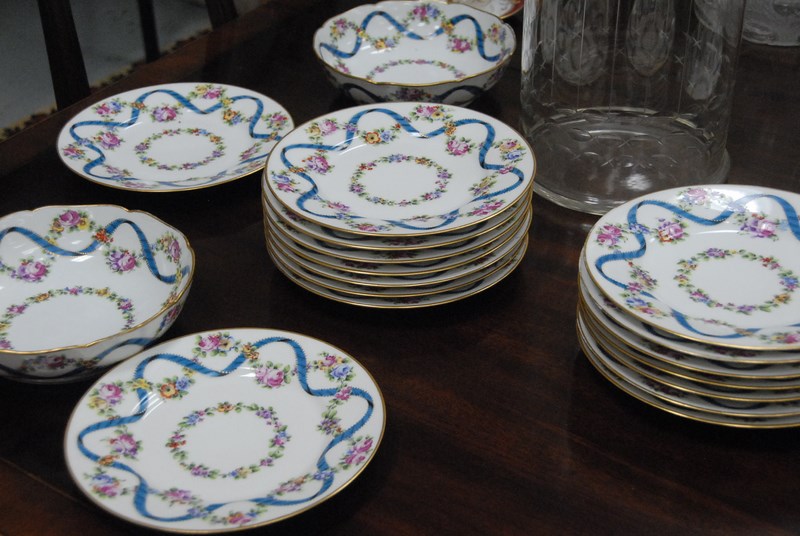 Sevres lot, twenty-one total pieces to include four vegetable bowls and seventeen plates. bowl: dia. 8 3/4in. plates: 9 1/2in.