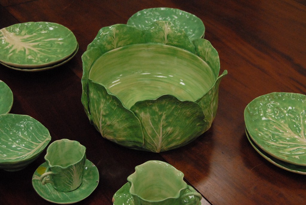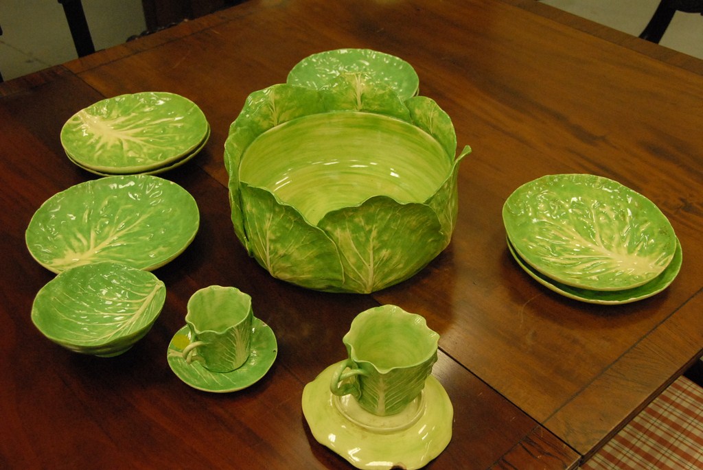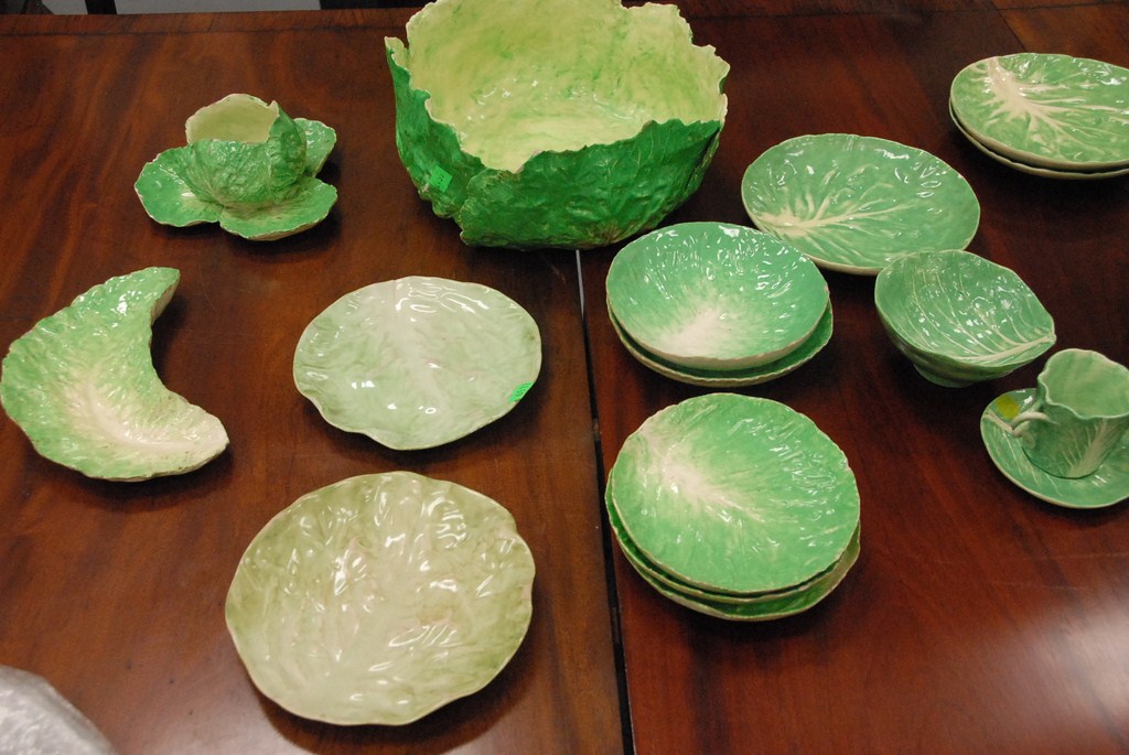 Lot 235: Twenty-piece lot of lettuce style majolica, twelve pieces are signed Dodie Thayer Palm Beach some lot damage.
