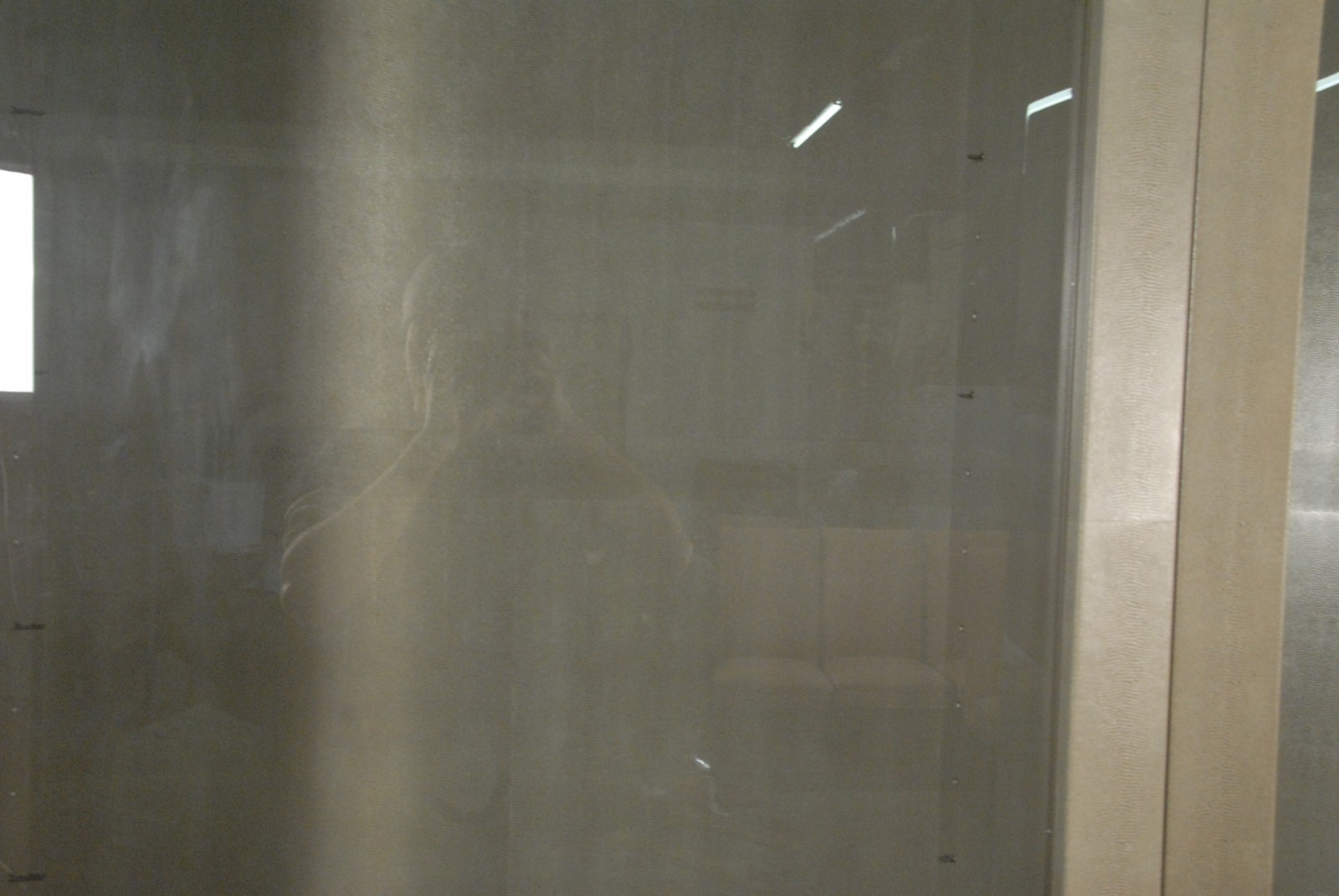 Karl Springer lizard veneer breakfront in two parts having two bevel glass doors with eight 1inch glass shelves all on modern base of two legs, signed Karl Springer 1888. ht. 84in., wd. 72in., dp, 18in., shelves 7/8in. Thick