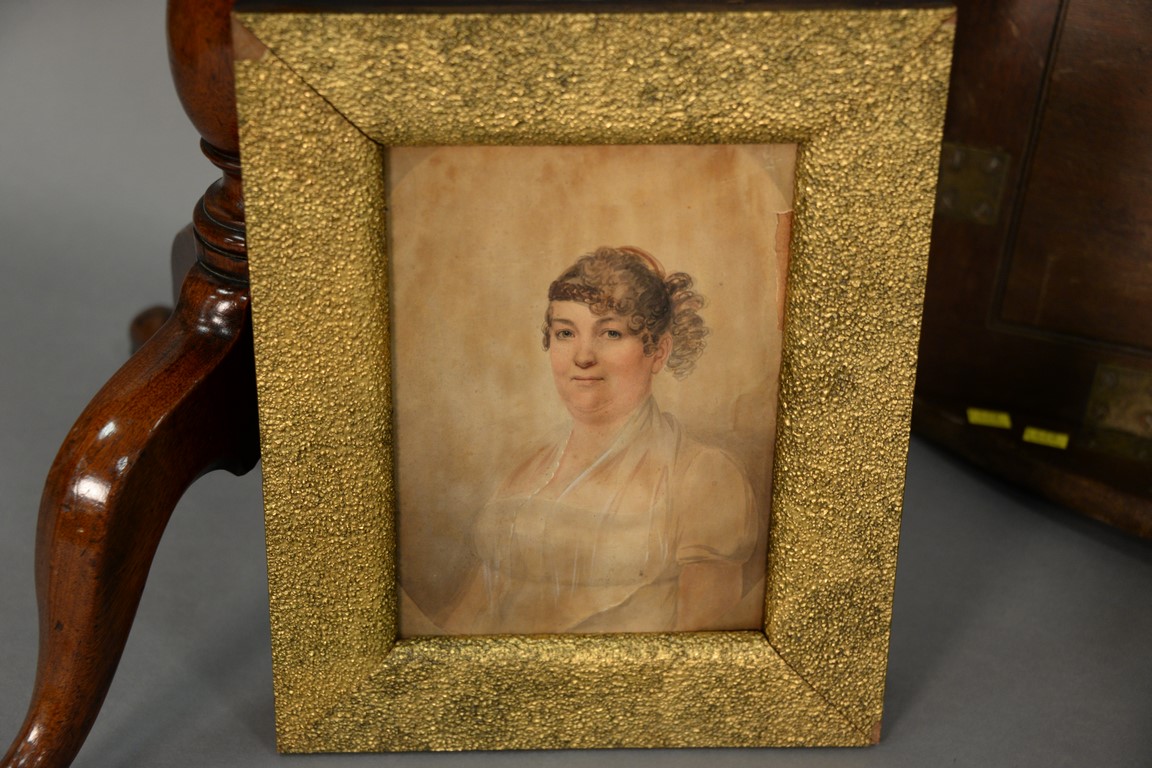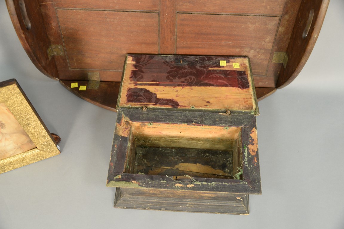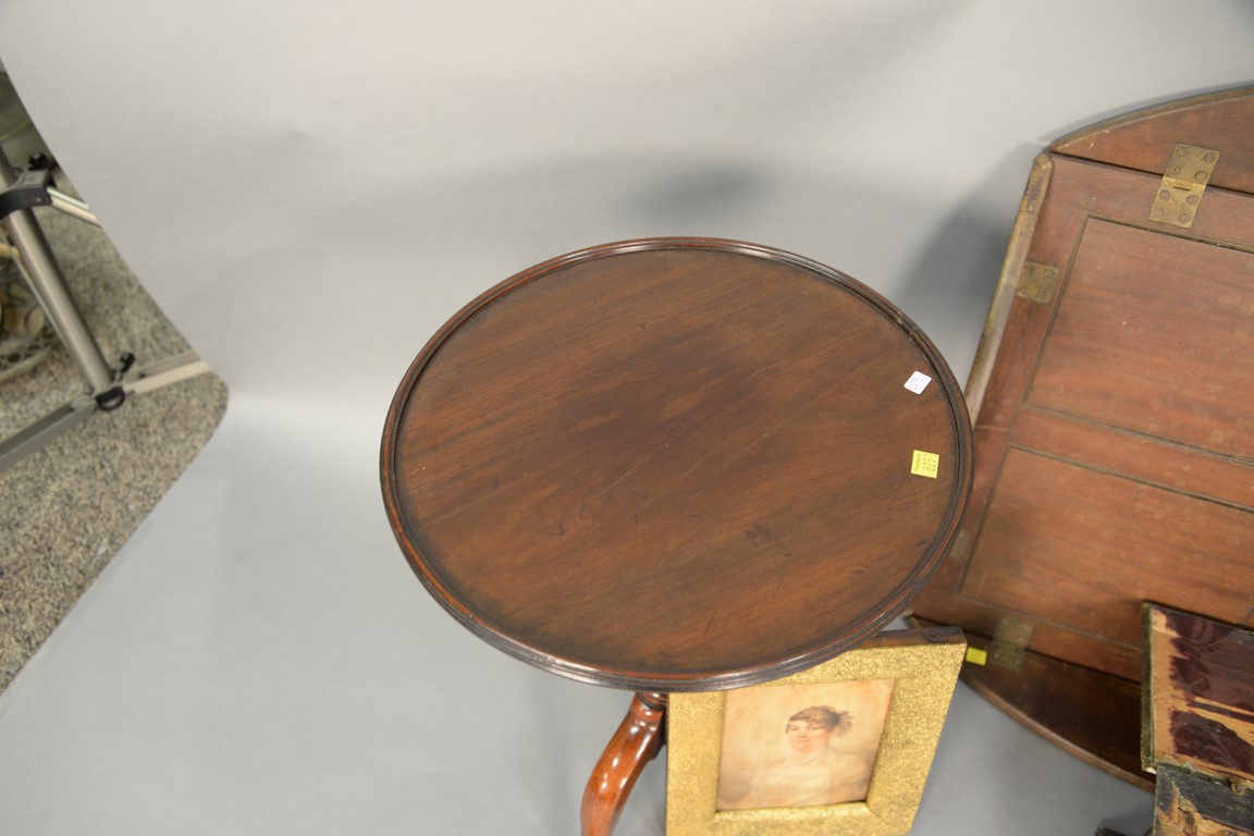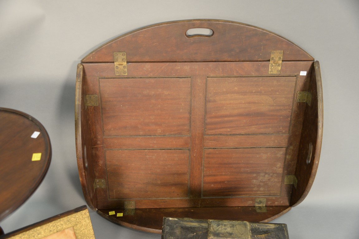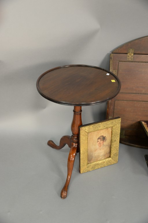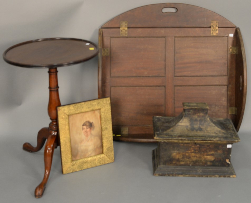 Four piece lot to include mahogany George III butler’s tray, George III mahogany stand with dish top, early wood money box, and small watercolor on paper of a woman 9 x 6 1/2.
