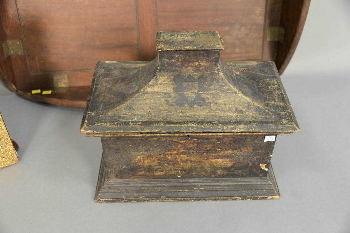 Lot 235C: Four piece lot to include mahogany George III butler’s tray, George III mahogany stand with dish top, early wood money box, and smal…