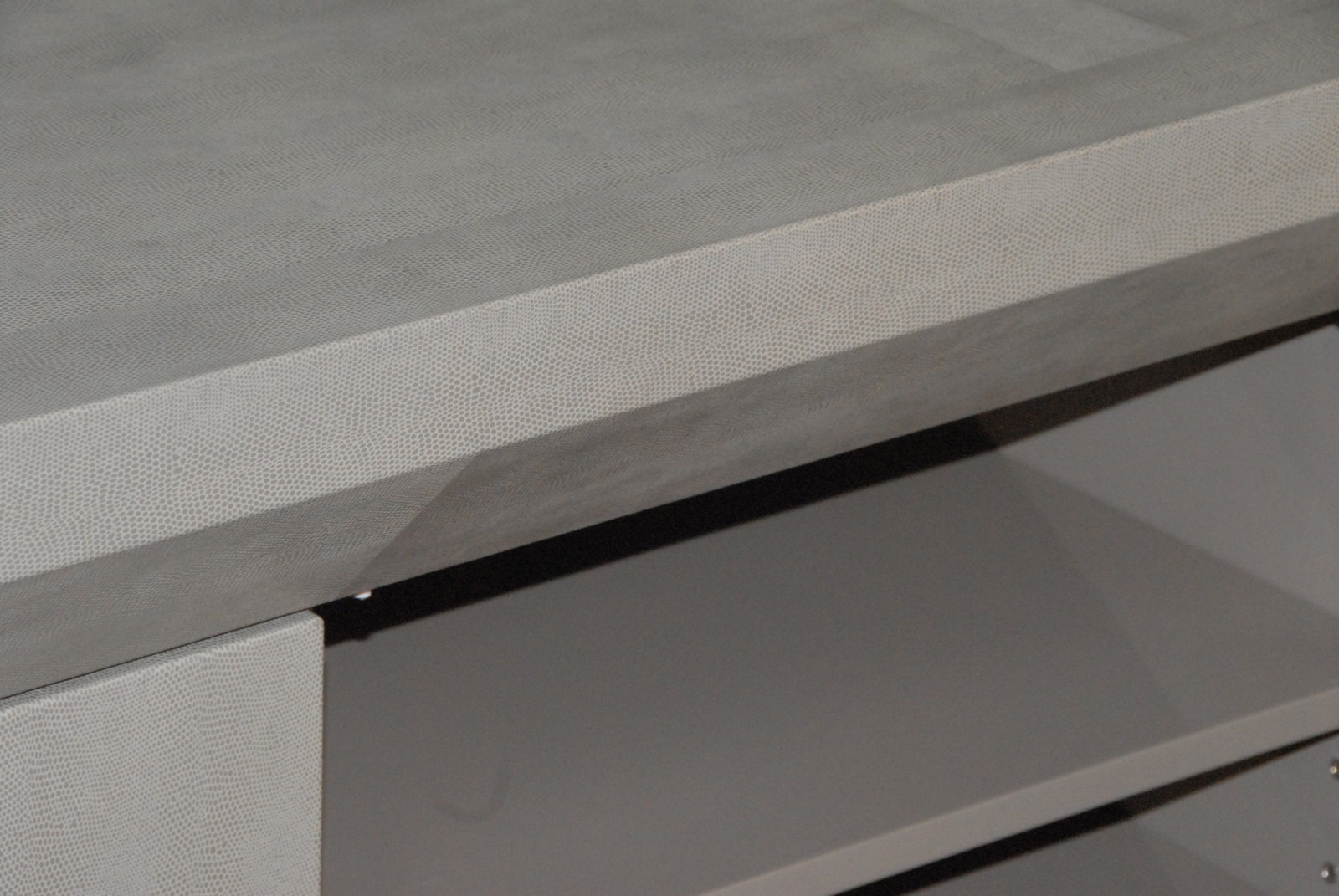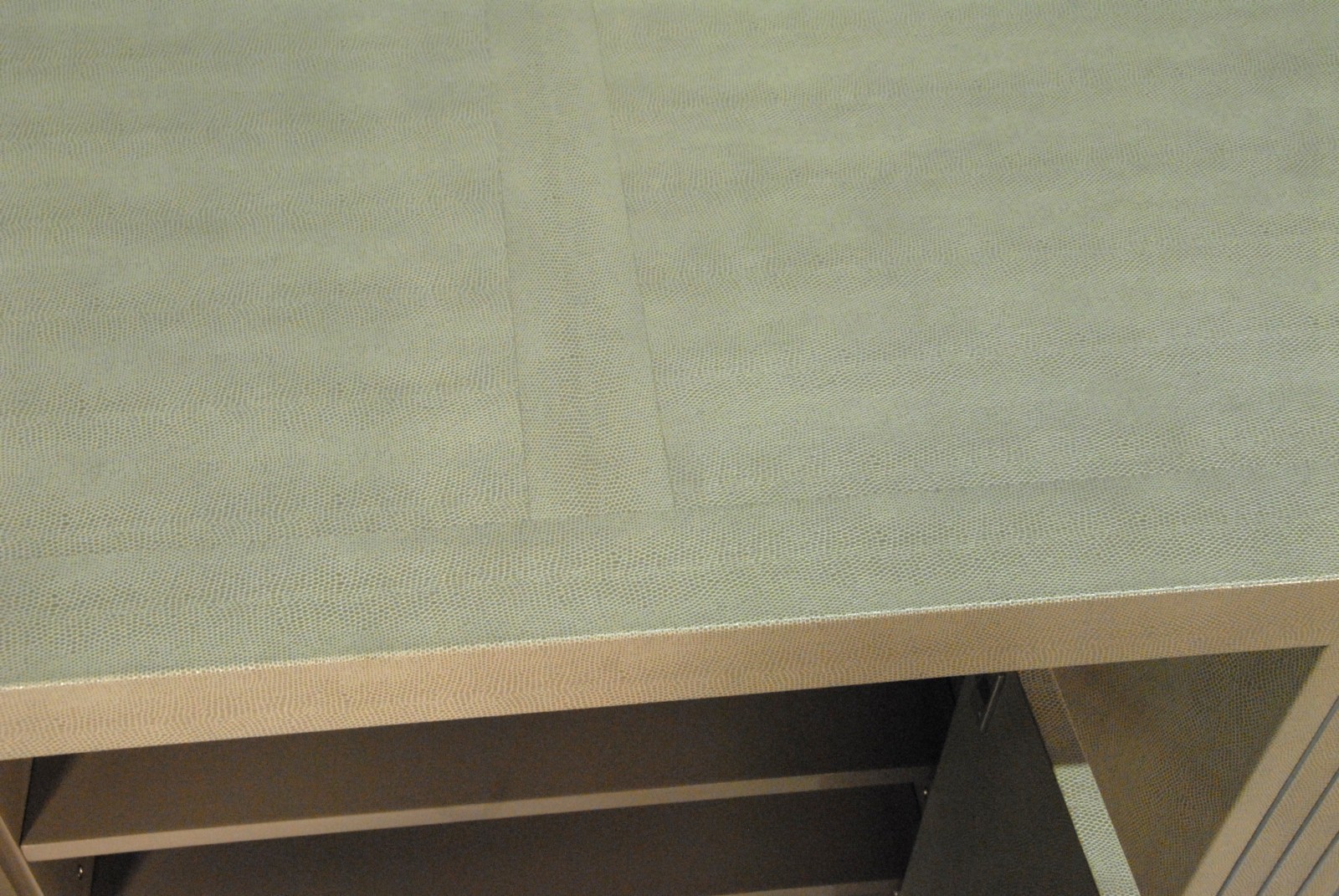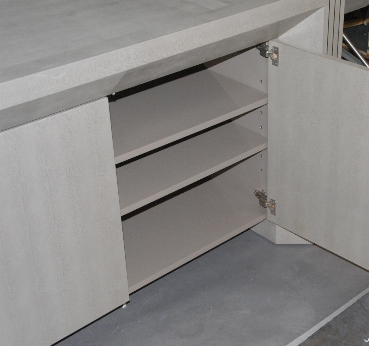 Karl Springer sideboard overall lizard veneer with two doors and shelves, signed Karl Springer. ht. 35in., wd. 84in., dp. 22in.