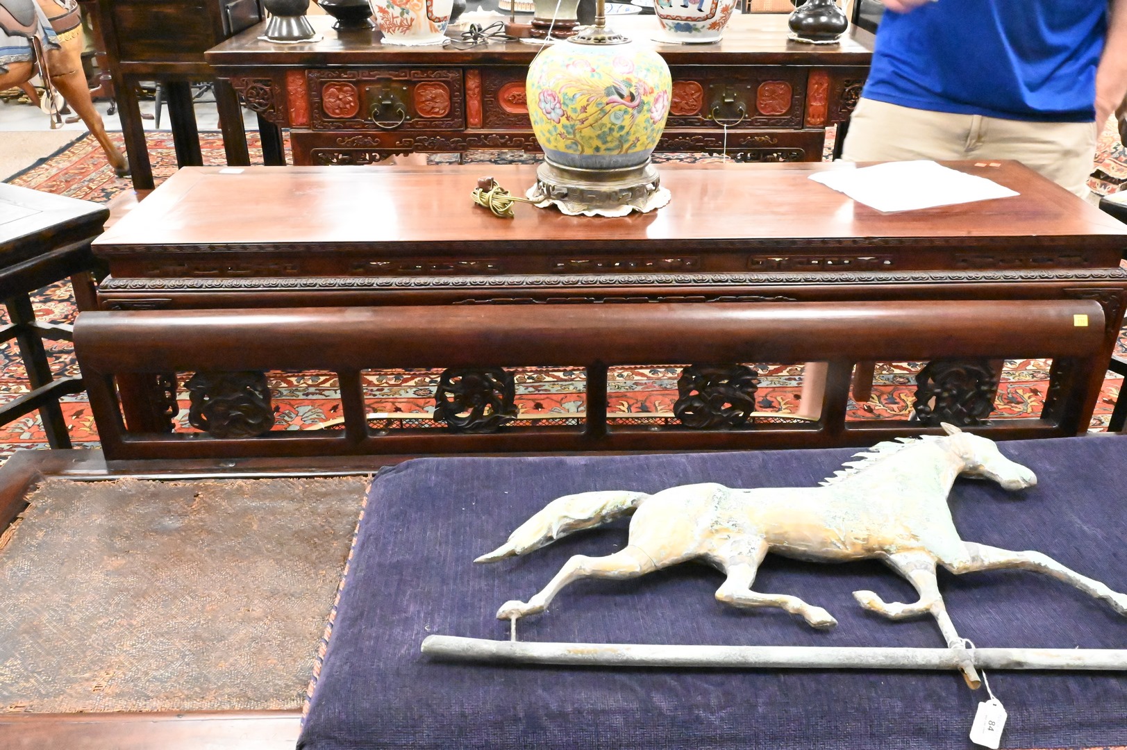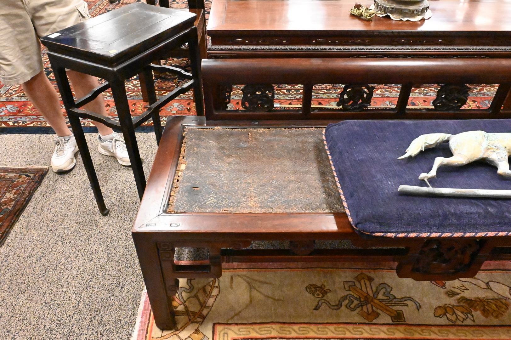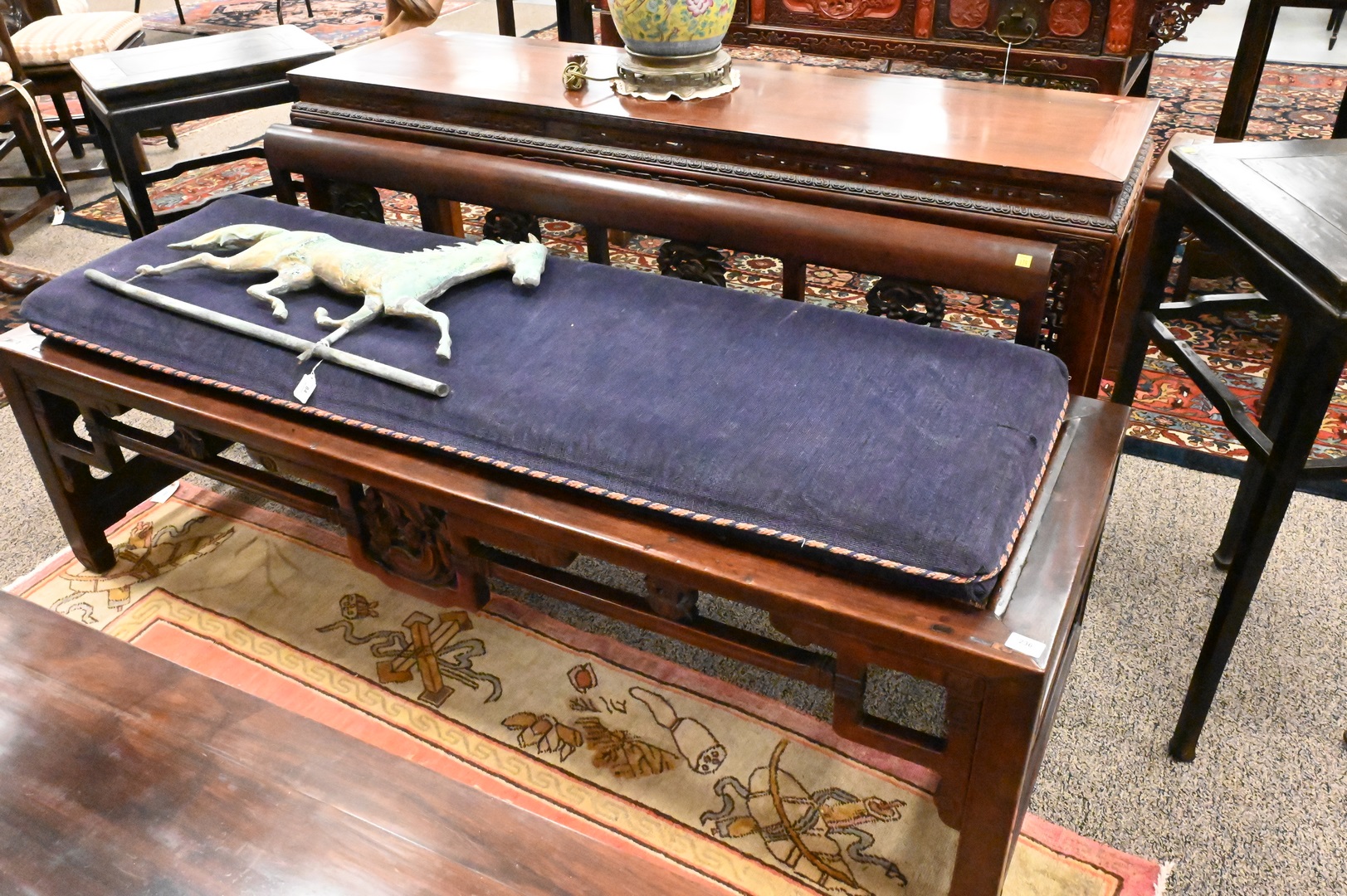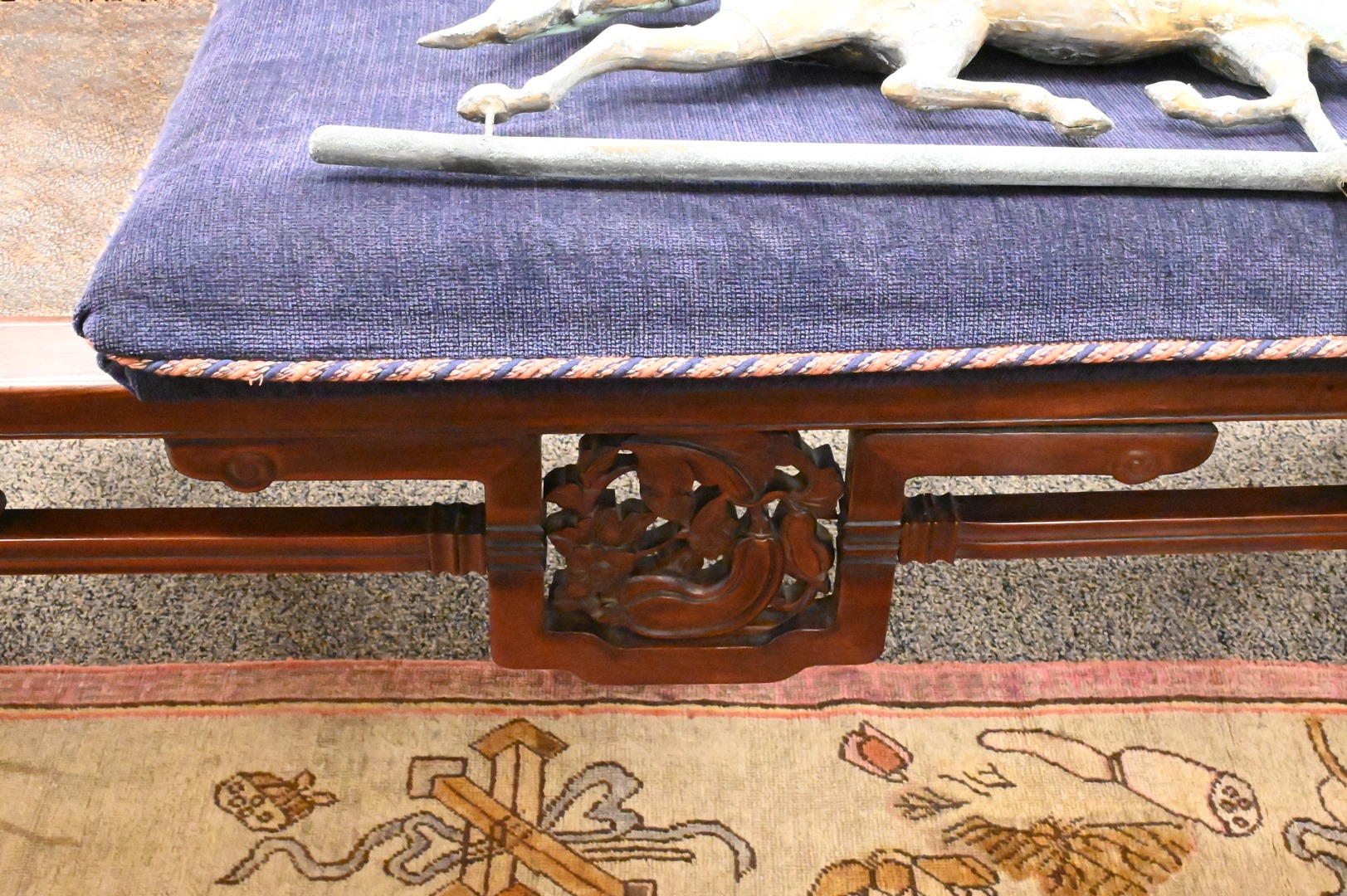 Chinese Hardwood Bench, having worn woven seat, now with custom cushion, set on square legs, height 29 1/2 inches, length 72 inches, depth 24 inches.