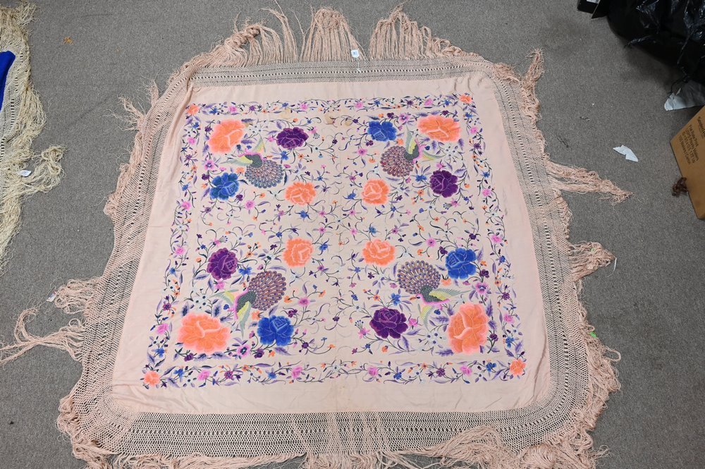 Lot 236: Chinese Silk Embroidered Piano Shawl, having embroidered peacocks and colorful flowers on pink ground, approximately 5′ x 5′.