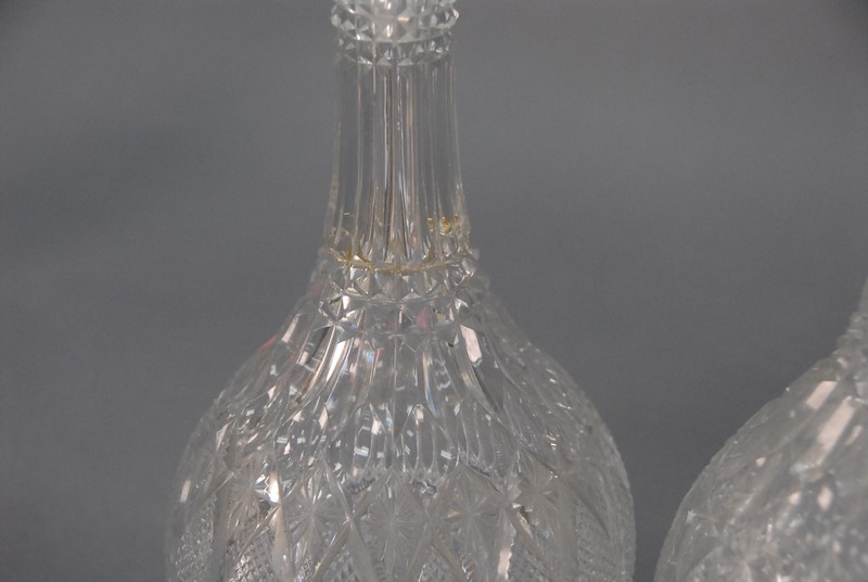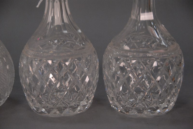 Four piece lot to include two pairs of cut crystal decanters with stoppers one repaired at neck. ht. 12 1/2in. and 13 1/2in.