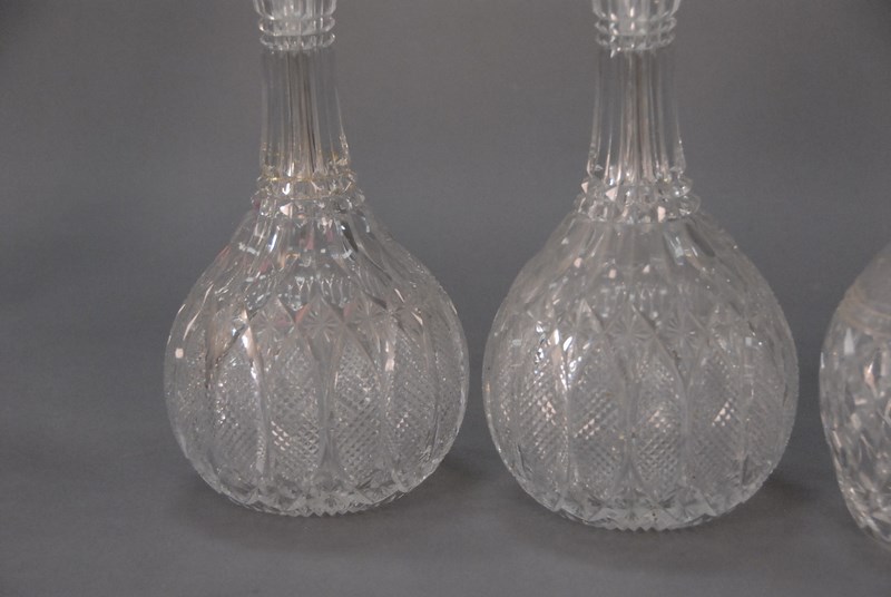Lot 236: Four piece lot to include two pairs of cut crystal decanters with stoppers one repaired at neck. ht. 12 1/2in. and 13 1/2in.