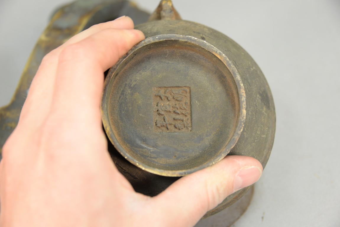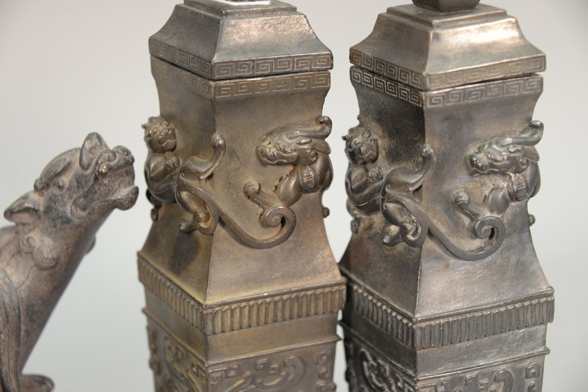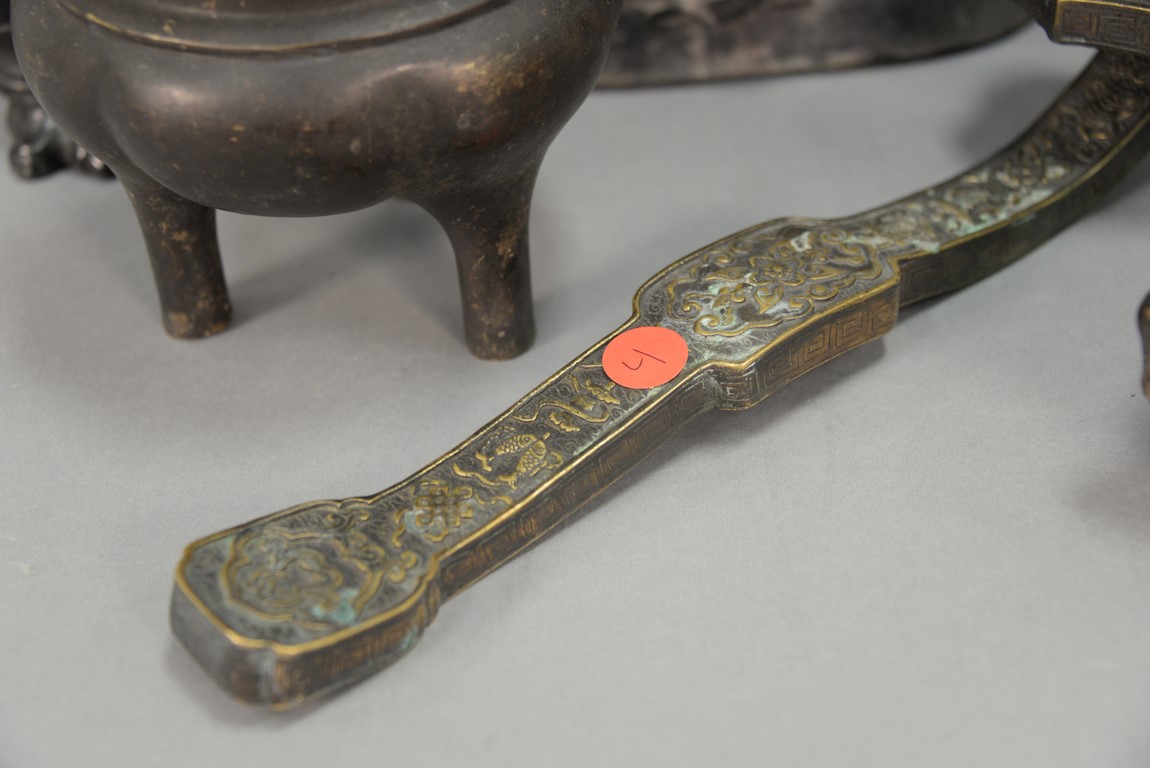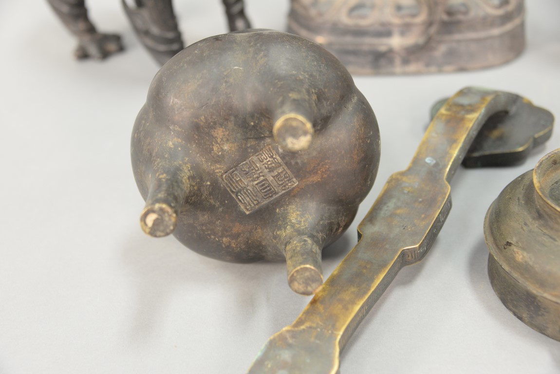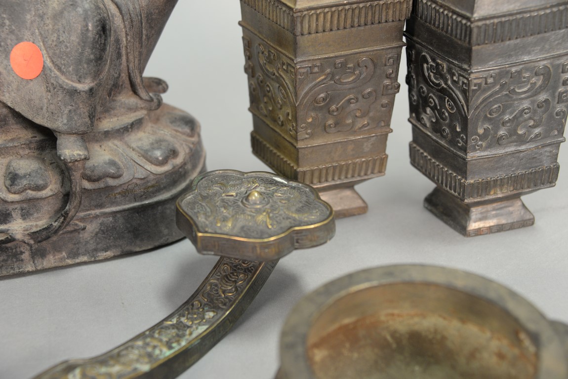 Lot 236: Group of seven Oriental bronze and iron pieces to include a pair of covered urns, a seated Guanyin, two bronze censors, bronze scept…