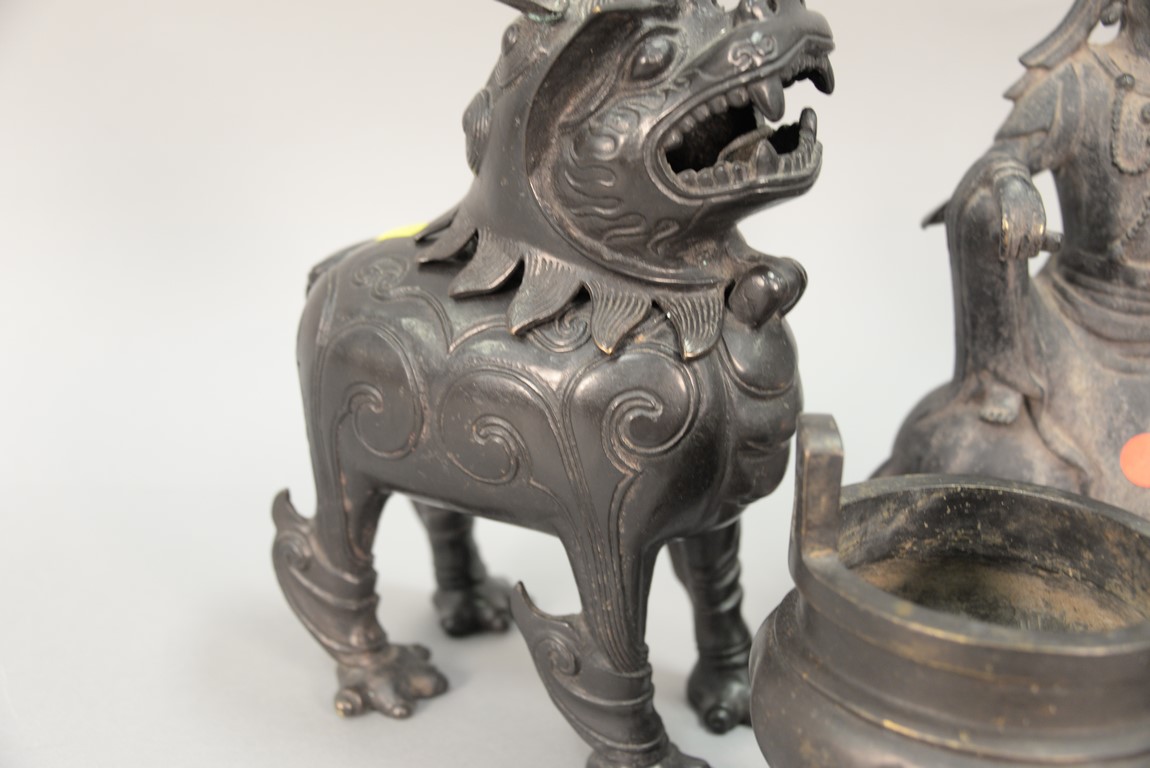 Group of seven Oriental bronze and iron pieces to include a pair of covered urns, a seated Guanyin, two bronze censors, bronze scepter, and a bronze foo dog. 2 1/2 in. to 14 in.