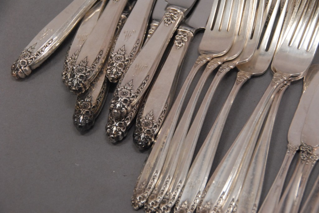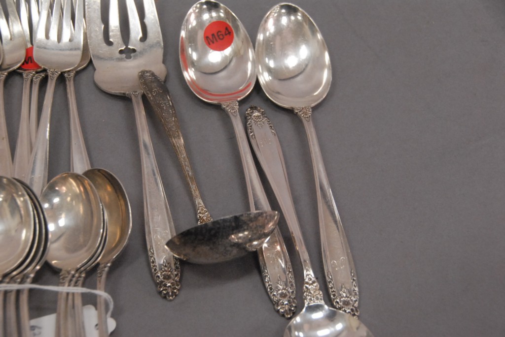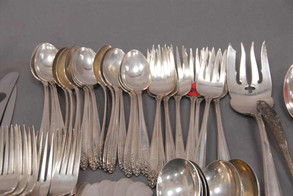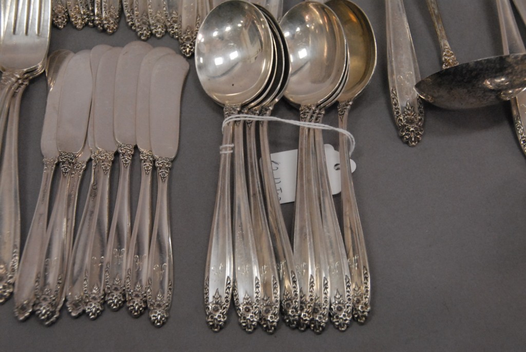 Lot 236: International Prelude pattern sterling silver flatware set, setting for eight, 62.1 troy ounces plus eight knife handles.