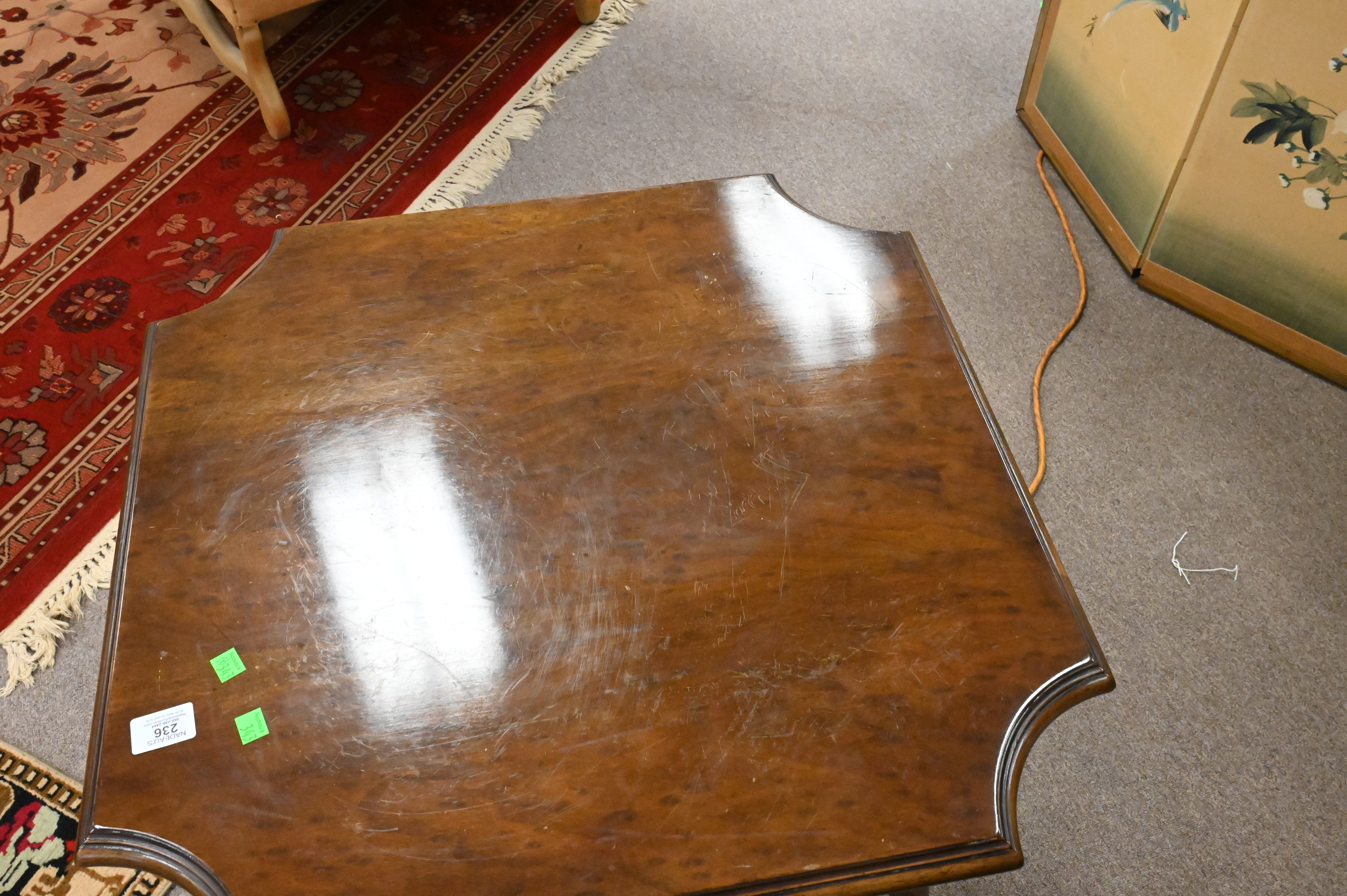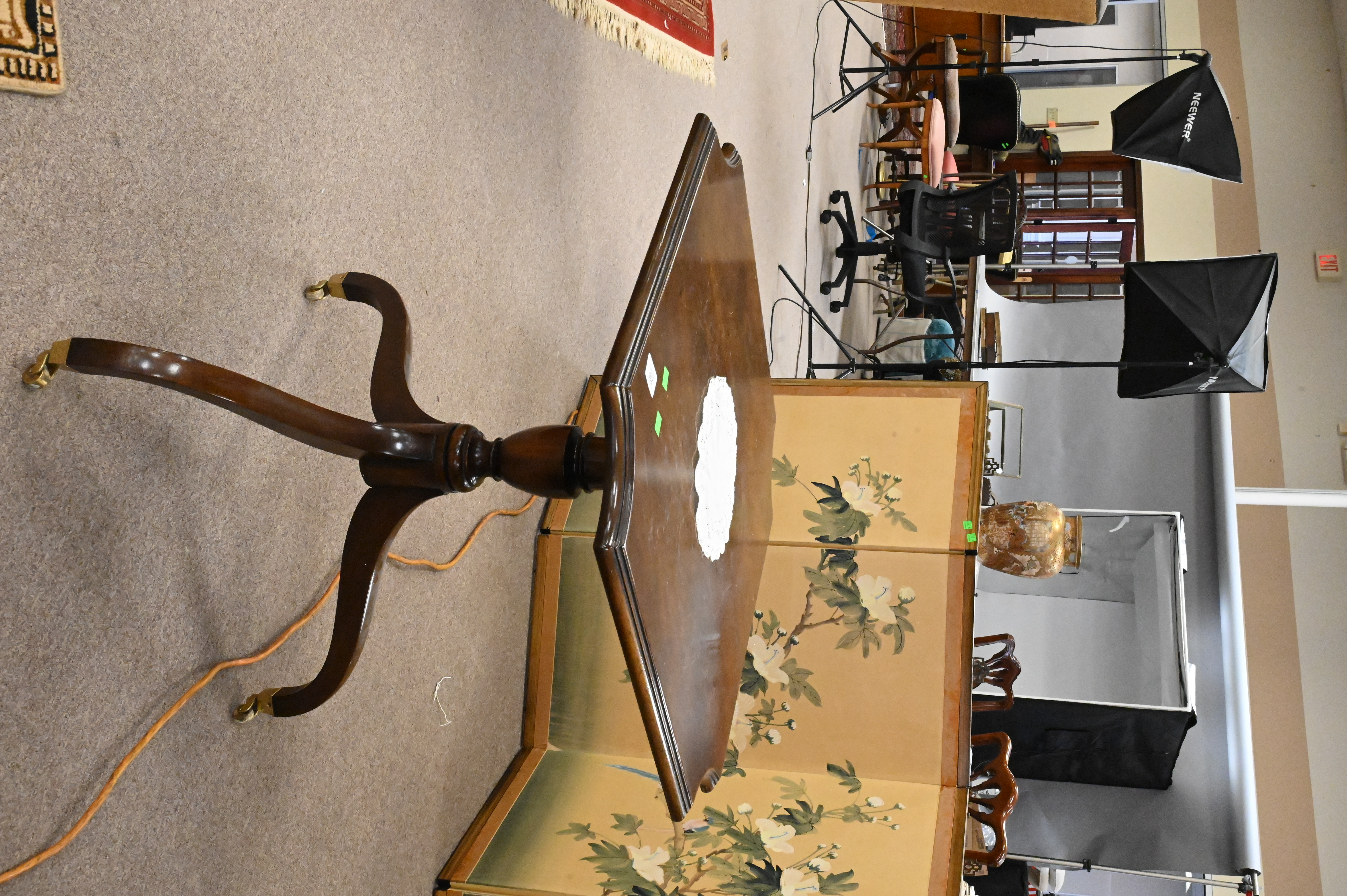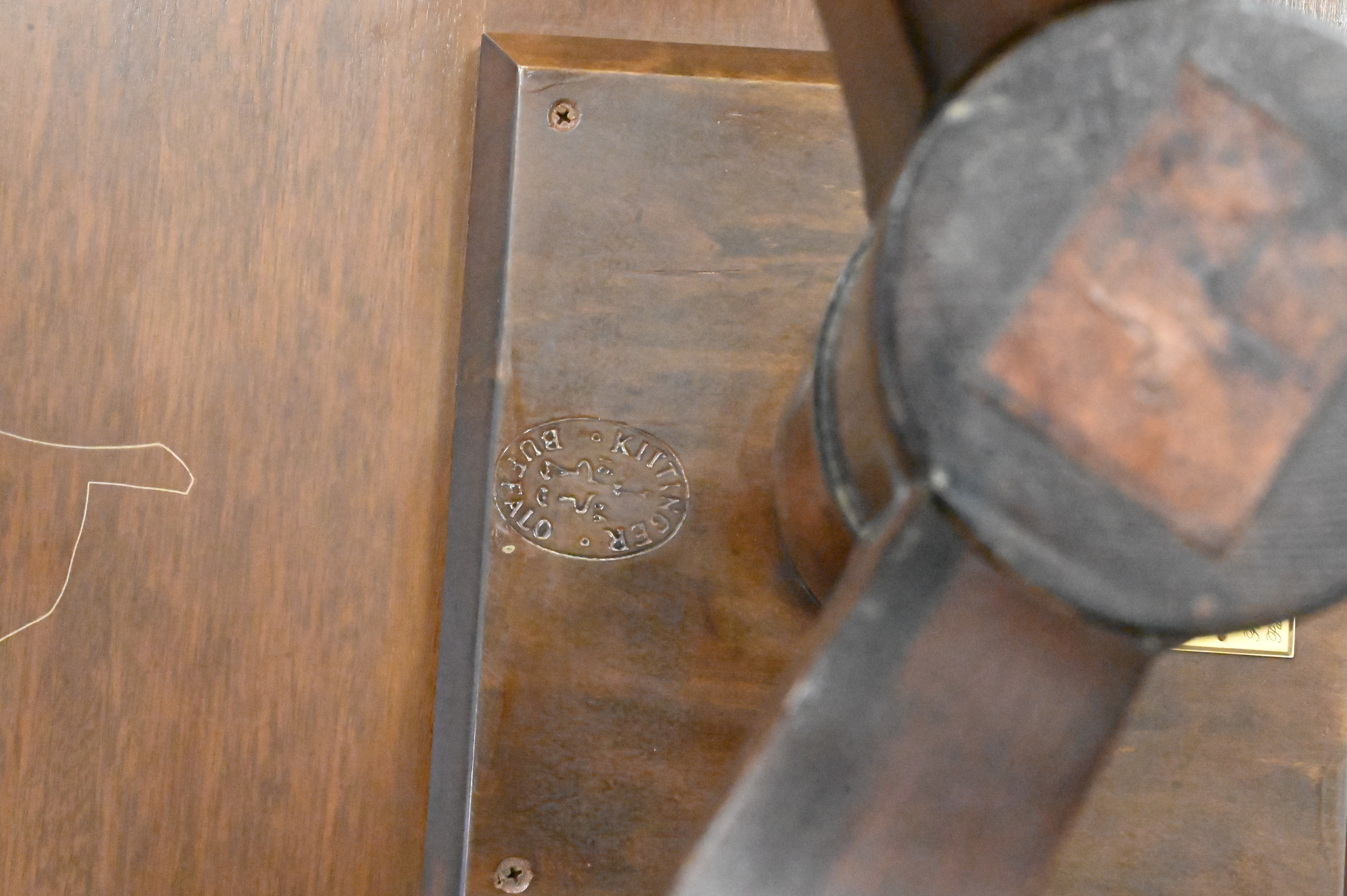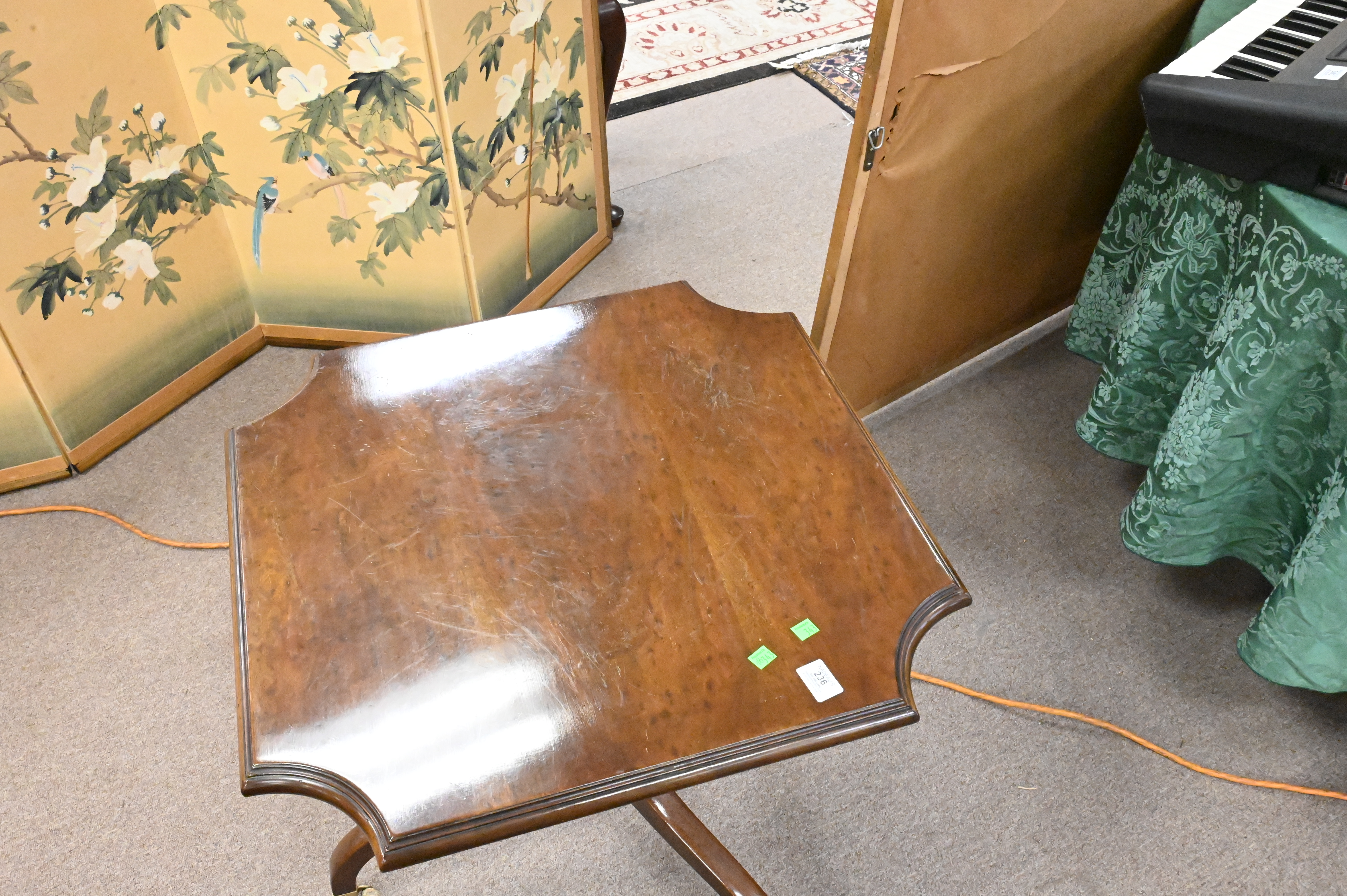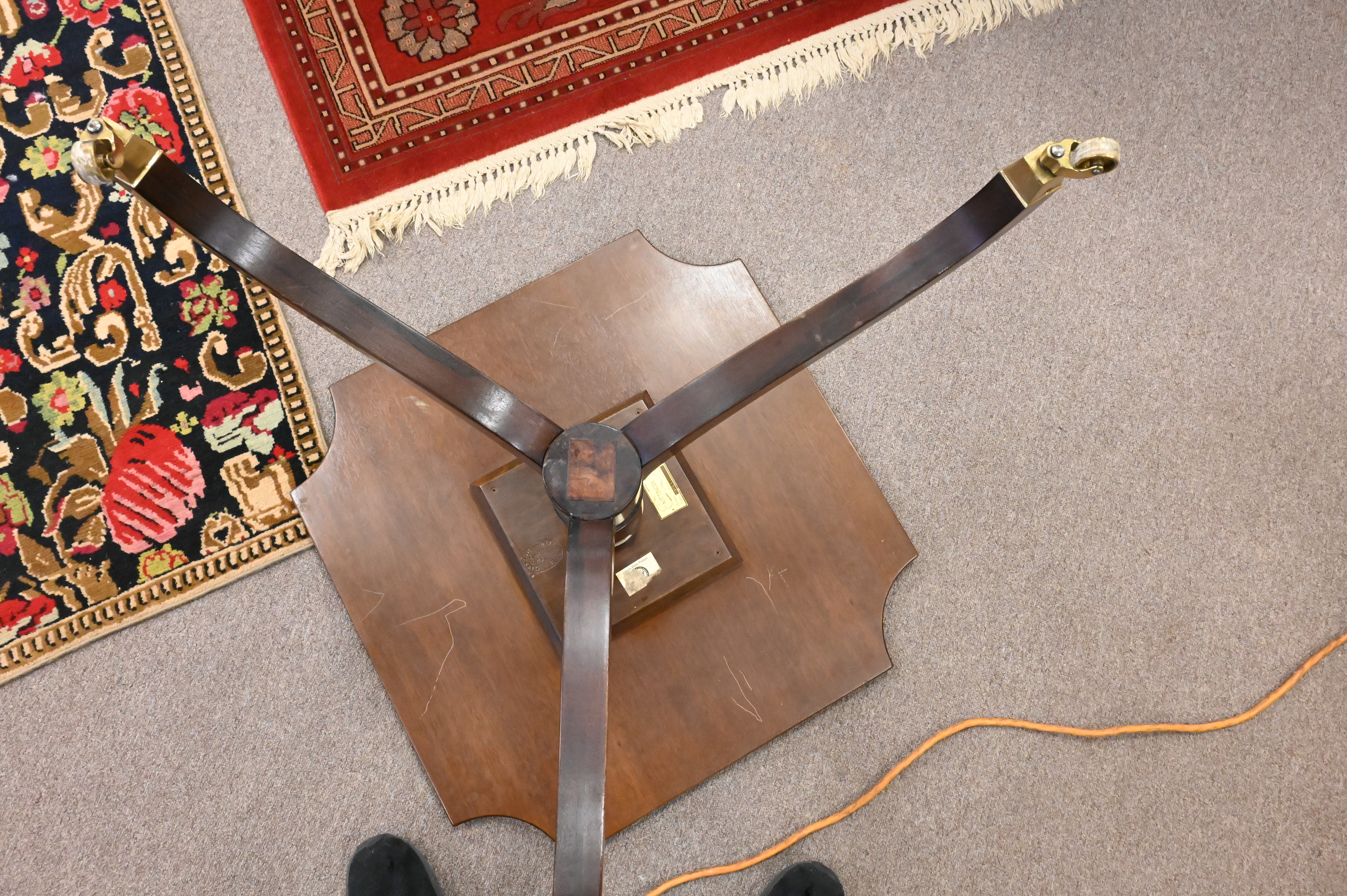 having cut corners and tripod base over brass casters