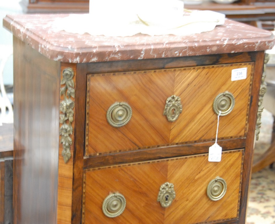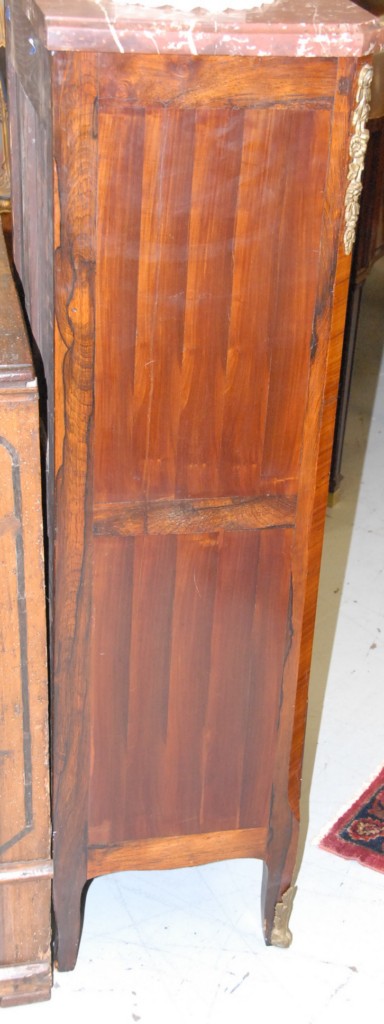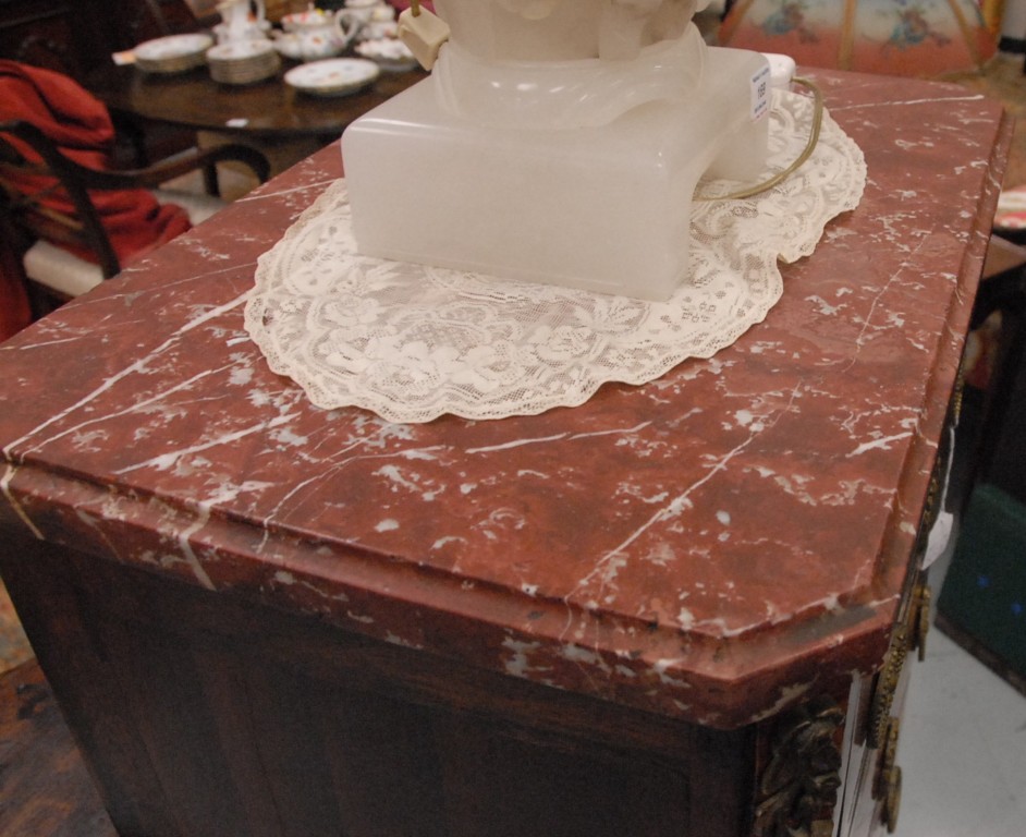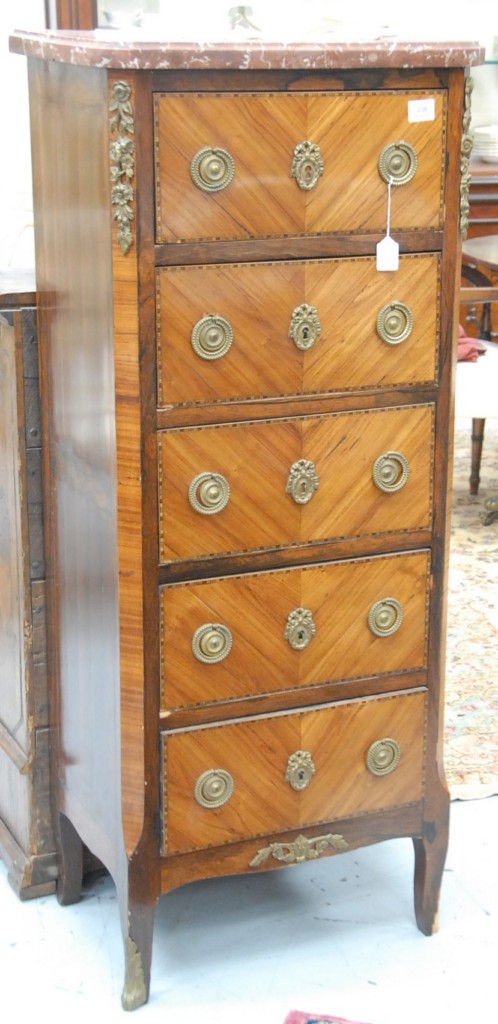 Louis XV style lingerie chest with rouge marble top and five drawers with bronze mounts, 19th century. height 50in. width 20in.