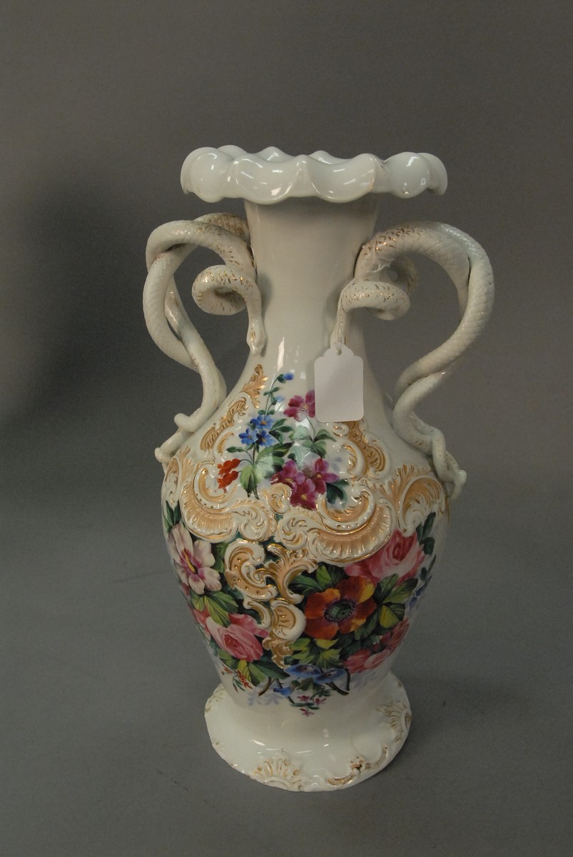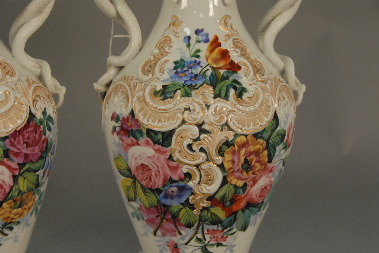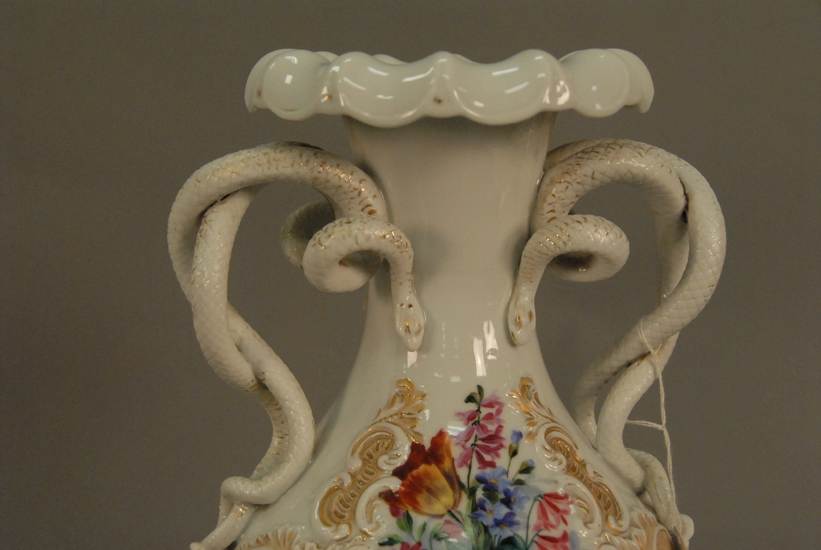 Lot 236: Pair of porcelain vases with entwined snake handles and hand painted flowers attributed to Dresden short hairline in base. ht. 15 1/2 in.