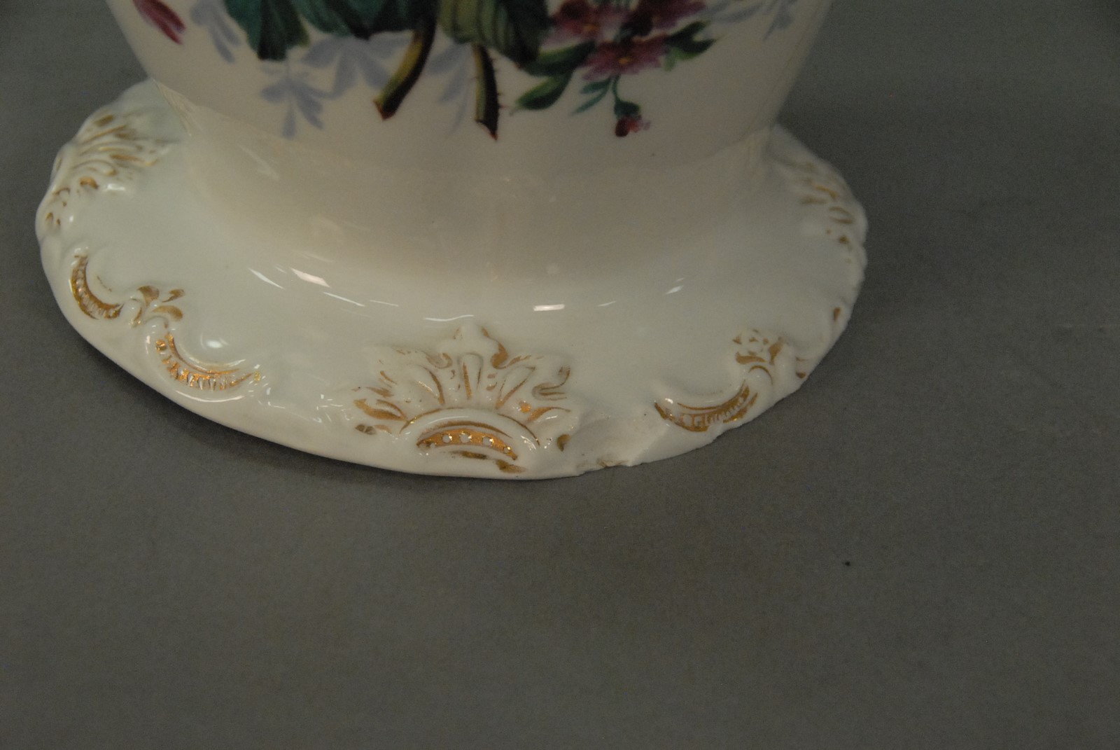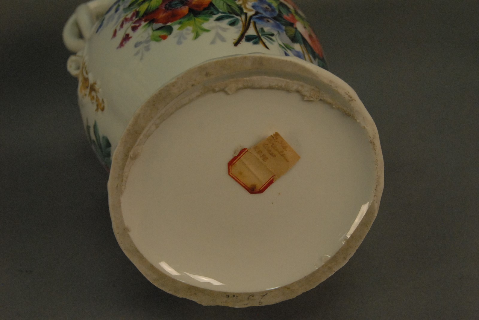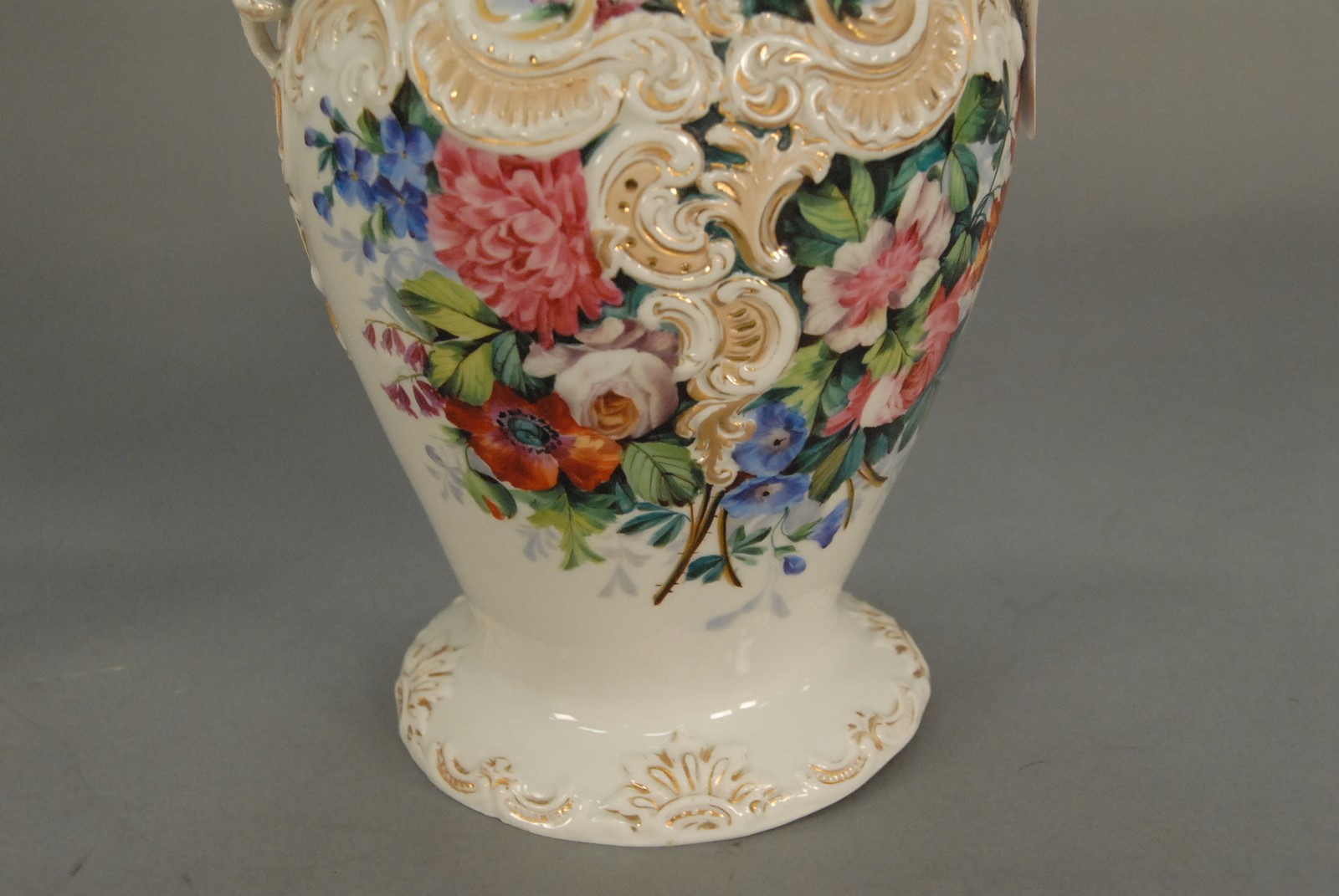 Lot 236: Pair of porcelain vases with entwined snake handles and hand painted flowers attributed to Dresden short hairline in base. ht. 15 1/2 in.