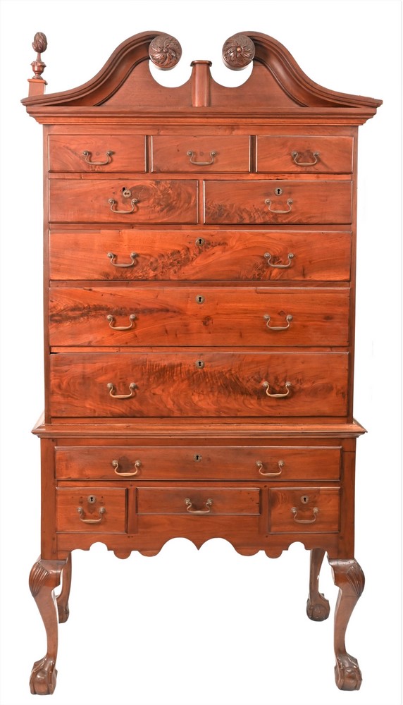 Lot 236: Pennsylvania Walnut Highboy having broken arch top over case of drawers set on lower section of four drawers on fan carved cabriole legs ending in ball and claw feet 18th century height 85 inches, case width 40 1/4 inches