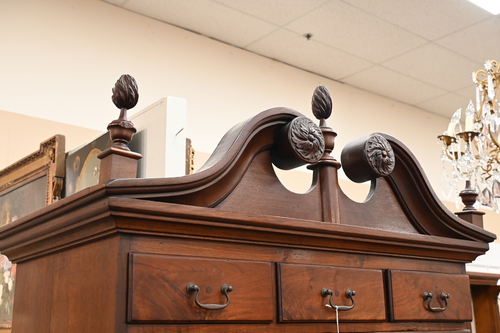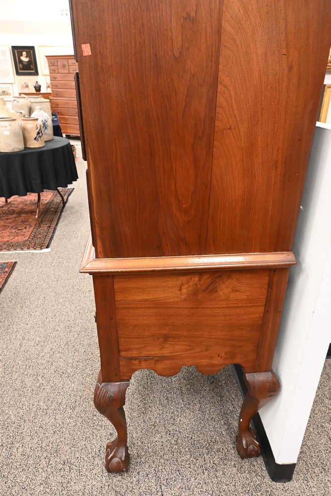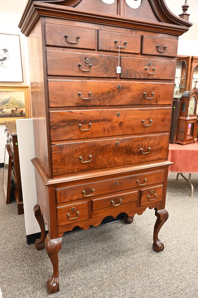 Lot 236: Pennsylvania Walnut Highboy having broken arch top over case of drawers set on lower section of four drawers on fan carved cabriole legs ending in ball and claw feet 18th century height 85 inches, case width 40 1/4 inches