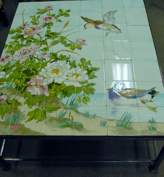Lot 236: Pictorial tile top table with polished steel base five cracked tiles, ht. 18 1/2in. top 42 x 36